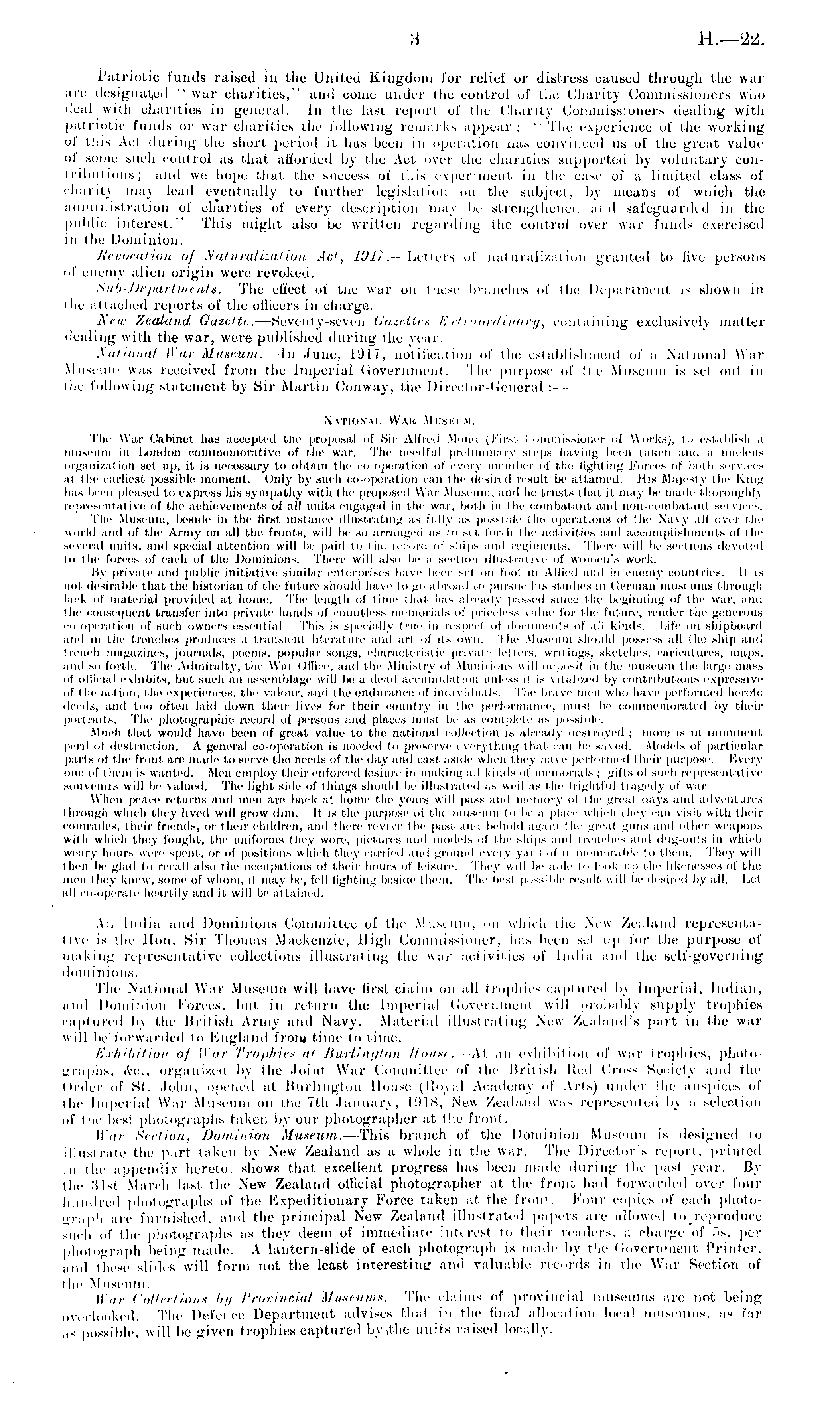 Patriotic funds raised ill the United Kingdom for relief or distress caused through the war are designated " war charities," and come Under the control of the Charity Commissioners who deal with charities in general. In the last report of the Charity Commissioners dealing with patriotic funds or war charities the following remarks appear : " The experience of the working of this Act during the short period it has been i n operation has convinced us of the great value of some such control as that afforded by the Act over the charities supported by voluntary contributions; and we hope that the success of this experiment in the case of a limited class of charity may lead eventually to further legislation on the subject, by means of which the administration of charities of every description may be strengthened and safeguarded in the public interest." This might also be written regarding the control over war funds exercised in the Dominion. Revocation of Naturalization Act, 1917. —Letters of naturalization granted to live persons of enemy alien origin were revoked. Sub-Departments.—The effect of the war on these branches of the Department is shown in the attached reports of the officers in charge. New Zealand Gazette.—Seventy-seven Gazettes Extraordinary, containing exclusively matter dealing with the war, were published during the year. National War Museum. —In June, 1917, notification of the establishment of a National War Museum was received from the Imperial Government. The purpose of the Museum is set out in the following statement by Sir Martin Conway, the Director-General: — National WAB MUSEUM. The War Cabinet lias accepted the proposal of Sir Alfred Mond (Firs! Oommissionoi' of Works), to establish a museum in London commomorative of the war. The needful preliminary steps having been taken and a nucleus organization set up, it is necessary to obtain the co-operation of every member of the lighting Forces of bulli sorvices at the earliest possible moment. Only by such co-operation can the desired result be attained. 11 is Majesty the King has been pleased to expross his sympathy with the proposed War Museum, and he trusts that it may be made thoroughly representative of the achievements of all units engaged in the war, both in the combatant and non-combatant services. The Museum, beside in the first instance illustrating as fully as possible the operations of the Navy all over the world and of the Army 011 all the fronts, will be so arranged as to set. forth the activities and accomplishments of the several units, and special attention will bo paid to the record of ships and regiments. There will be sections devoted to the forces of each of the Dominions. There will also be a section illustrative of women's work. By private and public initiative similar enterprises have been set on foot in Allied and in enemy countries. It is not desirable that the historian of the future should have to go abroad to pursue his studies in German museums through lack of material provided at home. The length of time that has already passed since the beginning of the war, and the consequent transfer into private hands of countless memorials of priceless value for the future, render the generous co-operation of such owners essential. This is specially true in respect of documents of all kinds. Life on shipboard and in the trenches produces a transient literature and art of its own. The Museum should possess all the ship and trench magazines, journals, poems, popular songs, characteristic private letters, writings, sketches, caricatures, maps, and so forth. The Admiralty, the War Office, and the Ministry of Munitions will deposit in the museum the large mass of official exhibits, but such an assemblage will be a dead accumulation unless it is vitalized by contributions expressive of the action, the experiences, the valour, and the endurance of individuals. The brave men who have performed heroic deeds, and too often laid down their lives for their country in the performance, must be commemorated by their portraits. The photographic record of persons and places must be as complete as possible. Much that would have been of great value to the national collection is already destroyed; more is m imminent peril of destruction. A general co-operation is needed to preserve everything that can be saved. Models of particular parts of the front are made to serve the needs of the day and cast aside when they have performed their purpose. Every one of them is wanted. Men employ their enforced lesiure in making all kinds of memorials ; gifts of such representative souvenirs will be valued. The light side of things should bo illustrated as well as the frightful tragedy of war. When peace returns and men are back at home the years will pass and memory of the great days and adventures through which they lived will grow dim. It is the purpose of the museum to be a place which they can visit with their comrades, their friends, or their children, and there revive the past and behold again the great guns and other weapons with which they fought, the uniforms they wore, pictures and models of the ships and trenches and dug-outs in which weary hours woro spent, or of positions which they carried ami ground every yard of it memorable to them. They will then be glad to recall also the occupations of their hours of leisure. They will be able to look up the likenesses of the men they knew, some of whom, it may be, fell lighting beside them. The bust possible result will be desired by all. Let all co-operate heartily and it will bo attained. All India and Dominions Committee of the Museum, 011 which the New Zealand representative is the Hon. Sir Thomas Mackenzie, High Commissioner, lias been set up for the purpose of making representative collections illustrating the war activities of India and the self-governing dominions. The National War Museum will have first claim 011 all trophies captured by Imperial, Indian, and Domin