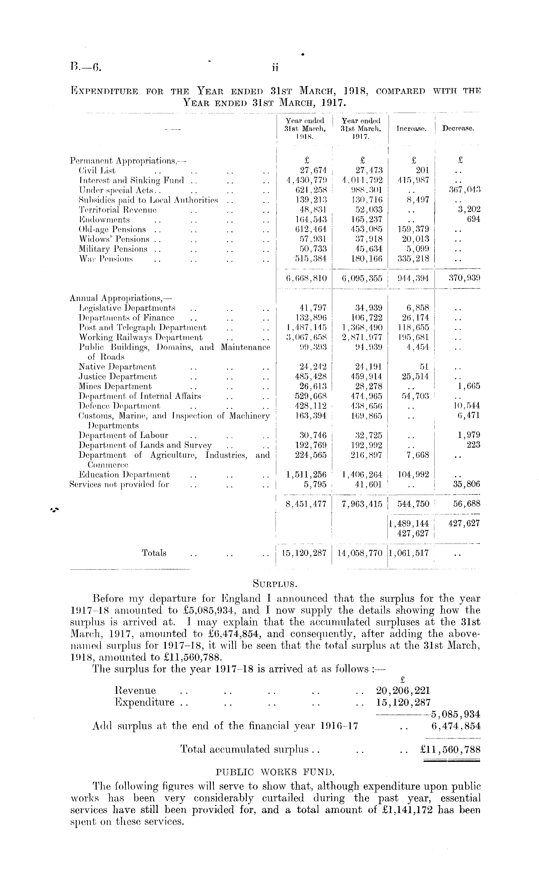 Surplus. Before ray departure for England I announced that the surplus for the year 1917-18 amounted to £5,085,934, and I now supply the details showing how the surplus is arrived at. 1 may explain that the accumulated surpluses at the 31st March, 1917, amounted to £6,474,854, and consequently, after adding the abovenamed surplus for 1917-18, it will be seen that the total surplus at the 31st March, 1918, amounted to £11,560,788. The surplus for the year 1917-18 is arrived at as follows : — £ Revenue .. .. .. .. .. 20,206,221 Expenditure.. .. .. .. ..15,120,287 -5,085,934 Add surplus at the end of the financial year 1916-17 . . 6,474,854 Total accumulated surplus .. .. .. £11,560,788 PUBLIC WORKS FUND. The following figures will serve to show that, although expenditure upon public works has been very considerably curtailed during the past year, essential services have still been provided for, and a total amount of £1,141,172 has been spent on these services.
