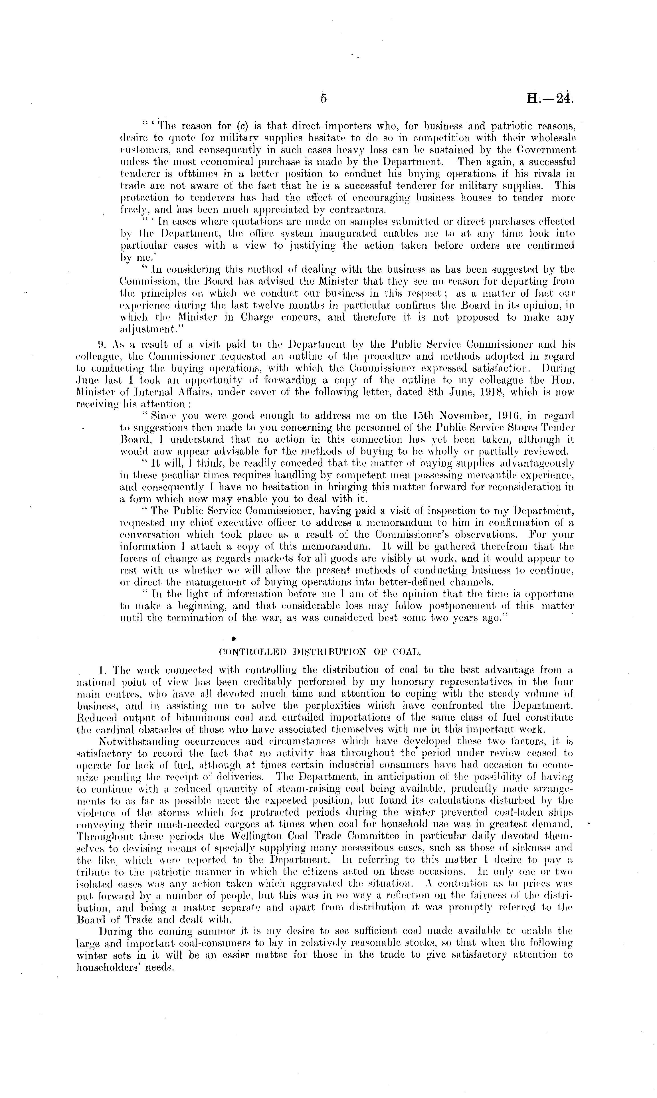 ' The' reason for (c) is that direct importers who, for business and patriotic reasons, desire to quote for military supplies hesitate ter do so in competition with their wholesale customers, and consequently in such cases heavy loss can be sustained by the Government unless the most economical purchase is made' by the Department. Them again, a successful tenderer is ofttimes in a better position to e-erneluct his buying operations if his rivals in trade are not aware of the fact that he is a successful tenderer ferr military supplies. This protection to tenderers has had the effect of encouraging business houses to tender more freely, anel has been much appreciated by contractors. " ' In cases where quotations are made on samples submitted or direct purchases effected by the Department, the office system inaugurated enables me to at any time look into particular cases with a view to justifying the action taken before orders are- confirmed by me." " In considering this method of dealing with the business as has been suggested by the, Commission, the Board has advised the Minister that they see no reason for departing from the principles on which we conduct our business in this respect; us a matter of fact our experience during the last twelve months in particular confirms the Board in its opinion, in which the Minister in Charge' concurs, and therefore it is not proposed to make any adjustment." 9. As a result erf a visit, paiel ter the Department by the Public Service Commissioner and, his colleague, the' Commissioner requested an outline of the procedure and methods adopted in regard to conducting the buying operations, with which the' Commissioner expressed satisfaction. During June last I tererk an opportunity erf forwarding a copy <>l the outline to my colleague the Hon. Minister of Internal Affairs; under ererver of the following letter, dated Bth June, 1918, which is now receiving his attention : "Since you were good enough to address me on the 15th November, 19.10, in regard to suggestions then made to you concerning the' personnel of the Public Service Stores Tender Board, 1 understand that no action in this connection has vet brum taken, although it wertild now appeal' advisable for' the methods erf buying ter lie wholly or partially reviewed. " It will, I think', be readily conceded that the' matter erf buying supplies advantageously in these peculiar times requires handling by competent men possessing mercantile experience, and consequently I have ncr hesitation in bringing this matter forward for reconsideration in a form which now may enable you to deal with it. " The Public Service Commissioner, having paiel a visit of inspection to my Department, requested my chief executive officrer to address a, memorandum to him in confirmation of a conversation which took place as a result of the Commissioner's observations. For your information 1 attach a copy erf this memorandum, ft will be gathered therefrom that the forces of change as regards markets for all goods are visibly at work, and it would appear to rest with us whether we will allow the' present methods of conducting business to continue, or direct the management erf buying operations into better-defined channels. " In the' light of information before rue I am erf the opinion that the' time is opportune ter make a beginning, anel that considerable loss may follow postponement erf this matter until the termination erf the war, as was considered best some two years ago." . » CONTROLLED DISTRIBUTION OK COAL. I. 'flic work connected with controlling the distribution of e-eral ter the best advantage from a national point of view has been creditably performed by my honorary representatives in the' four main centres, who have' all devoted much time anil attention to cerping with tire steady volume of business, anel in assisting irrer to solve' the' perplexities which have confronted the Department. Reduced output erf bituminous coal and curtailed importations of the same class erf fuel constitute (her cardinal obstacles erf those who have associated themselves with mc in this important work. Notwithstanding (recurrences and circumstances which have developed these two factors, it is satisfactory to ree-errel the fact that ncr activity has throughout the period under review ceased lei operate for lack of fuel, although at, times certain industrial consumers have had occasion to ccer.noinize pending the receipt of deliveries. The Department, in anticipation of the possibility of having to continue with a reduced quantity of steam-raising coal being available, prudently made arrangements to as far as possible meet the- expected position, but found its calculations disturbed by the; violence of the' storms which for- protracted periods during the winter prevented coal-laden ships conveying their much-needed cargoes at times when coal lor household use was in greatest demand. Throughout these periods the Wellington Coal Trade Committee in particular daily devoted themselves ter devising means of specially supplying many necessitous cases, such as those of sickness arid (her like, which were reported to the Department. In referring to this matter I desire to pay a tribute to the' patriotic manner in which the citizens acted on these occasions. In only one or two isolated cases was any action taken which aggravated the situation. A contention as to prices was put forward by a number of people, but this was in no way a reflection on the fairness of I he distribution, and being a matter separate anel aparl from distribution it was promptly referred to the' Board of Trade and dealt with. During the coining summer it is my desire to sec sufficient coal made available to enable the larger and important coal-consumers to lay in relatively reasonable stocks, so that when the following winter sets in it will be an easier matter for those in the trade ter give satisfactory attention to householders' needs.