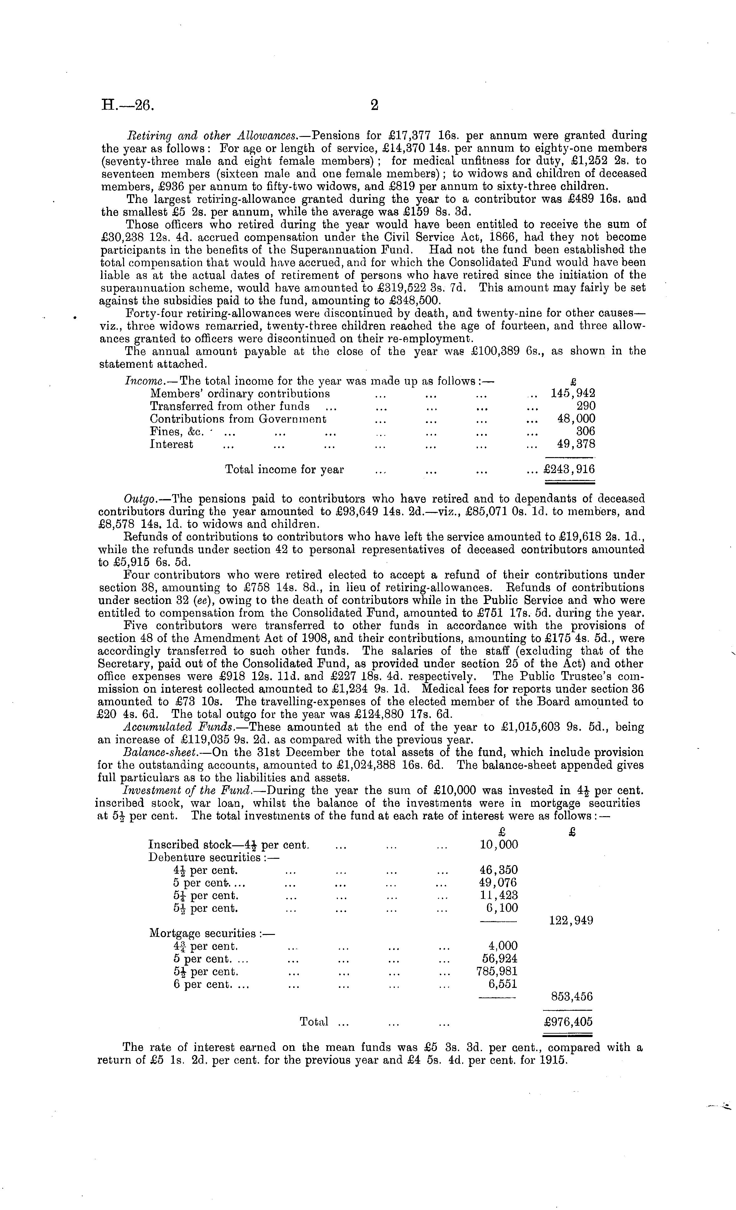 Betiring and other Allowances. —Pensions for £17,377 16s. per annum were granted during the year as follows : For age or length of service, £14,370 14s. per annum to eighty-one members (seventy-three male and eight female members) ; for medical unfitness for duty, £1,252 2s. to seventeen members (sixteen male and one female members); to widows and children of deceased members, £936 per annum to fifty-two widows, and £819 per annum to sixty-three children. The largest retiring-allowance granted during the year to a contributor was £489 16s. and the smallest £5 2s. per annum, while the average was £159 Bs. 3d. Those officers who retired during the year would have been entitled to receive the sum of £30,238 12s. 4d. accrued compensation under the Civil Service Act, 1866, had they not become participants in the benefits of the Superannuation Fund. Had not tho fund been established the total compensation that would have accrued, and for which the Consolidated Fund would have been liable as at the actual dates of retirement of persons who have retired since the initiation of the superannuation scheme, would have amounted to £319,522 3s. 7d. This amount may fairly be set against the subsidies paid to the fund, amounting to £348,500. Forty-four retiring-allowances were discontinued by death, and twenty-nine for other causes— viz., three widows remarried, twenty-three children reached the age of fourteen, and three allowances granted to officers were discontinued on their re-employment. The annual amount payable at the close of the year was £100,389 65., as shown in the statement attached. Income. —The total income for the year was made up as follows : — £ Members' ordinary contributions ... ... ... ... 145,942 Transferred from other funds ... ... ... ... ... 290 Contributions from Government ... ... ... ... 48,000 Fines, &c. • ... ... ... ... ... ... ... 306 Interest ... ... ... ... ... ... ... 49,378 Total income for year ... ... ... ...£243,916 Outgo. —The pensions paid to contributors who have retired and to dependants of deceased contributors during the year amounted to £93,649 14s. 2d. —viz., £85,071 os. Id. to members, and £8,578 14s. Id. to widows and children. Refunds of contributions to contributors who have left the service amounted to £19,618 2s. Id., while the refunds under section 42 to personal representatives of deceased contributors amounted to £5,915 6s. sd. Four contributors who were retired elected to accept a refund of their contributions under section 38, amounting to £758 14s. Bd., in lieu of retiring-allowances. Refunds of contributions under section 32 (cc), owing to the death of contributors while in the Public Service and who were entitled to compensation from the Consolidated Fund, amounted to £751 17s. sd. during the year. Five contributors were transferred to other funds in accordance with the provisions of section 48 of the Amendment Act of 1908, and their contributions, amounting to £175 4s. 5d., were accordingly transferred to such other funds. The salaries of the staff (excluding that of the Secretary, paid out of the Consolidated Fund, as provided under section 25 of the Act) and other office expenses were £918 12s. lid. and £227 18s. 4d. respectively. The Public Trustee's commission on interest collected amounted to £1,234 9s. Id. Medical fees for reports under section 36 amounted to £73 10s. The travelling-expenses of the elected member of the Board amounted to £20 4s. 6d. The total outgo for the year was £124,880 17s. 6d. Accumitlated Funds. —These amounted at the end of the year to £1,015,603 9s. 5d., being an increase of £119,035 9s. 2d. as compared with the previous year. Balance-sheet. —On the 31st December the total assets of the fund, which include provision for the outstanding accounts, amounted to £1,024,388 16s. 6d. The balance-sheet appended gives full particulars as to the liabilities and assets. Investment of the Fund. —During the year the sum of £10,000 was invested in 4£ per cent, inscribed stock, war loan, whilst the balance of the investments were in mortgage securities at 51 per cent. The total investments of the fund at each rate of interest were as follows : — £ £ Inscribed stock—4J per cent, ... ... ... 10,000 Debenture securities: — 4i per cent. ... ... ... ... 46,350 5 per cent.... ... ... ... ... 49,076 5J per cent. ... ... ... ... 11,423 per cent. ... ... ... ... 6,100 122,949 Mortgage securities : — 4J per cent. ... ... ... ... 4,000 5 per cent. ... ... ... ... ... 56,924 5J per cent. ... ... ... ... 785,981 6 per cent. ... ... ... ... ... 6,551 853,456 Total ... ... ... £976,405 The rate of interest earned on the mean funds was £5 3s. 3d. per cent., compared with a return of £5 Is. 2d. per cent, for the previous year and £4 ss. 4d. per cent, for 1915.