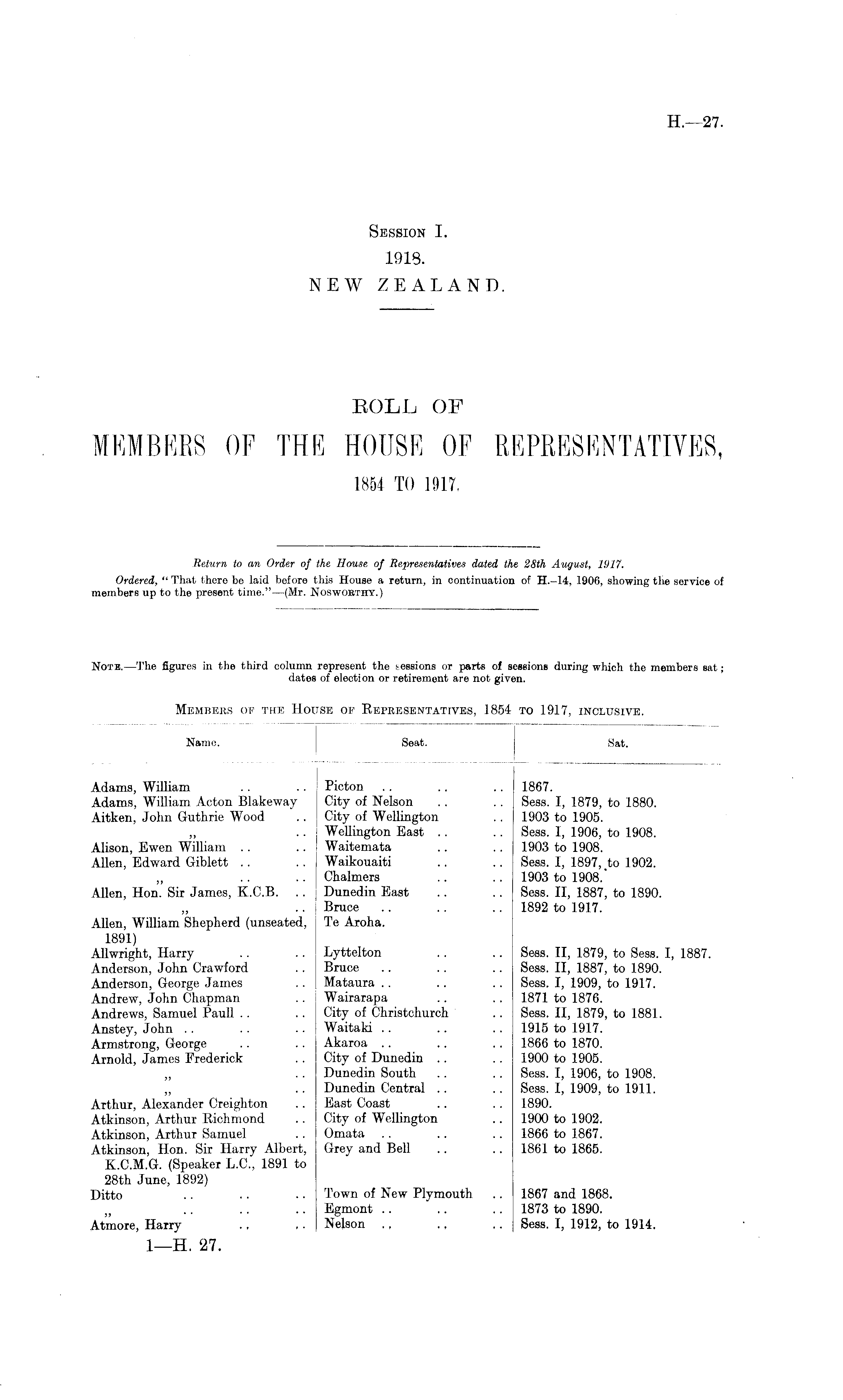 Name. Seat. Sat. Adams, William Adams, William Acton Blakeway Aitken, John Guthrie Wood Picton City of Nelson City of Wellington Wellington East .. Waitemata Waikouaiti Chalmers Dunedin East Bruce Te Aroha. 1.867. Sess. I, 1879, to 1880. 1903 to 1905. Sess. I, 1906, to 1908. 1903 to 1908. Sess. I, 1897, to 1902. 1903 to 1908." Sess. II, 1887, to 1890. 1892 to 1917. 3> * * Alison, Ewen William Allen, Edward Giblett .-. 33 Allen, Hon. Sir James, K.C.B. 33 * * Allen, William Shepherd (unseated, 1891) Allwright, Harry Anderson, John Crawford Anderson, George James Andrew, John Chapman Andrews, Samuel Paull Anstey, John Armstrong, George Arnold, James Frederick Lyttelton Bruce Mataura Wairarapa City of Christchurch Waitaki Akaroa City of Dunedin .. Dunedin South Dunedin Central .. East Coast City of Wellington Omata Grey and Bell Sess. II, 1879, to Sess. I, 1887. Sess. II, 1887, to 1890. Sess. I, 1909, to 1917. 1871 to 1876. Sess. II, 1879, to 1881. 1915 to 1917. 1866 to 1870. 1900 to 1905. Sess. I, 1906, to 1.908. Sess. I, 1909, to 1911. 1890. 1900 to 1902. 1866 to 1867. 1861 to 1865. 33 * * 33 * ' Arthur, Alexander Creighton Atkinson, Arthur Richmond Atkinson, Arthur Samuel Atkinson, Hon. Sir Harry Albert, K.C.M.G. (Speaker L.C., 1891 to 28th June, 1892) Ditto Town of New Plymouth Egmont Nelson 1867 and 1868. 1873 to 1890. Sess. I, 1912, to 1914. 53 * ' Atmore, Harry