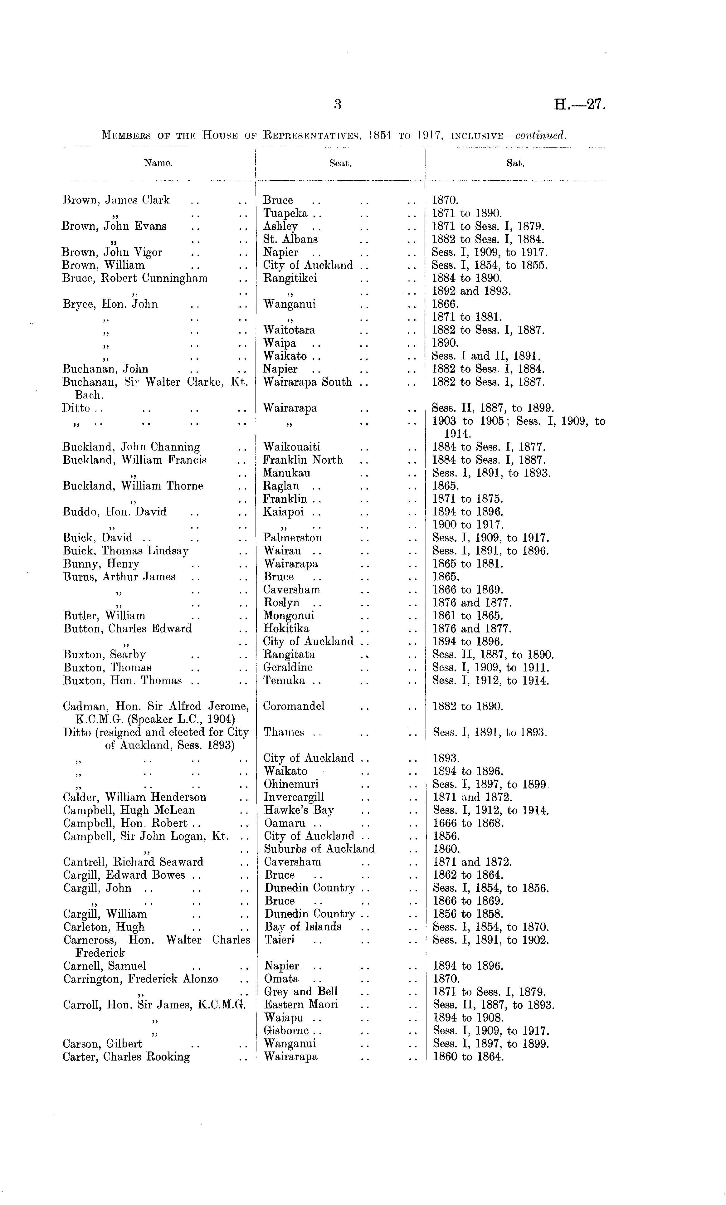 Name. Soat. Sat. Brown, James Clark 33 Brown, John Evans „ Brown, John Vigor Brown, William Bruce, Robert Cunningham Bruce Tuapeka Ashley St. Albans Napier City of Auckland .. Rangitikei 1870. 1871 to 1890. 1871 to Sess. I, 1879. 1882 to Sess. I, 1884. Sess. I, 1909, to 1.917. Sess. I, 1854, to 1855. 1884 to 1890. 1892 and 1893. 1866. 1871 to 1881. 1882 to Sess. I, 1887. 1890. Sess. I and II, 1891. 1882 to Sess. I, 1884. 1882 to Sess. I, 1887. Bryce, Hon. John Wanganui 33 33 • • 33 33 33 * * Waitotara Waipa Waikato Napier Wairarapa South . . Buchanan, John Buchanan, Sir Walter Clarke, Kt. Bach. Ditto . . Wairarapa Sess. II, 1887, to 1899. 1903 to 1.905; Sess. I, 1909, to 1914, 1884 to Sess. I, 1877. 1884 to Sess. I, 1887. Sess. I, 1891, to 1893. 1865. 187.1. to 1875. 1894 to 1896. 1900 to 191.7. Sess. I, 1909, to 1917. Sess. I, 1891, to 1896. 1865 to 1881. 1865. 1866 to 1869. 1876 and 1877. 1861 to 1865. 1876 and 1877. 1894 to 1896. Sess. II, 1887, to 1890. Sess. I, 1909, to 1911. Sess. I, 1912, to 1914, ,, .. .. .. .. 33 • • Buckland, John Channing Buckland, William Francis 33 • ■ Buckland, William Thome Waikouaiti Franklin North .. Manukau Raglan Franklin Kaiapoi 33 ■ " Buddo, Hon. David 33 • • Buick, David Buick, Thomas Lindsay Bunny, Henry Burns, Arthur James 33 33 Butler, William Button, Charles Edward 33 Palmerston Wairau Wairarapa Bruce Caversham Roslyn Mongonui Hokitika City of Auckland .. Rangitata Geraldine Temuka 33 • * Buxton, Searby Buxton, Thomas Buxton, Hon. Thomas Cadman, Hon. Sir Alfred Jerome, K.C.M.G. (Speaker L.C., 1904) Ditto (resigned and elected for City of Auckland, Sess. 1893) Coromandel 1882 to 1890. Thames Sess. I, 1891, to 1893. 33 " " ' ■ * ' 33 33 " ' ' * Calder, William Henderson Campbell, Hugh McLean Campbell, Hon. Robert Campbell, Sir John Logan, Kt. .. 33 ' ' Cantrell, Richard Seaward Cargill, Edward Bowes Cargill, John City of Auckland .. Waikato Ohinemuri lnvercargill Hawke's Bay Oamaru City of Auckland .. Suburbs of Auckland Caversham Bruce Dunedin Country .. Bruce Dunedin Country . . Bay of Islands Taieri 1893. 1894 to 1896. Sess. I, 1897, to 1899. 1871 and 1872. Sess. I, 1912, to 1914. 1666 to 1868. 1856. 1860. 1871 and 1872. 1862 to 1864. Sess. 1, 1854, to 1856. 1866 to 1869. 1856 to 1858. Sess. I, 1854, to 1870. Sess. I, 1891, to 1902. 33 * * * " Cargill, William Carleton, Hugh Carncross, Hon. Walter Charles Frederick Carnell, Samuel Carrington, Frederick Alonzo Carroll, Hon. Sir James, K.C.M.G. Napier Omata Grey and Bell Eastern Maori Waiapu Gisborne Wanganui Wairarapa 1894 to 1896. 1870. 1871 to Sess. I, 1879. Sess. II, 1887, to 1893. 1894 to 1908. Sess. I, 1909, to 1917. Sess. I, 1897, to 1899. 1860 to 1864. 33 33 Carson, Gilbert Carter, Charles Rooking