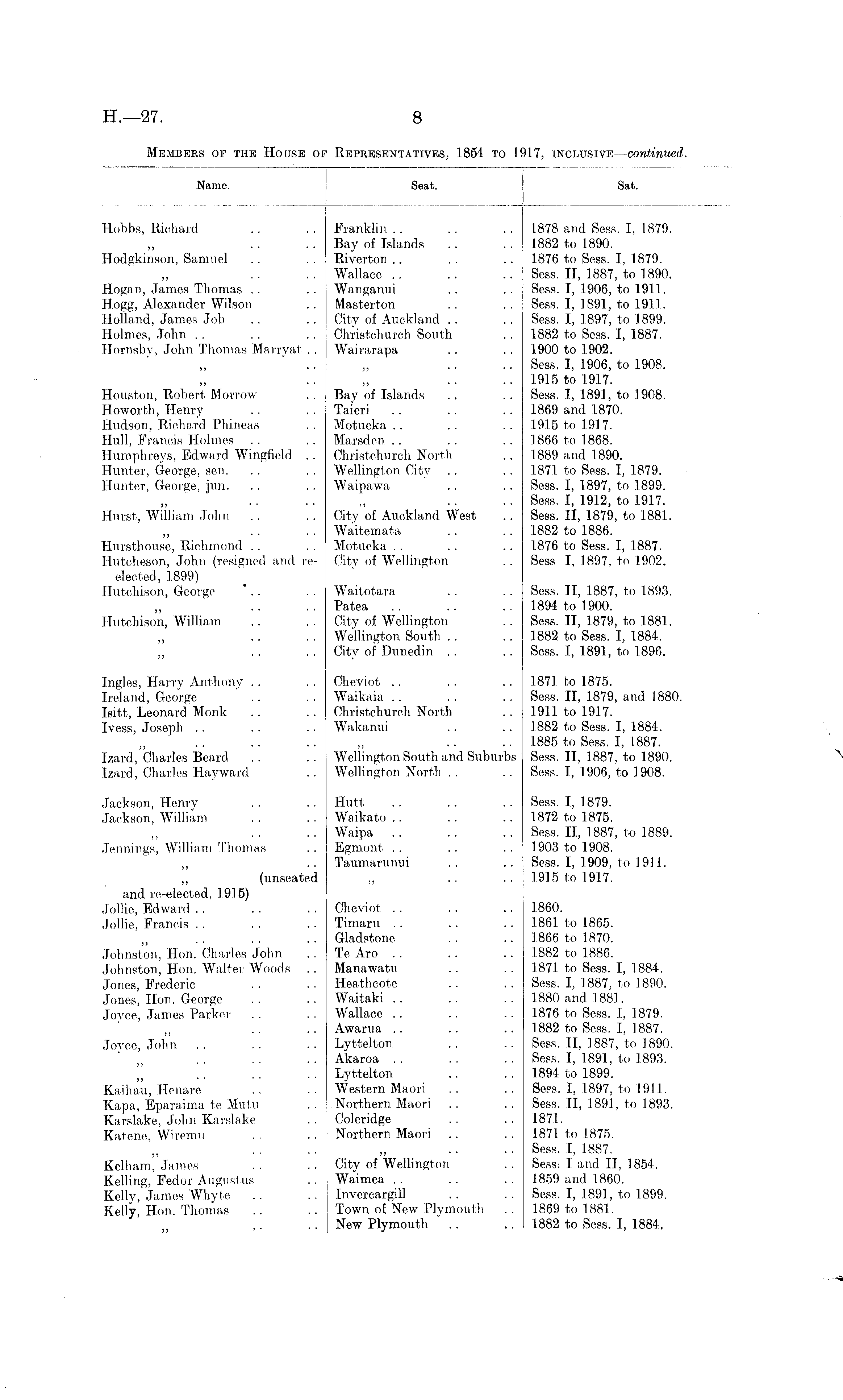 Name. Seat. Sat. Hobbs, Richard 33 Hodgkinson, Samuel Hogan, James Thomas Hogg, Alexander Wilson Holland, James Job Holmes, John Hornsby, John Thomas Marryat .. 33 • * 33 Houston, Robert Morrow Howorth, Henry Hudson, Richard Phineas Hull, Francis Holmes Humphreys, Edward Wingfield . . Hunter, George, sen. Hunter, George, jun. Franklin. Bay of Islands Riverton Wallace Wanganui Masterton City of Auckland Christchurch South Wairarapa ,, 33 Bay of Islands Taieri .. Motueka Marsden Christchurch North. Wellington City Waipawa 1878 and Sess. I, 1879. 1882 to 1890. 1876 to Sess. I, 1879. Sess. II, 1887, to 1890. Sess. I, 1906, to 1911. Sess. I, 1.891, to 1-911. Sess. I, 1897, to 1.899. 1882 to Sess. I, 1887. 1900 to 1902. Sess. I, 1.906, to 1908. 1915 to 1917. Sess. I, 1891, to 1908. 1869 and 1.870. 191.5 to 1.917. 1866 to 1868. 1889 and 1890. 1871 to Sess. I, 1879. Sess. I, 1897, to 1899. Sess. I, 1912, to 1917. Sess. II, 1879, to 1881. 1882 to 1886. 1.876 to Sess. I, 1887. Sess T, 1897. to 1902. 33 Hurst, William John 33 City of Auckland West Waitemata Motueka Citv of Wellington 33 Hursthouse, Richmond Hutcheson, John (resigned and reelected, 1899) Hutchison, George 33 Hutchison, William Waifotara Patea City of Wellington Wellington South City of Dunedin Sess. II, 1.887, to 1893. 1894 to 1900. Sess. II, 1879, to 1881. 1882 to Sess. I, 1884, Sess. I, 1891, to 1896. 33 33 Ingles, Harry Anthony Ireland, George Isitt, Leonard Monk Ivess, Joseph Cheviot Waikaia, Christchurch North Wakanui 1871 to 1875. Sess. II, 1879, and 1880. 1911 to 1917. 1882 to Sess. I, 1884. 1885 to Sess. I, 1887. Sess. II, 1887, to 1890. Sess. I, 1906, to 1908. 33 Izard, Charles Beard Izard, Charles Hay ward Wellington South and Suburbs Wellington North Jackson, Henry Jackson, William Hutt Waikato Waipa Egmont Taumarunui Sess. I, 1879. 1872 to 1875. Sess. II, 1887, to 1889. 1903 to 1908. Sess. I, 1909, to 1911. 1915 to 1917. Jennings, William Thomas 33 * * ,, (unseated and re-elected, 1915) Jollie, Edward Jollie, Francis Cheviot Timaru Gladstone Te Aro Manawatu Heathcote Waitaki Wallace Awarua Lyttelton Akaroa Lyttelton Western Maori Northern Maori Coleridge Northern Maori 1860. 1861 to 1865. 1866 to 1870. 1882 to 1886. 1871 to Sess. I, 1884. Sess. I, 1887, to 1890. 1880 and 1881. 1876 to Sess. I, 1879. 1882 to Sess. I, 1887. Sess. II, J 887, to 1890. Sess. I, 1891, to 1893. 1894 to 1899. Sess. I, 1897, to 1911. Sess. II, 1891, to 1893. 1871. 1.871 to 1875. Sess. I, 1887. Sess-. I and II, 1854. 1859 and 1860. Sess. I, 1891, to 1899. 1869 to 1881. 1882 to .Sess. I, 1884. ,3 Johnston, Hon. Charles John Johnston, Hon. Walter Woods Jones, Frederic Jones, Hon. George Joyce, James Parker 33 Joyce, John 33 Kaihau, Henare Kapa, Eparaima te Mutu Karslake, John Karslake Katene, Wiremu 33 Kelham, James Kelling, Fedor Augustus Kelly, James Whyte Kelly, Hon. Thomas 33 City of Wellington Waimea lnvercargill Town of New Plymouth New Plymouth 33 ' "