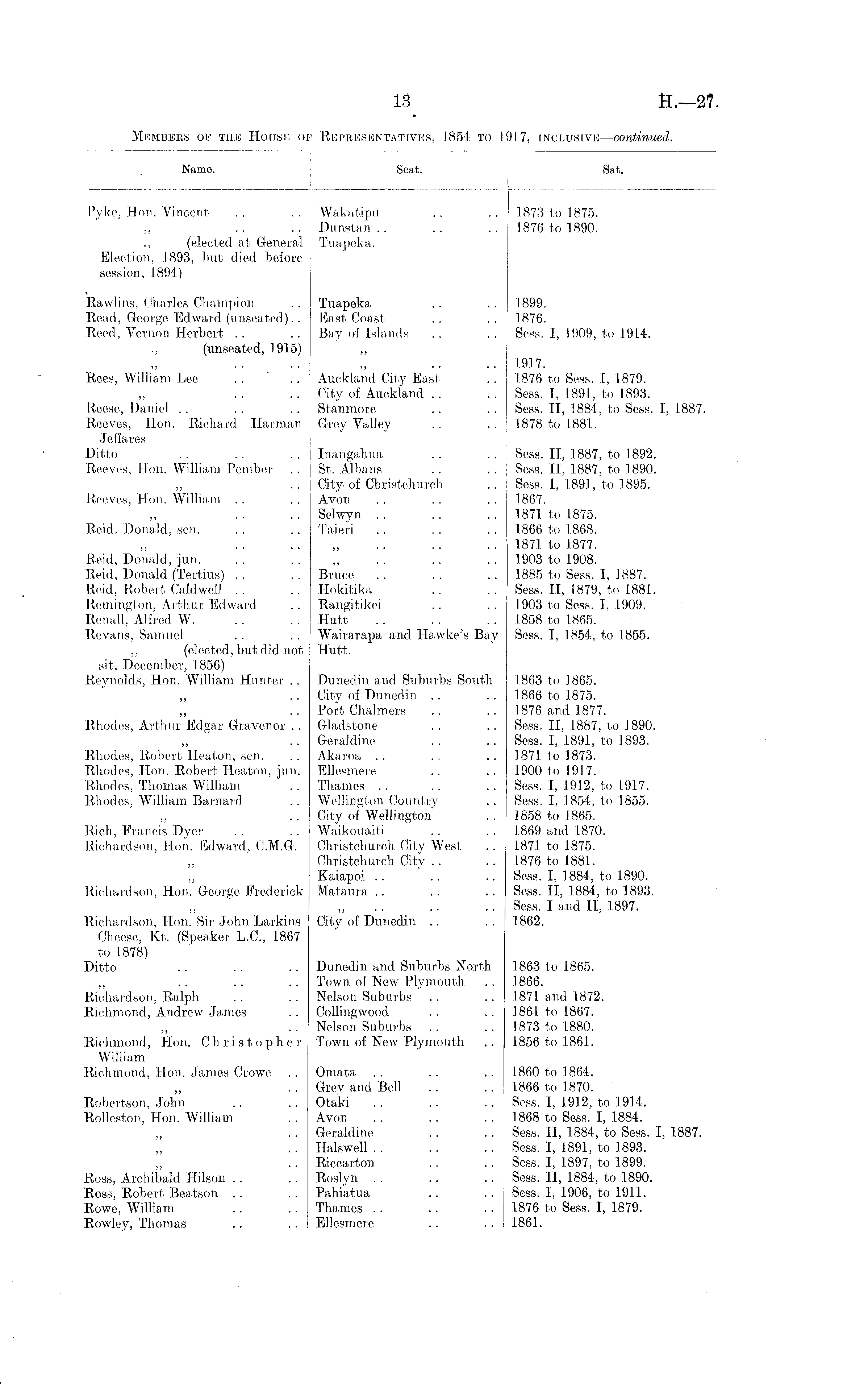 Name. Seat. Sat. Pyke, Hon. Vincent Wakatipu Dunstan Tuapeka, 1873 to 1875. 1876 to 1890. 33 • ' • • ., (elected at General Election, ,1893, but died before session, 1894) Rawlins, Charles Champion Read, George Edward (unseated). . Reed, Vernon Herbert . . ., (unseated, 1915) Tuapeka East Coast, Bay of Islands 1899. 1876. Sess. I, 1909, to 1914. 33 Rees, William Lee 33 Reese, Daniel Reeves, Hon. Richard Harman Jeffares Ditto Reeves. Hon. William Pember 33 * ' Auckland City East City of Auckland Stan more Grey Valley 1917. 1876 to Sess. I, 1879. Sess. I, 1891, to 1893. Sess. II, 1884, to Sess. I, 1887. 1878 to 1881. 33 Reeves, Hon. William .. Reid, Donald, sen. 33 Inangahua St, Albans City, of Christchurch Avon Selwyn Taieri Sess. II, 1887, to 1892. Sess. II, 1887, to 1890. Sess. I, 1891, to 1895. 1867. 1871 to 1875. 1866 to 1868. 1871 to 1877. 1903 to 1908. 1885 to Sess. I, 1887. Sess. II, 1.879, to 188J. 1903 to Sess. I, 1909. 1858 to 1865. Sess. I, 1854, to 1855. Reid, Donald, jun. Reid, Donald (Tertius) Reid, Robert Caldwell. .. Remington, Arthur Edward Renall, Alfred W. Revans, Samuel ,, (elected, but did not sit, December, 1856) Reynolds, Hon. William Hunter .. 33 Bruce Hokitika, Ra ngitikei Hutt Wairarapa and Hawke's Bav Hutt. 33 33 ■ ■ Rhodes, Arthur Edgar Gravenor . . Rhodes, Robert Heaton, sen. Rhodes, Hon. Robert Heaton, jun. Rhodes, Thomas William Rhodes, William Barnard Dunedin and Suburbs South City of Dunedin Port Chalmers Gladstone, Geraldine Akaroa Ellesmere Thames Wellington Country City of Wellington Waikouaiti Christchurch City West Christchurch City Kaiapoi Mataura, .. 1863 to 1865. 1.866 to 1875. 1876 and 1877. Sess. II, 1887, to 1890. Sess. I, 1891, to 1893. 1871 to 1873. 1900 to 1917. Sess. I, 1912, to 1917. Sess. I, 1854, to 1855. 1858 to 1865. 1869 and 1870. 1871. to 1.875. 1876 to 1881. Sess. I, 1884, to 1890. Sess. II, 1884, to 1893. Sess. I and II, 1897. 1862. Rich, Francis Dyer Richardson, Hon. Edward, C.M.G. Richardson, Hon. George Frederick 3 3 Richardson, Hon. Sir John Larkins Cheese, Kt, (Speaker L.C., 1.867 to 1878) Ditto 33 City of Dunedin 33 Richardson, Ralph Richmond, Andrew James Dunedin and Suburbs North Town of New Plymouth Nelson Suburbs Collingvvood Nelson Suburbs Town of New Plymouth 1863 to 1865. 1866. 1871 and 1872. 1861 to 1.867. 1873 to 1.880. 1856 to 1861. Richmond, Hon. C h ri s t o p h e c William Richmond, Hon. James Crowe 33 Robertson, John Rolleston, Hon. William 33 Omata Grey and Bell Otaki Avon Geraldine Halswell Riccarton Roslyn Pahiatua Thames Ellesmere 1860 to 1864. 1866 to 1870. Sess. I, 1912, to 1914. 1.868 to Sess. I, 1884. Sess. II, 1884, to Sess. I, 1887. Sess. I, 1891, to 1893. Sess. I, 1897. to 1899. Sess. II, 1884, to 1890. Sess. I, 1906, to 1911. 1.876 to Sess. I, 1879. 186.1. 33 ■ * 33 ' * Ross, Archibald Hilson Ross, Robert Beatson Rowe, William Rowley, Thomas