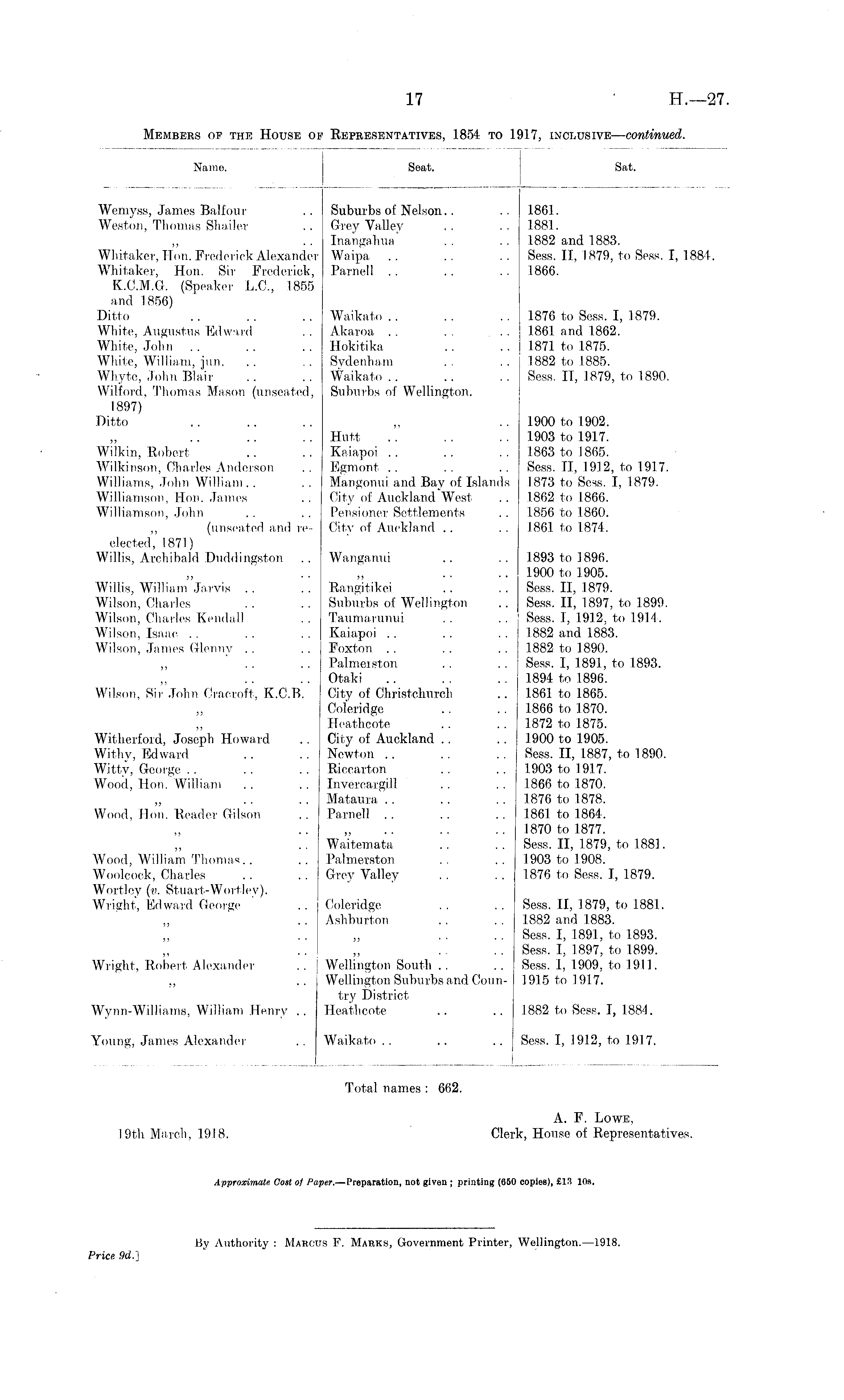 Name. Soat. Sat. Wemyss, James Balfour Weston, Thomas Shailer 33 Whitaker, Hon. Frederick Alexander Whitaker, Hon. Sir Frederick, K.C.M.G, (Speaker L.C., 1855 and 1856) Ditto White, Augustus Edward White, John White, William, jun. Whyte, John Blair Wilford, Thomas Mason (unseated, 1897) Suburbs of Nelson Grey Valley Inangahua Waipa Parnell 1.861. 1881. 1882 and. 1883. Sess. II, 1879, to Sess. I, 1884 1866. Waikato Akaroa .. . , . . . Hokitika Sydenham Waikato Suburbs of Wellington. 1876 to Sess. I, 1879. 1861 and 1862. 1871 to 1875. 1882 to 1885. Sess. II, 1879, to 1890. Ditto Wilkin, Robert Wilkinson, Charles Anderson Williams, John William Williamson, Hon. James Williamson, John ,, (unseated and reelected, 1871) Willis, Archibald Duddingston Hutt Kaiapoi Egmont Mangonui and Bay of Islands City of Auckland West Pensioner Settlements City of Auckland 1900 to 1902. 1903 to 1917. .1863 to 1865. .Sess. II, 1912, to 1917. 1873 to Sess. I, 1879. 1.862 to 1866. 1856 to 1860. 1861 to 1874. Wanganui 1893 to 1896. 1900 to 1905. Sess. II, 1879. Sess. II, 1897, to 1899. Sess. I, 1912. to 1914. 1882 and 1883. 1882 to 1890. Sess. I, 1891, to 1893. 1894 to 1896. 1861 to 1865. 1866 to 1870. 1872 to 1875. 1900 to 1905. Sess. II, 1887, to 1890. 1903 to 1917. 1866 to 1870. 1876 to 1878. 1861 to 1864. 1870 to 1877. Sess. II, 1879, to 1881. 1903 to 1908. 1876 to Sess. I, 1879. 33 Willis, William Jarvis Wilson, Charles Wilson, Charles Kendall Wilson, Isaac Wilson, James Glemiy 33 Wilson, Sir John Cracroft, K.C.B. 33 Rangitikei Suburbs of Wellington Taumarunui Kaiapoi Foxton Palmeiston Otaki City of Christchurch Coleridge Heathcote City of Auckland Newton Riccarton lnvercargill Mataura Parnell 33 Witherford, Joseph Howard Withy, Edward Witty, George Wood, Hon. William 33 Wood, Hon. Reader Gilson 33 • • 33 Wood, William Thomas.. Wooicock, Charles Wortley (v. Stuart-Worthy). Wright, Edward George Waitemata Palmerston Grey Valley Coleridge Ashburton Sess. II, 1879, to 1881. 1882 and 1.883. Sess. I, 1891, to 1893. Sess. I, 1897, to 1899. Sess. I, 1909, to 1911. 1915 to 1917. 33 Wright, Robert Alexander 3 3 Wellington South Wellington Suburbs and Country District Heathcote Wynn-Williams, William Henry .. 1.882 to Sess. I, 1881. Young, James Alexander Waikato Sess. I, 1912, to 1917. .___ .