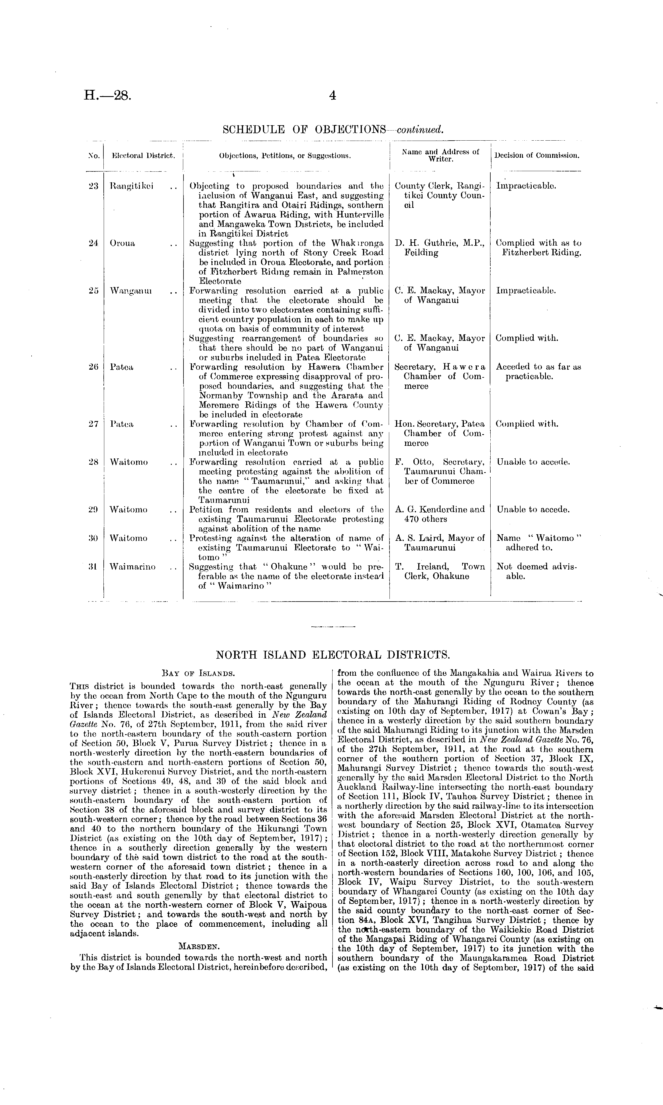 No. Electoral District. Objections, Petitions, or Suggestions. i Name and Address of Writer. Decision of Commission. J 23 Rangitikei Objecting to proposed boundaries and the inclusion of Wanganui East, and suggesting that Rangitira and Otairi Ridings, southern portion of Awarua Hiding, with Hunterville and Mangaweka Town Districts, be included in Rangitikei District Suggesting that portion of the Whakironga district lying north of Stony Creek Road be included in Oroua Electorate, and portion of Fit/.herbort Riding remain in Palmerston Electorate Forwarding resolution carried at a public; meeting that the electorate should be divided into two electorates containing sufficient country population in each to make up quota on basis of community of interest Suggesting rearrangement of boundaries so that there should be no part of Wanganui or suburbs included in Patea Electorate Forwarding resolution by Hawera Chamber of Commerce expressing disapproval of proposed boundaries, and suggesting that the Normanby Township and the Ararata and Moremero Ridings of the Hawera County be included in electorate forwarding resolution by Chamber of Commerce entering strong protest against any portion of Wanganui Town or suburbs being included in electorate Forwarding resolution carried at a public meeting protesting against the abolition of the name " Taumarunui," and asking that the centre of the electorate bo fixed at Taumarunui Petition from residents and electors of the existing Taumarunui Electorate protesting against abolition of the name Protesting against the alteration of name of existing Taumarunui Electorate to " Waitomo " Suggesting that " Ohakune" would be preferable as the name of the electorate instead of " Waimarino " County Clerk, Rangitikei County Council impracticable. 24 Oroua I). H. Guthrie, M.I , ., Feilding Complied with as to Fitzherbert Riding. Wftnganui C. E. Mackay, Mayor of Wanganui Impraotioable. 25 C. E. Mackay, Mayor of Wanganui Complied with. 26 Patoa Secretary, Hawera Chamber of ComAcceded to as far as practicable. merce Patea Hon. Secretary, Patea Chamber of ComComplied with. 27 Waitomo merce Unable to accede. 28 F. Otto, Secretary, Taumarunui Chamber of Commerce Wai tomo A. G. Kenderdine and 470 others Unable to accede. 20 30 Waitomo A. S. Laird, Mayor of Taumarunui Narao " Waitomo " adhered to. 31 Waimarino T. Ireland, Town Clerk, Ohakune Not deemed advisable.