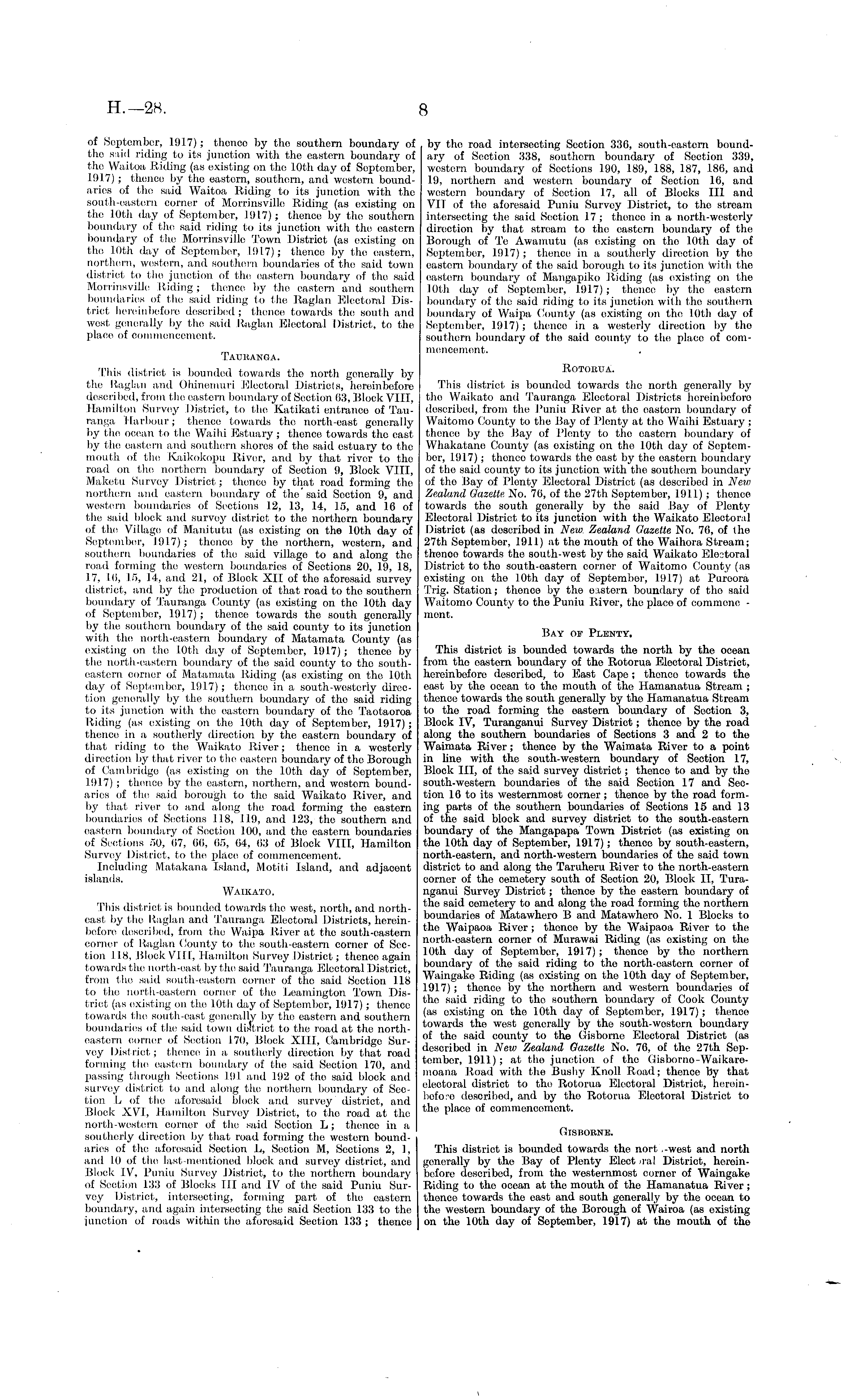 of September, 1917); thenco by tho southern boundary of the said riding to its junction with the eastern boundary of the Waitoa Riding (as existing on the 10th day of September, 1917) ; thence by the eastorn, southern, and western boundaries of tho said Waitoa Riding to its junction with tho south-eastern corner of Morrinsville Riding (as existing on the 10th day of September, .1917); thence by tho southern boundary of tho said riding to its junction with the eastorn boundary of the Morrinsville Town District (as existing on the 10th day of September, 1917); thence by tho eastern, northern, western, and southorn boundaries of tho said town district to the junction of the eastern boundary of the said Morrinsville Riding ; thence by the eastern and southern boundaries of the said riding to the Raglan Electoral District hereinbefore described ; thence towards the south and west generally by the said Raglan Electoral District, to the place of commencement. Taukanga. This district is bounded towards the north generally by the Raglan and Ohinemuri Electoral Districts, hereinbefore described, from the eastern boundary of Section 63, Block VIII, Hamilton Survey District, to tho Katikati entrance of Tauranga Harbour; thence towards tho north-east generally by the ocean to tho Waihi Estuary ; thence towards the east by the eastern and southern shores of the said estuary to tho mouth of the Kaikokopu River, and by that river to tho road on the northern boundary of Section 9, Block VIII, Maketu Survey District; thence by that road forming tho northern and eastorn boundary of the'said Section 9, and western boundaries of Sections 12, 13, 14, 15, and 16 of the said block and survey district to the northern boundary of the Village of Manitutu (as existing on the 10th day of September, 1917); thence by the northern, western, and southern boundaries of the said village to and along tho road forming the western boundaries of Sections 20, 19, 18, 17, 16, 1.5, 14, and 21, of Block XII of the aforesaid survey district, and by the production of that road to tho southern boundary of 'Pauranga County (as existing on the 10th day of September, 1917); thence towards the south generally by the southorn boundary of the said county to its junction with the north-eastern boundary of Matamata County (as existing on tho 10th day of September, 1917) ; thence by the north-eastern boundary of the said county to tho southeastern corner of Matamata Riding (as existing on the 10th day of September, 1917); thence in a south-westerly direction generally by the southern boundary of tho said riding to its junction with the eastern boundary of the Taotaoroa Riding (as existing on the 10th day of September, 1917) ; thence in a southerly direction by the eastern boundary of that riding to the Waikato River; thence in a westerly direction by that river to the eastern boundary of the Borough of Cambridge (as existing on the 10th day of Soptember, 1917) ; thence by the eastorn, northern, and westorn boundaries of the said borough to tho said Waikato River, and by that river to and along the road forming the oastern boundaries of Sections 118, 119, and 123, the southern and eastern boundary of Section 100, and the eastern boundaries of Sections 50, 67, 66, 65, 64, 63 of Block VIII, Hamilton Survey District, to the place of commencement. Including Matakana Island, Motiti Island, and adjacent islands. Waikato. This district is bounded towards the west, north, and northeast by the Raglan and Tauranga Electoral Districts, hereinbefore described, from the Waipa River at the south-eastern corner of Raglan County to the south-eastern corner of Section 118, Block VIII, Hamilton Survey District; thence again towards the north-east by the said Tauranga Electoral District, from the said south-eastern corner of the said Section 118 to the north-eastern corner of the Leamington Town District (as existing on tho 10th day of September, 1917); thence towards the south-oast generally by tho eastern and southern boundaries of the said town district to the road at the northeastern corner of Section 170, Block XIII, Cambridge Survey District; thence in a southerly direction by that road forming the eastern boundary of the said Section 170, and passing through Sections 191 and 192 of the said block and survey district to and along tho northern boundary of Section L of the aforesaid block and survey district, and Block XVI, Hamilton Survey District, to tho road at the north-western corner of the said Section L; thence in a southerly direction by that road forming the western boundaries of the aforesaid Section L, Section M, Sections 2, 1, and 10 of the last-mentioned block and survey district, and Block IV, Puniu Survey District, to the northern boundary of Section 133 of Blocks III and IV of the said Puniu Survey District, intersecting, forming part of the eastern boundary, and again intersecting the said Section 133 to the junction of roads within the aforesaid Section 133 ; thence