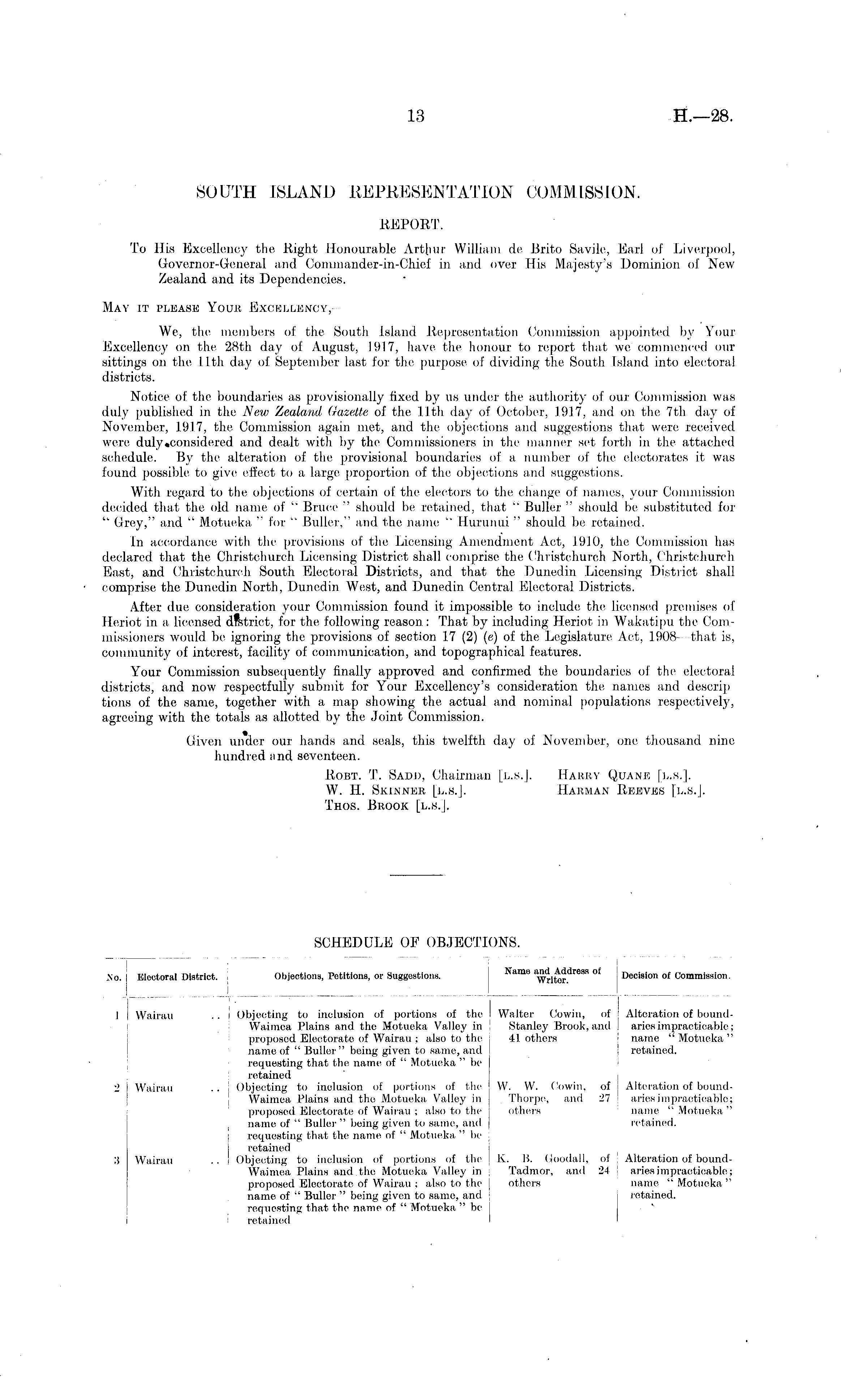 SOUTH ISLAND REPKESENTATION COMMISSION. REPORT. To His Excellency the Right Honourable Arthur William de Brito Savile, Earl of Liverpool, Governor-General and Commander-in-Chief in and over His Majesty's Dominion ol New Zealand and its Dependencies. May it please Your Excellency,— We, the members of the South Island Representation Commission appointed by Your Excellency on the 28th day of August, 1917, have the honour to report that we commenced our sittings on the 11th day of September last for the purpose of dividing the South Island into electoral districts. Notice of the boundaries as provisionally fixed by us under the authority of our Commission was duly published in the New Zealand Gazette of the 11th day of October, 1917, and on the 7th day of November, 19.1.7, the Commission again met, and the objections and suggestions that were received were duly .considered and dealt with by the Commissioners in the manner set forth in the attached schedule. By the alteration of the provisional boundaries of a number of the electorates it was found possible to give effect to a large proportion of the objections and suggestions. With regard to the objections of certain of the electors to the change of names, your Commission decided that the old name of " Bruce " should be retained, that " Buller " should be substituted for " Grey," and " Motueka " for " Buller," and the name " Huranui " should be retained. In accordance with the provisions of the Licensing Amendment Act, 1.910, the Commission has declared that the Christehurch Licensing District shall comprise the Christehureh North, Christchurch East, and Christchurch South Electoral Districts, and that the Dunedin Licensing District shall comprise the Dunedin North, Dunedin West, and Dunedin Central Electoral Districts. After due consideration your Commission found it impossible to include the licensed premises of Heriot in a licensed district, for the following reason : That by including Heriot in Wakatipu the Commissioners would be ignoring the provisions of section 1.7 (2) (c) of the, Legislature Act, 1908 that is, community of interest, facility of communication, and topographical features. Your Commission subsequently finally approved and confirmed the boundaries of the electoral districts, and now respectfully submit for Your Excellency's consideration the names and descrip tions of the same, together with a map showing the actual and nominal populations respectively, agreeing with the totals as allotted by the Joint Commission. Given under our hands and seals, this twelfth day of November, one thousand nine hundred nnd seventeen. Robt. T. Sadd. Chairman [l.s.J. Harry Quane [l.s.]. W. H. Skinner [l.s.]. Harman Reeves [l.s.]. Thos. Brook [l.w.J.