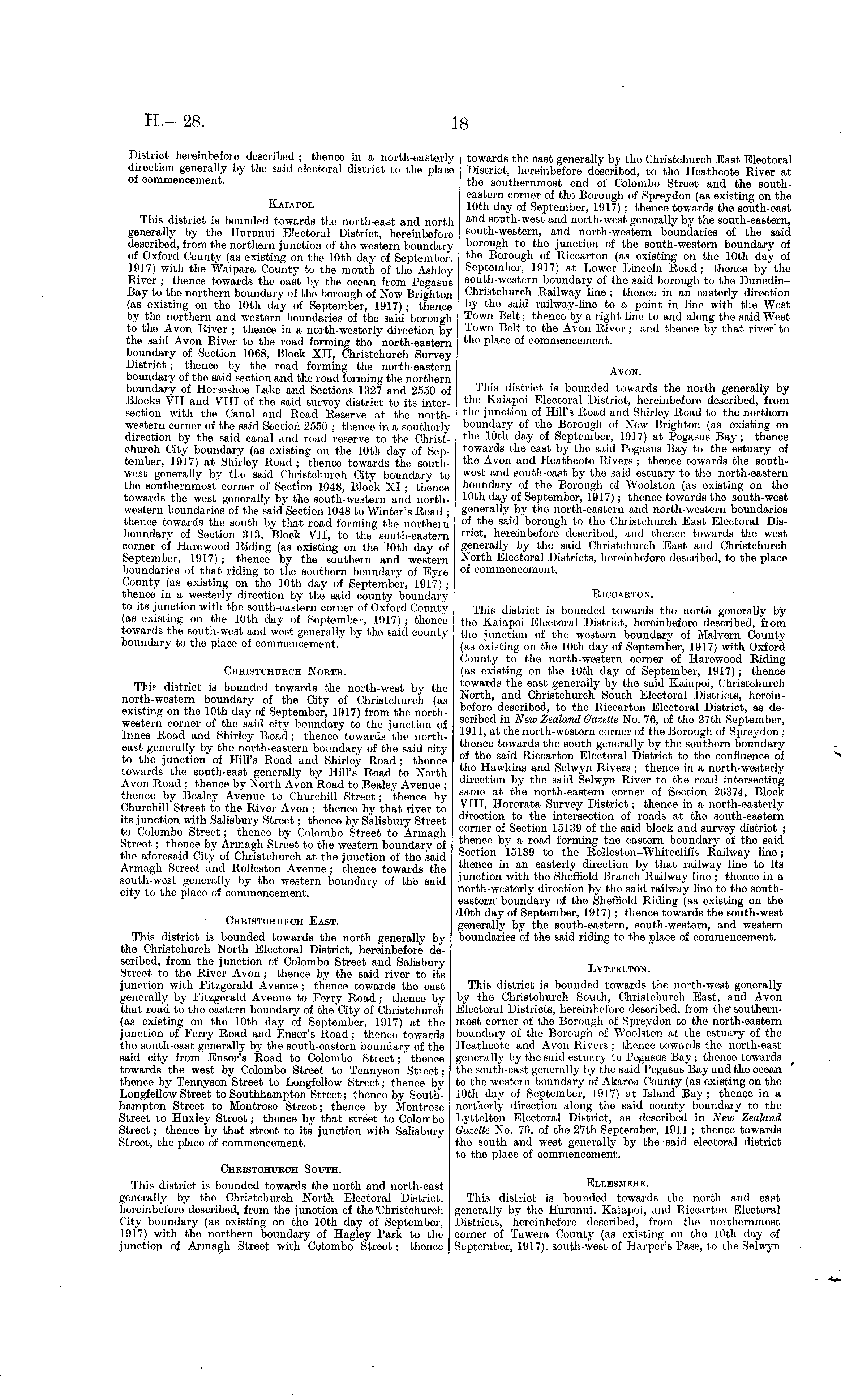 District hereinbefore described; thence in a north-easterly direction generally by the said electoral district to tho placo of commencement. Kaiapoi. This district is bounded towards tho north-east and north generally by the Hurunui Electoral District, hereinbefore described, from tho northern junction of the wostorn boundary of Oxford County (as oxisting on tho 10th day of Septemhor, 1917) with tho Waipara County to the mouth of the Ashley River ; thence towards tho oast by tho ocean from Pegasus Bay to tho northern boundary of the borough of Now Brighton (as existing on the 10th day of September, 1917) ; thence by the northern and western boundaries of tho said borough to the Avon River ; thence in a north-westerly diroction by the said Avon Rivor to the road forming the north-eastern boundary of Section 1068, Block XII, Christchurch Survey District; thence by the road forming tho north-eastorn boundary of the said section and the road forming the northern boundary of Horseshoe Lake and Sections 1327 and 2550 of Blocks VII and VIII of the said survey district to its intersection with the Canal and Road Reserve at the northwostern corner of tho said Section 2550 ; thence in a southorly direction by the said canal and road reserve to the Christchurch City boundary (as existing on the 10th day of September, .191.7) at Shirley Road ; thenco towards the southwest generally by the said Christchurch City boundary to the southernmost corner of Soction 1048, Block XI; thence towards tho west generally by the south-western and northwestern boundaries of the said" Section 1048 to Winter's Road ; thence towards tho south by that road forming the northei n boundary of Section 313, Block VII, to the south-eastern corner of Harewood Riding (as existing on the 10th day of Septemhor, 1917) ; thenco by the southern and wostern boundaries of that riding to the southorn boundary of Eyre County (as existing on the 10th day of September, 1917) ; thence in a westerly direction by the said county boundary to its junction with the south-eastern corner of Oxford County (as existing on the 10th day of September, 1917) ; thenco towards the south-west and west generally by tho said county boundary to the place of commencement. Christchurch North. This district is bounded towards the north-west by the north-western boundary of the City of Christchurch (as existing on tho 10th day of September, 1917) from the northwestern corner of tho said city boundary to tho junction of Innes Road and Shirley Road; thence towards the northeast generally by the north-oastern boundary of the said city to the junction of Hill's Road and Shirley Road ; thence towards the south-east generally by Hill's Road to North Avon Road ; thenco by North Avon Road to Boaley Avenue ; thonce by Bealoy Avenue to Churchill Streot; 'thence by Churchill Street to the River Avon ; thenco by that river to its junction with Salisbury Street; thoneo by Salisbury Streot to Colombo Street; thenco by Colombo Street to Armagh Street; thonce by Armagh Streot to the western boundary of tho aforesaid City of Christchurch at tho junction of tho said Armagh Street and Rolleston Avenue; thence towards the south-wost generally by the western boundary of the said city to tho placo of 'commencement. ' L/HRlSTCiiuucH JiAST. This district is bounded towards tho north generally by tho Christchurch North Eloetoral District, hereinbefore described, from the junction of Colombo Street and Salisbury Street to the River Avon ; thence by the said rivor to its junction with Fitzgerald Avenue; thence towards tho oast genorally by Fitzgerald Avenue to Ferry Road ; thoneo by that road to the eastern boundary of the City of Christchurch (as existing on the 10th day of Soptombor, 1917) at tho junction of Ferry Road and Ensor's Road ; thoneo towards the south-east gonorally by tho south-eastern boundary of tho said city from Ensor's Road to Colombo Street; thence towards the west by Colombo Street to Tennyson Street; thoneo by Tennyson Street to Longfellow Street; thence by Longfellow Street to Southhampton Street; thonce by Southhampton Street to Montroso Streot; thence by Montrose Street to Huxley Street; thence by that street to Colombo Street; thenoe by that streot to its junction with Salisbury Street, tho place of commencoment. Christchurch South. This district is bounded towards tho north and north-oast gonorally by tho Christchurch North Eloetoral District. hereinbefore described, from the junction of tho "Christchurch City boundary (as oxisting on the 10th day of September, 1917) with the northern boundary of Hagley Park to the junction of Armagh Streot with Colombo Street; thence |