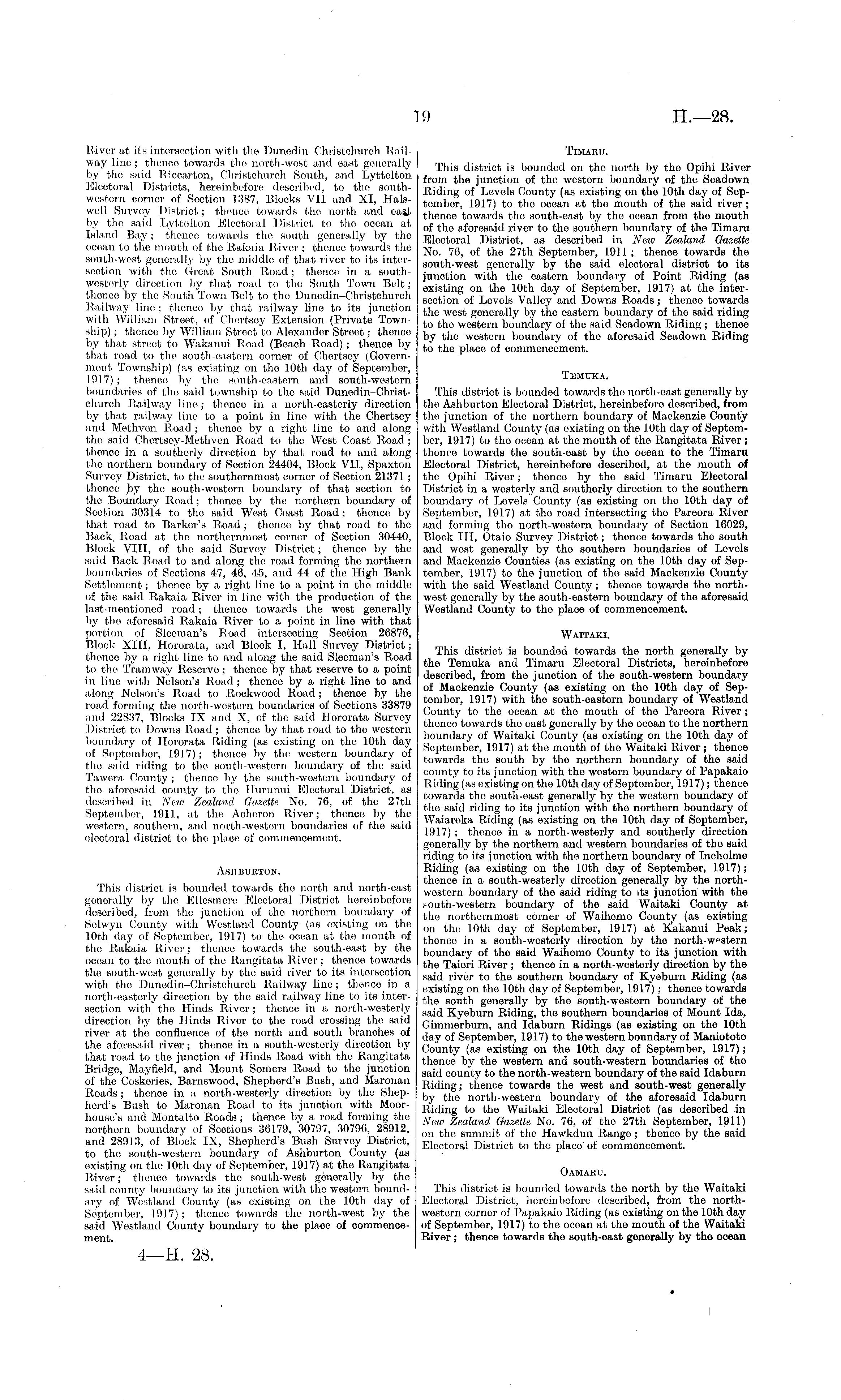 I Timaru. ' This district is bounded on tho north by the Opihi River from the junction of tho western boundary of tho Seadown Riding of Levels County (as existing on the 10th day of September, 1917) to the ocean at tho mouth of the said river; thence towards the south-east by tho ocean from the mouth of tho aforesaid rivor to the southern boundary of tho Timaru Electoral District, as described in New Zealand Gazette No. 76, of the 27th September, 1911 ; thence towards the south-west generally by the said electoral district to its junction with the eastern boundary of Point Riding (as existing on tho 10th day of September, 1917) at the intersection of Lovols Valley and Downs Roads; thenco towards the west generally by tho oastern boundary of the said riding to tho western boundary of the said Seadown Riding; thence by tho western boundary of the aforesaid Seadown Riding to the place of commencement. Temuka. This district is bounded towards the north-oast generally by the Ashburton Electoral District, hereinbefore described, from tho junction of tho northern boundary of Mackenzie County with Wostland County (as existing on tho 10th day of Soptombor, 1917) to the ocean at tho mouth of tho Rangitata River ; thenco towards the south-east by tho ocean to the Timaru Electoral District, hereinbefore describod, at the mouth of tho Opihi River; thenco by the said Timaru Electoral District in a wostorly and southerly diroction to the southern boundary of Lovols County (as existing on tho 10th day of September, 1917) at the road intersecting tho Pareora River and forming tho north-wostorn boundary of Section 16029, Block III, Otaio Survey District; thonce towards tho south and wost generally by tho southern boundaries of Levols and Maekonzio Counties (as oxisting on the 10th day of Soptomber, 1917) to the junction of tho said Maekonzio County with tho said Westland County ; thence towards tho northwest generally by the south-oastern boundary of tho aforesaid Westland County to the placo of commencement. Waitaki. This district is boundod towards tho north gonorally by the Temuka and Timaru Electoral Districts, horoinbeforo described, from the junction of tho south-western boundary of Maekonzio County (as oxisting on tho 10th day of September, 1917) with the south-eastern boundary of Westland County to the ocean at the mouth of tho Pareora River ; thenco towards tho east generally by the ocoan to the northern boundary of Waitaki County (as existing on the 10th day of September, 1917) at the mouth of the Waitaki River ; thence towards tho south by the northern boundary of the said county to its junction with tho western boundary of Papakaio Riding (as oxisting on the 10th day of Septombor, 1917); thonce towards tho south-east generally by the wostorn boundary of the said riding to its junction with the northern boundary of Waiareka Riding (as existing on the 10th day of September, 1917); thonce in a north-westerly and southerly direction generally by tho northern and western boundaries of tho said riding to its junction with tho northern boundary of Incholmo Riding (as oxisting on the 10th day of Soptember, 1917); thence in a south-westerly diroction generally by tho northwestern boundary of the said riding to its junction with the south-western boundary of the said Waitaki County at the northernmost corner of Waihemo County (as existing on the 10th day of September, 1917) at Kakanui Peak; thonco in a south-westerly diroction by the north-western boundary of the said Waihemo County to its junction with the Taieri River ; thenoe in a north-westerly direction by the said river to tho southern boundary of Kyeburn Riding (as existing on the 10th day of September, 1917); thence towards the south generally by the south-western boundary of the said Kyeburn Riding, the southern boundaries of Mount Ida, Gimmerburn, and Idaburn Ridings (as existing on the 10th day of September, 1917) to the western boundary of Maniototo County (as existing on the 10th day of September, 1917); thenco by the western and south-western boundaries of the said county to the north-western boundary of the said Idaburn Riding; thenoe towards the west and south-west generally by the north-western boundary of the aforesaid Idaburn Riding to the Waitaki Electoral District (as described in New Zealand Gazette No. 76, of the 27th September, 1911) on the summit of tho Hawkdun Range; thence by tho said Electoral District to the place of commencement. Oamaru. This district is bounded towards tho north by the Waitaki Electoral District, hereinbefore describod, from the northwostorn corner of Papakaio Riding (as oxisting on tho 10th day of September, 1917) to the ocoan at the mouth of the Waitaki Rivor ; thence towards the south-east gonorally by the ocean