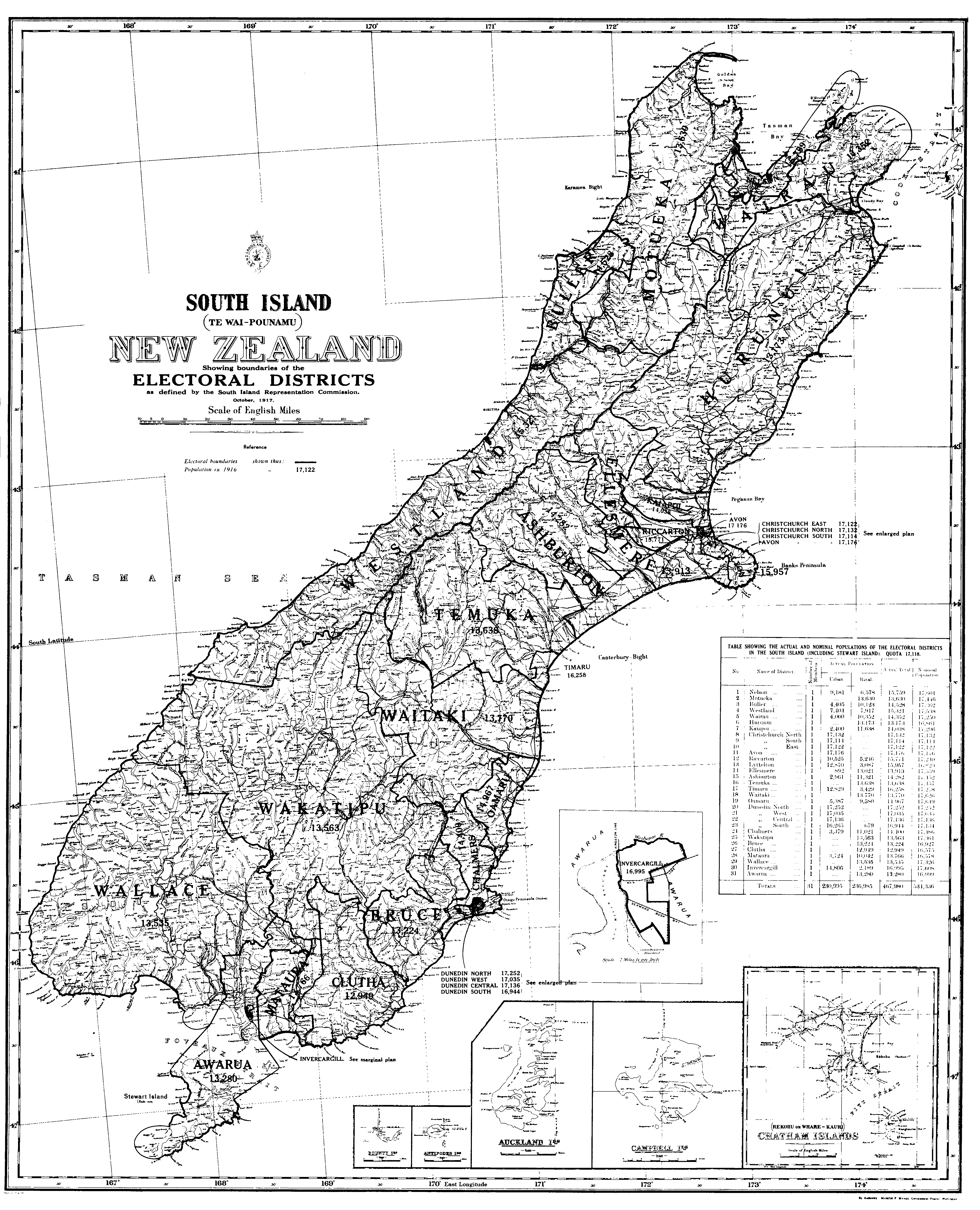 SOUTH ISLAND (TE WAI-POUNAMU) NEW ZEALAND Showing boundaries of the ELECTORAL DISTRICTS as defined by the South Island Representation Commission. October, 1917.
