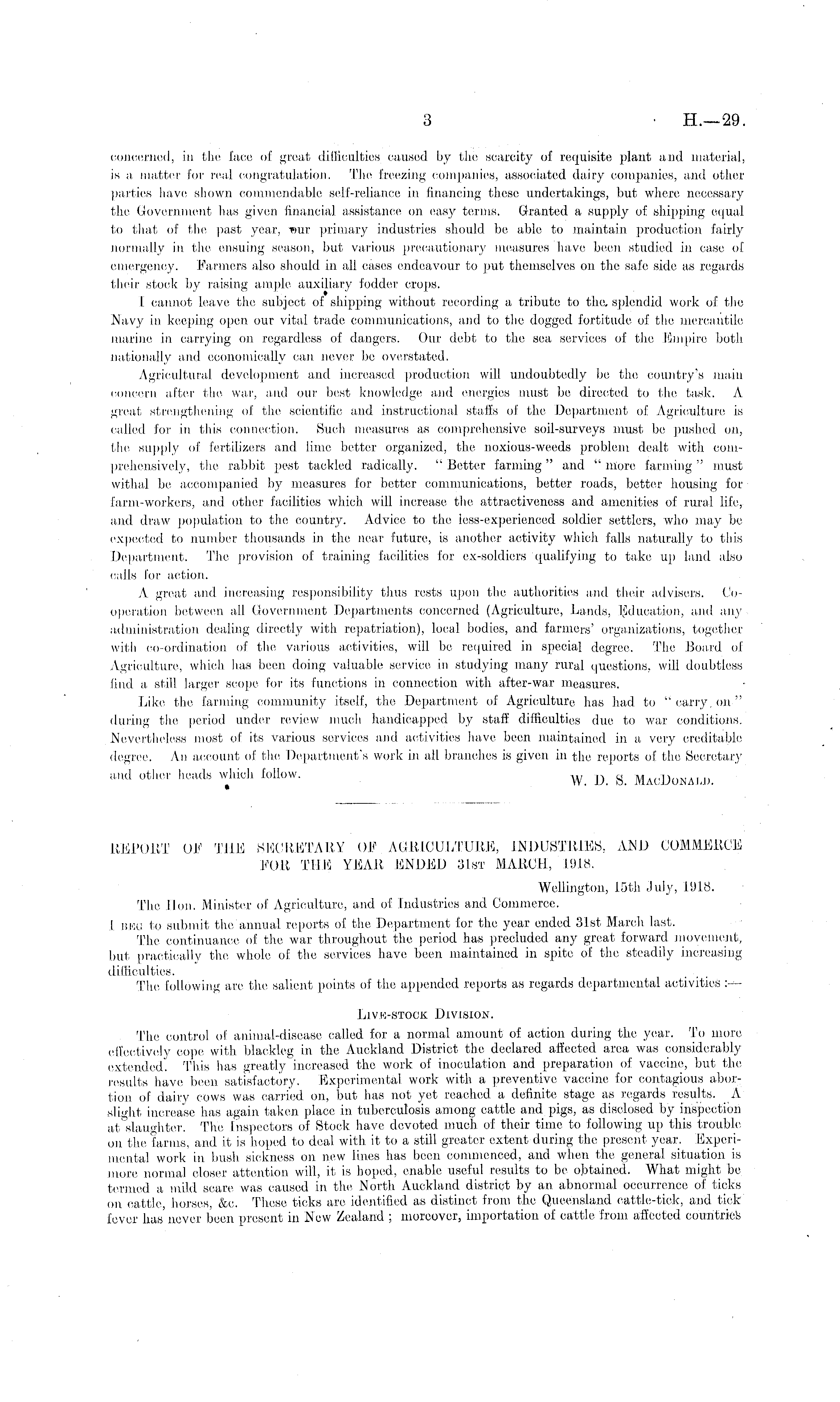 REPORT OF Till'; SECRETARY OF AGRICULTURE, INDUSTRIES. AND COMMERCE FOR THE YEAR ENDED 31st MARCH, 1918. Wellington, 15th duly, 1918. The lion. Minister of Agriculture, and of Industries and Commerce. I BEG to submit the annual reports of the Department for the year ended 31st March last. The continuance- of the war throughout the period has precluded any great forward movement, but practically the whole of the services have been maintained in spite of the steadily increasing difficulties. The following are the salient points of the appended reports as regards departmental activities : J Live-stock Division. The control of animal-disease called for a normal amount of action during the year. To more effectively cope with blackleg in the Auckland District the declared affected area was considerably extended! This lias greatly increased the work of inoculation and. preparation of vaccine, but the results have been satisfactory. Experimental work with a preventive vaccine for contagious abortion of dairy cows was carried on. but has not yet reached a definite stage as regards results. A slight increase has again taken place in tuberculosis among cattle and pigs, as disclosed by inspection at slaughter. The inspectors of Stock have devoted much of their time to following up this trouble on the farms, and. it is hoped to deal with it to a still greater extent during the present year. Experimental work in bush sickness on new lines has been commenced, and when the general situation is more normal closer attention will, it is hoped, enable useful results to be obtained. What might be termed a mild scare was caused in the North Auckland district by an abnormal occurrence of ticks on cattle, horses, &c. These ticks are identified as distinct, from the Queensland cattle-lit-I<, and tick fever has'never been present in New Zealand, ; moreover, importation of cattle from affected countries