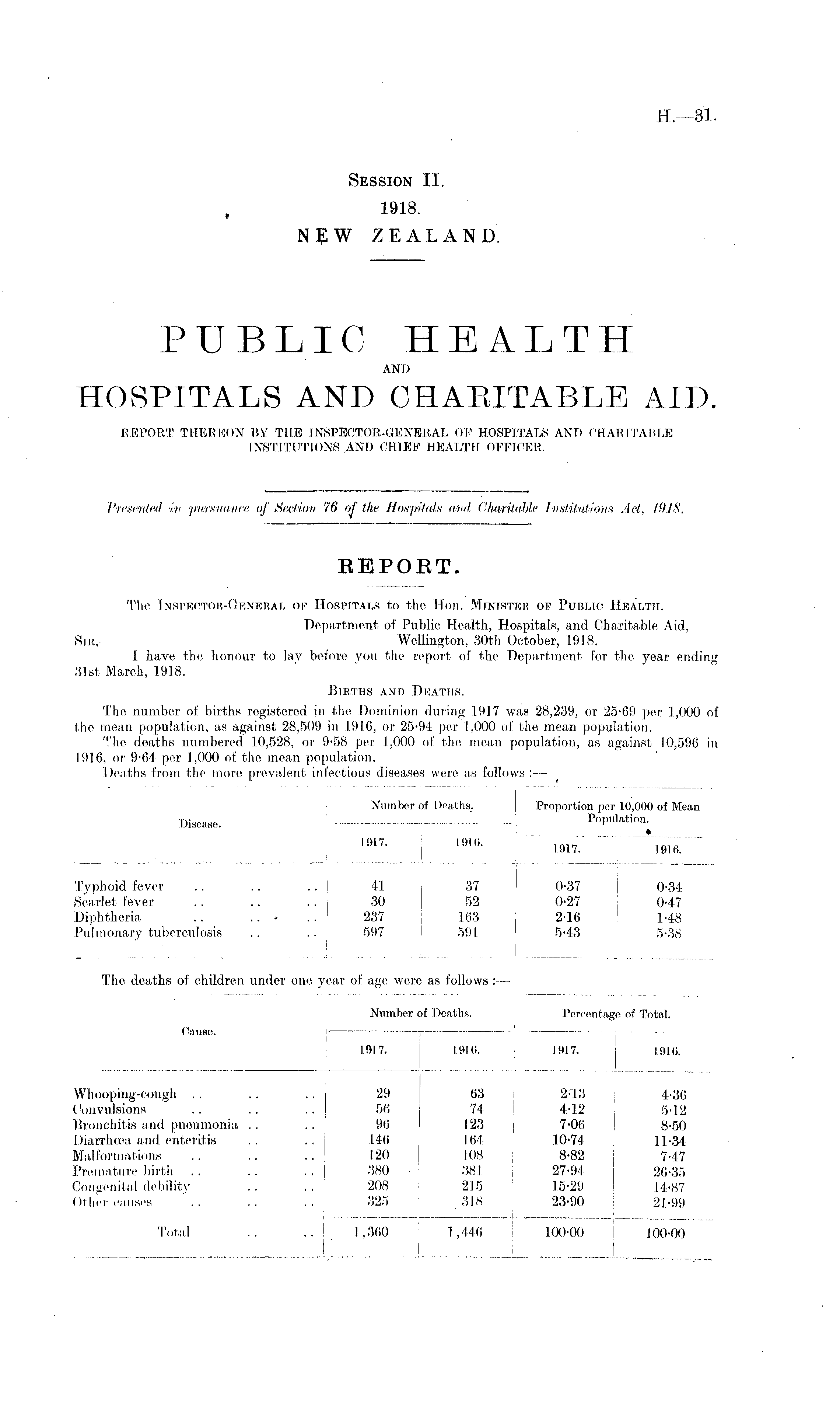 REPORT. The Tnspector-General of Hospitals to the Hon. Minister op Public Health. Department of Public Health, Hospitals, and Charitable Aid, Sir,-- Wellington, 30th October, 1918. 1 have the honour to lay before you the report of the Department for the year ending 31st March, 1918. Births and Deaths. The number of births registered in the Dominion during 1917 was 28,239, or 25-69 per 1,000 of the mean population, as against 28,509 in 1916, or 25-94 per 1,000 of the mean population. The deaths numbered 10,528, or 9-58 per 1,000 of the mean population, as against 10,596 in 1916, or 9-64 per 1,000 of the mean population. 1 )eaths from the more prevalent infectious diseases were as follows : —