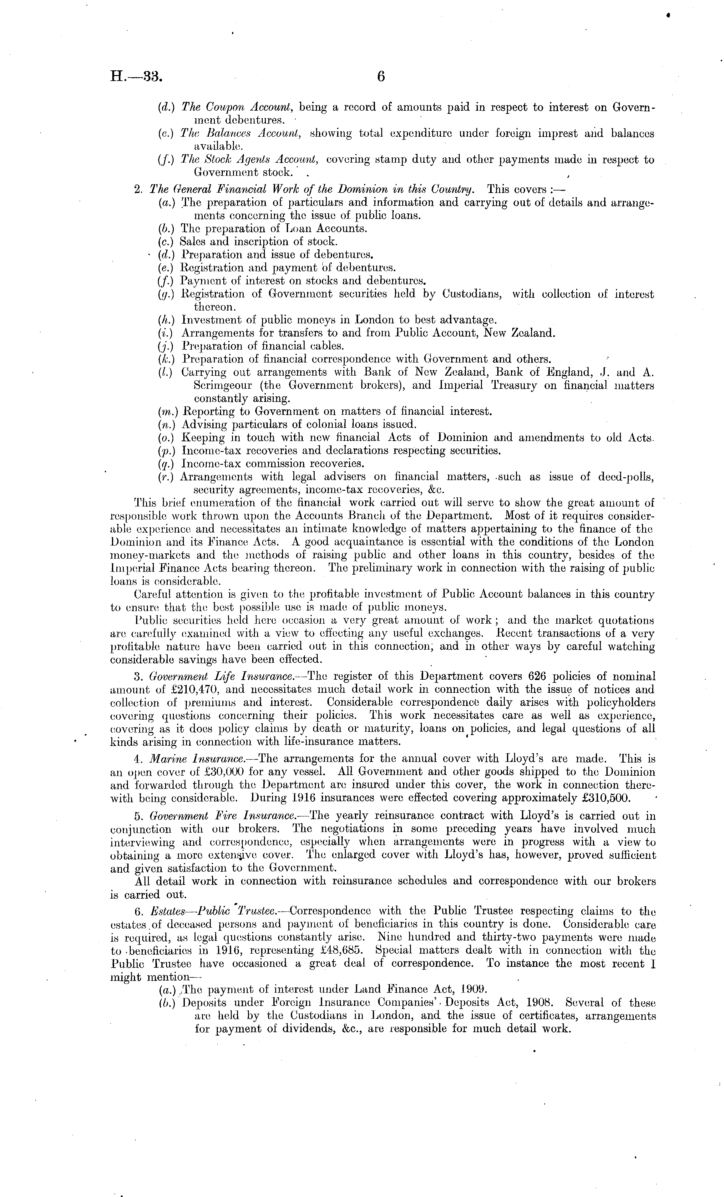 (d.) The Coupon Account, being a record of amounts paid in respect to interest on Government debentures. • (e.) The Balances Account, showing total expenditure under foreign imprest and balances available. (/.) The Stock Agents Account, covering stamp duty and other payments made in respect to Government stock. . , 2. The General Financial Work of the Dominion in this Country. This covers : — (a.) The preparation of particulars and information and carrying out of details and arrangements concerning the issue of public loans. (/;.) The preparation of Loan Accounts, (c.) Sales and inscription of stock. ■ (d.) Preparation and issue of debentures. (e.) Registration and payment of debentures. (/.) Payment of interest on stocks and debentures. (g.) Registration of Government securities held by Custodians, with collection of interest thereon. (h.) Investment of public moneys in London to best advantage. (i.) Arrangements for transfers to and from Public Account, New Zealand. (j.) Preparation of financial cables. (k.) Preparation, of financial correspondence with Government and others. (I.) Carrying out arrangements with Bank of New Zealand, Bank of England, J. and A. Sorimgeour (the Government brokers), and Imperial Treasury on financial matters constantly arising. (m.) Reporting to Government on matters of financial interest. (•».) Advising particulars of colonial loans issued. (o.) Keeping in touch with new financial Acts of Dominion and amendments to old Acts. (p.) Income-tax recoveries and declarations respecting securities. (q.) Income-tax commission recoveries. (»-.) Arrangements with legal advisers on financial matters, such, as issue of deed-polls, security agreements, income-tax recoveries, &c. This brief enumeration of the financial work carried out will serve to show the great amount of responsible work thrown upon the Accounts Branch of the Department. Most of it requires considerable experience and necessitates an intimate knowledge of matters appertaining to the finance of the Dominion and its Finance Acts. A good acquaintance is essential with the conditions of the London money-markets and the methods of raising public and other loans in this country, besides of the Imperial Finance Acts bearing thereon. The preliminary work in connection with the raising of public loans is considerable. Careful attention is given to the profitable investment of Public Account balances in this country to ensure that the best possible use is made of public moneys. Public securities held here occasion a very great amount of work ; and the market quotations are carefully examined with a view to effecting any useful exchanges. Recent transactions of a very profitable nature have been carried out in this connection, and in other ways by careful watching considerable savings have been effected. 3. Government Life Insurance.- The register of this Department covers 626 policies of nominal amount of £210,470, and necessitates much detail work in connection with the issue of notices and collection of premiums and interest. Considerable correspondence daily arises with policyholders covering questions concerning their policies. This work necessitates care as well as experience, covering as it does policy claims by death or maturity, loans on policies, and legal questions of all kinds arising in connection with life-insurance matters. 4. Marine Insurance. —The arrangements for the annual cover with Lloyd's are made. This is an open cover of £30,000 for any vessel. All Government and other goods shipped to the Dominion and forwarded through the Department are insured under this cover, the work in connection therewith being considerable. During 1916 insurances were effected covering approximately £310,500. 5. Government Fire Insurance. —The yearly reinsurance contract with Lloyd's is carried out in conjunction with our brokers. The negotiations in some preceding years have involved much interviewing and correspondence, especially when arrangements were in progress with a view to obtaining a more extensive cover. The enlarged cover with Lloyd's has, however, proved sufficient and given satisfaction to the Government. All detail work in connection with reinsurance schedules and correspondence with our brokers is carried out. 6. Estates — Publ/ic Trustee. —Correspondence with, the Public Trustee respecting claims to the estates.of deceased persons and payment of beneficiaries in this country is done. Considerable care is required, as legal questions constantly arise. Nine hundred and thirty-two payments were made to .beneficiaries in 1916, representing £48,685. Special matters dealt with in connection with the Public Trustee have occasioned a great deal of correspondence. To instance the most recent I might mention — (a.) ,The payment of interest under Land Finance Act, 1909. (b.) Deposits under Foreign Insurance Companies'• Deposits Act, 1908. Several of these are held by the Custodians in London, and the issue of certificates, arrangements for payment of dividends, &c, are responsible for much detail work.