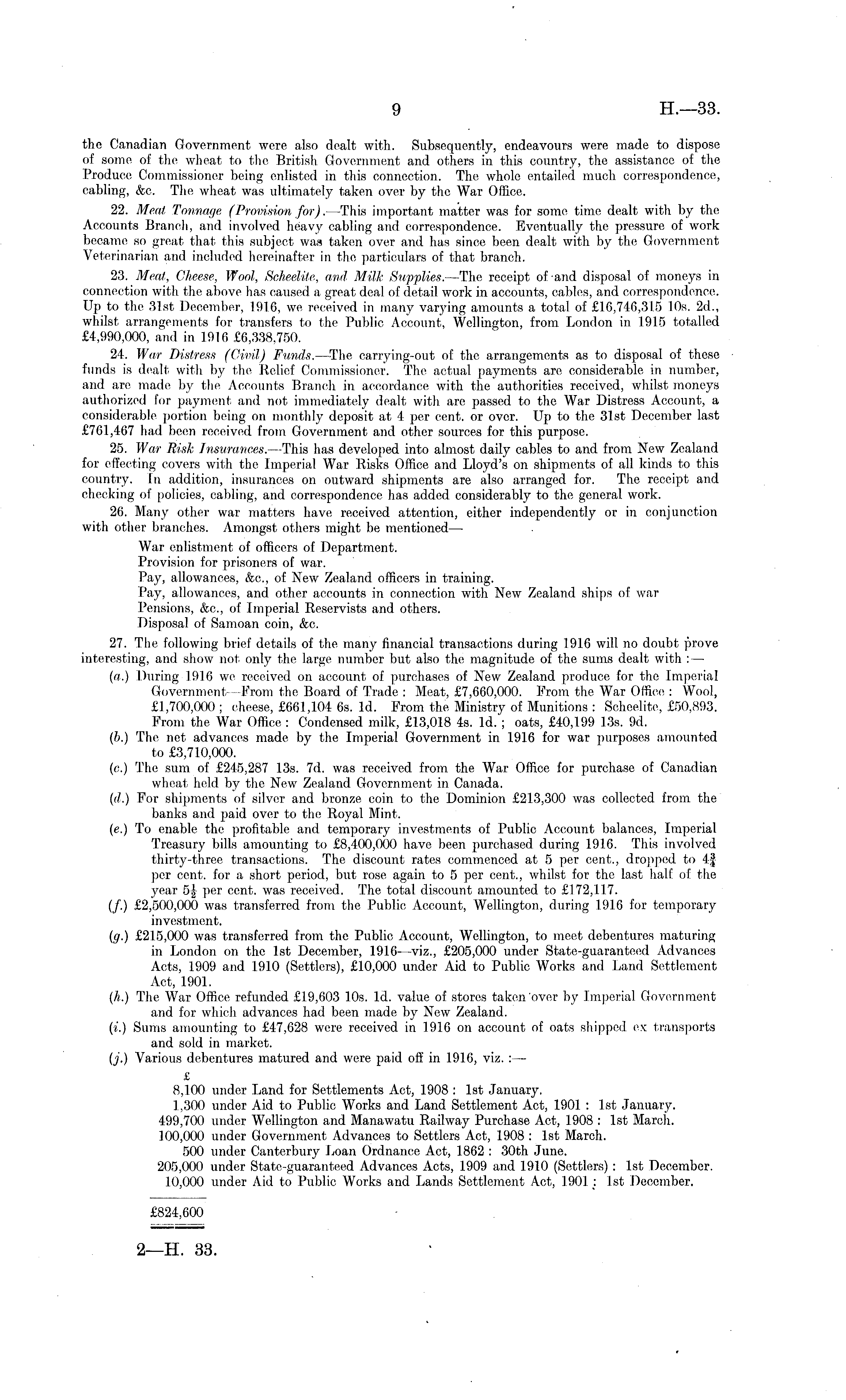 the Canadian Government were also dealt with. Subsequently, endeavours were made to dispose of some of the wheat to the, British. Government and others in this country, the assistance of the Produce Commissioner being enlisted in this connection. The whole entailed much correspondence, cabling, &c. The wheat was ultimately taken over by the War Office. 22. Meat Tonnage (Provision for). —This important matter was for some time dealt with by the Accounts Branch, and involved heavy cabling and correspondence. Eventually the pressure of work became so great that, this subject was taken over and has since been dealt with by the Government Veterinarian and included hereinafter in the particulars of that branch. 23. Meat, Cheese, Wool, Scheelile, and Milk Supplies. —The receipt of-and disposal of moneys in connection with the above has caused a great deal of detail work in accounts, cables, and correspondence. Up to the 31st December, 1916, we received in many varying amounts a total of £16,746,315 10s. 2d., whilst arrangements for transfers to the Public Account, Wellington, from London in 1915 totalled £4,990,000, and in 1916 £6,338,750. 24. War Distress (Civil) Funds. —The carrying-out of the arrangements as to disposal of these funds is dealt with by the Relief Commissioner. The actual payments are considerable in number, and are made by the Accounts Branch in accordance with the authorities received, whilst moneys authorized for payment and not immediately dealt with are passed to the War Distress Account, a considerable portion being on monthly deposit at 4 per cent, or over. Up to the 31st December last £761,467 had been received from Government and other sources for this purpose. 25. War Risk Insurances. —This has developed into almost daily cables to and from New Zealand for effecting covers with the Imperial War Risks Office and Lloyd's on shipments of all kinds to this country. In addition, insurances on outward shipments are also arranged for. The receipt and checking of policies, cabling, and correspondenee, has added considerably to the general work. 26. Many other war matters have received attention, either independently or in conjunction with other branches. Amongst others might be mentioned— War enlistment of officers of Department. Provision for prisoners of war. Pay, allowances, &c, of New Zealand officers in training. Pay, allowances, and other accounts in connection with New Zealand ships of war Pensions, &c, of Imperial Reservists and others. Disposal of Samoan coin, &c. 27. The following brief details of the many financial transactions during 1916 will no doubt prove interesting, and show not only the large number but also the magnitude of the sums dealt with : — (a.) During 1916 we received on account of purchases of New Zealand produce for the Imperial Government—From the Board of Trade : Meat, £7,660,000. From the War Office : Wool, £1,700,000 ; cheese, £661,104 6s. Id. From the Ministry of Munitions : Scheelite, £50,893. From the War Office : Condensed milk, £13,018 4s. Id. ; oats, £40,199 13s. 9d. (b.) The net advances made by the Imperial Government in 1916 for war purposes amounted to £3,710,000. (c.) The sum of £245,287 13s. 7d. was received from the War Office for purchase of Canadian wheat hold by the New Zealand Government in Canada. (d.) For shipments of silver and bronze coin to the Dominion £213,300 was collected from the banks and paid over to the Royal Mint, (e.) To enable the profitable and temporary investments of Public Account balances, Imperial Treasury bills amounting to £8,400,000 have been purchased during 1916. This involved thirty-three transactions. The discount rates commenced at 5 per cent., dropped to 4| per cent, for a short period, but rose again to 5 per cent., whilst for the last half of the year 5J per cent, was received. The total, discount amounted to £172,117. (/.) £2,500,000 was transferred from the Public Account, Wellington, during 1916 for temporary investment. (g.) £215,000 was transferred from the Public Account, Wellington, to meet debentures maturing in London on the Ist December, 1916 —viz., £205,000 under State-guaranteed Advances Acts, 1.909 and 1910 (Settlers), £10,000 under Aid to Public Works and Land Settlement Act, 1901. (h.) The War Office refunded £19,603 10s. Id. value of stores taken over by Imperial Government and for which advances had been made by Now Zealand. (i.) Sums amounting to £47,628 were received in 1916 on account of oats shipped ex transports and sold in market. (j.) Various debentures matured and were paid off in 1916, viz. : — ,c 8,100 under Land for Settlements Act, 1908 : Ist January. 1,300 under Aid to Public Works and Land Settlement Act, 1901 : Ist January. 499,700 under Wellington and Manawatu Railway Purchase Act, 1908 : Ist March. 100,000 under Government Advances to Settlers Act, 1908 : Ist March. 500 under Canterbury Loan Ordnance Act, 1862 : 30th June. 205,000 under State-guaranteed Advances Acts, 1909 and 1910 (Settlers) : Ist December. 10,000 under Aid to Public Works and Lands Settlement Act, 1901; Ist December. £824,600