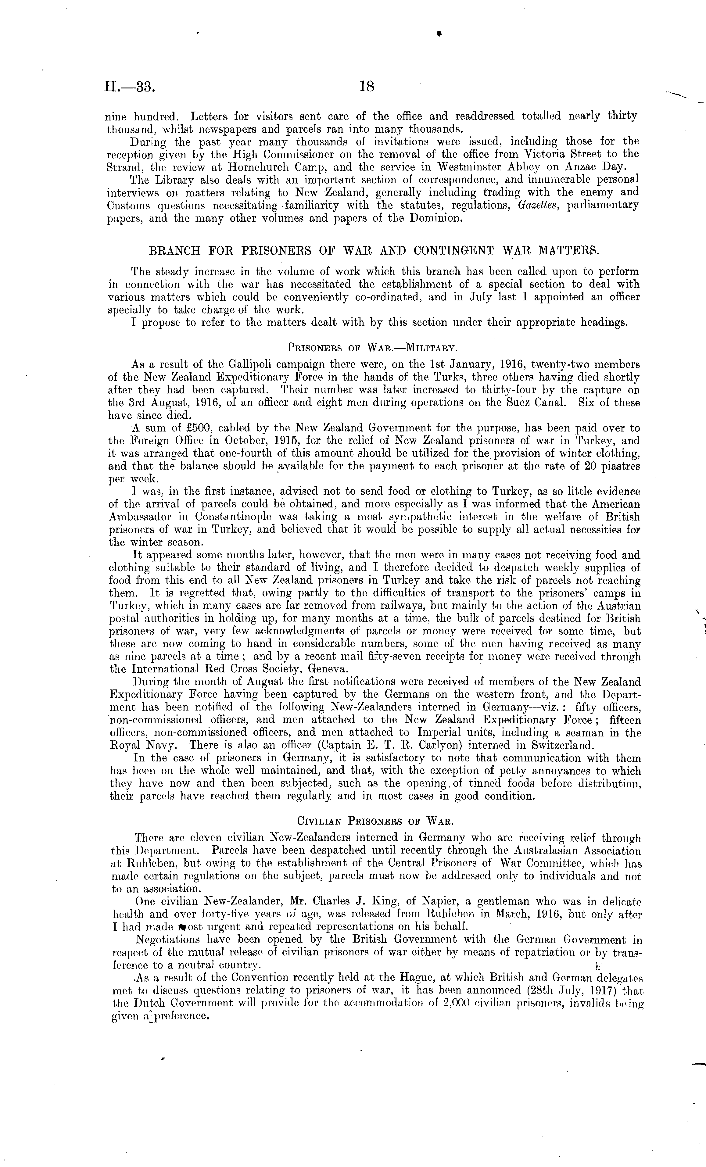 nine hundred. Letters for visitors sent care of the office, and readdressed totalled nearly thirty thousand, whilst newspapers and, parcels ran into many thousands. During the past year many thousands of invitations were issued, including those for the reception given by the High Commissioner on the removal of the office, from Victoria Street to the. Strand, the review at Ilornchurch Camp, and the service in Westminster Abbey on Anzac Day. The Library also deals with an important section of correspondence, and innumerable personal interviews on matters relating to New Zealand, generally including trading with the enemy and Customs questions necessitating familiarity with the statutes, regulations, Gazettes, parliamentary papers, and the many other volumes and papers of the Dominion, BRANCH FOR PRISONERS OF WAR AND CONTINGENT WAR MATTERS. The steady increase in the volume of work which this branch has been called upon to perform in connection with the war has necessitated the establishment of a special section to deal with various matters which could be conveniently co-ordinated, and in July last I appointed an officer specially to take charge of the work. I propose to refer to the matters dealt with by this section under their appropriate headings. Prisoners of War.—Military. As a result of the Gallipoli campaign there were, on the Ist January, 1916, twenty-two members of the New Zealand Expeditionary Force in the hands of the Turks, three others having died shortly after they had been captured. Their number was later increased to thirty-four by the capture on the 3rd August, 1916, of an officer and eight men during operations on the Suez Canal. Six of these have since died. A sum of £500, cabled by the New Zealand Government for the purpose, has been paid over to the Foreign Office in October, 1.915, for the relief of New Zealand prisoners of war in Turkey, and it was arranged that one-fourth of this amount should be utilized for the provision of winter clothing, and that the balance should be available for the payment to each prisoner at the rate of 20 piastres per week. I was, in the first instance, advised not to send food or clothing to Turkey, as so little evidence of the arrival of parcels could be obtained, and more especially as I was informed that the American Ambassador in Constantinople was taking a most sympathetic interest in the welfare, of British prisoners of war in Turkey, and believed that it would be possible to supply all actual necessities for the winter season. It appeared some months later, however, that the men were, in many cases not receiving food and clothing suitable to their standard of living, and I therefore decided to despatch weekly supplies of food from this end to all New Zealand prisoners in Turkey and take the risk of parcels not reaching them. It is regretted that, owing partly to the difficulties of transport to the prisoners' camps in Turkey, which in many cases are far removed from railways, but mainly to the action of the Austrian postal authorities in holding up, for many months at a time, the bulk of parcels destined for British prisoners of war, very few acknowledgments of parcels or money were received for some time, but these are now coming to hand in considerable numbers, some, of the men having received as many as nine parcels at a time ; and by a recent mail fifty-seven receipts for money were received through the International Red Cross Society, Geneva. During the month of August the first notifications were received of members of the New Zealand Expeditionary Force having been captured by the Germans on the western front, and the Department has been notified of the following New-Zealanders interned in Germany—viz. : fifty officers, non-commissioned officers, and men attached to the. New Zealand Expeditionary Force ; fifteen officers, non-commissioned officers, and men attached to Imperial units, including a seaman in the Royal Navy. There is also an officer (Captain E. T. R. Carlyon) interned in Switzerland. In the case of prisoners in Germany, it is satisfactory to note that communication with them has been on the whole well maintained, and that, with the exception of petty annoyances to which they have, now and. then been subjected, such as the opening.of tinned foods before distribution, their parcels have reached them regularly and in most cases in good condition. Civilian Prisoners of War. There are eleven civilian New-Zealanders interned in Germany who are receiving relief through this Department. Parcels have been despatched until recently through the Australasian Association at Ruhleben, but owing to the establishment of the Central Prisoners of War Committee, which has made certain regulations on the subject, parcels must now be addressed only to individuals and not to an association. One civilian New-Zealander, Mr. Charles J. King, of Napier, a gentleman who was in delicate health and over forty-five years of age, was released from Ruhleben in March, 1916, but only after I had made _iost urgent and repeated representations on his behalf. Negotiations have been opened by the British Government with the German Government in respect of the mutual release of civilian prisoners of war cither by means of repatriation or by transference to a neutral country. y ■As a result of the Convention recently held at the Hague, at which British and German delegates met to discuss questions relating to prisoners of war, it has been announced (28th July, 1917) that the Dutch Government will provide for the accommodation of 2,000 civilian prisoners, invalids being given a preference.