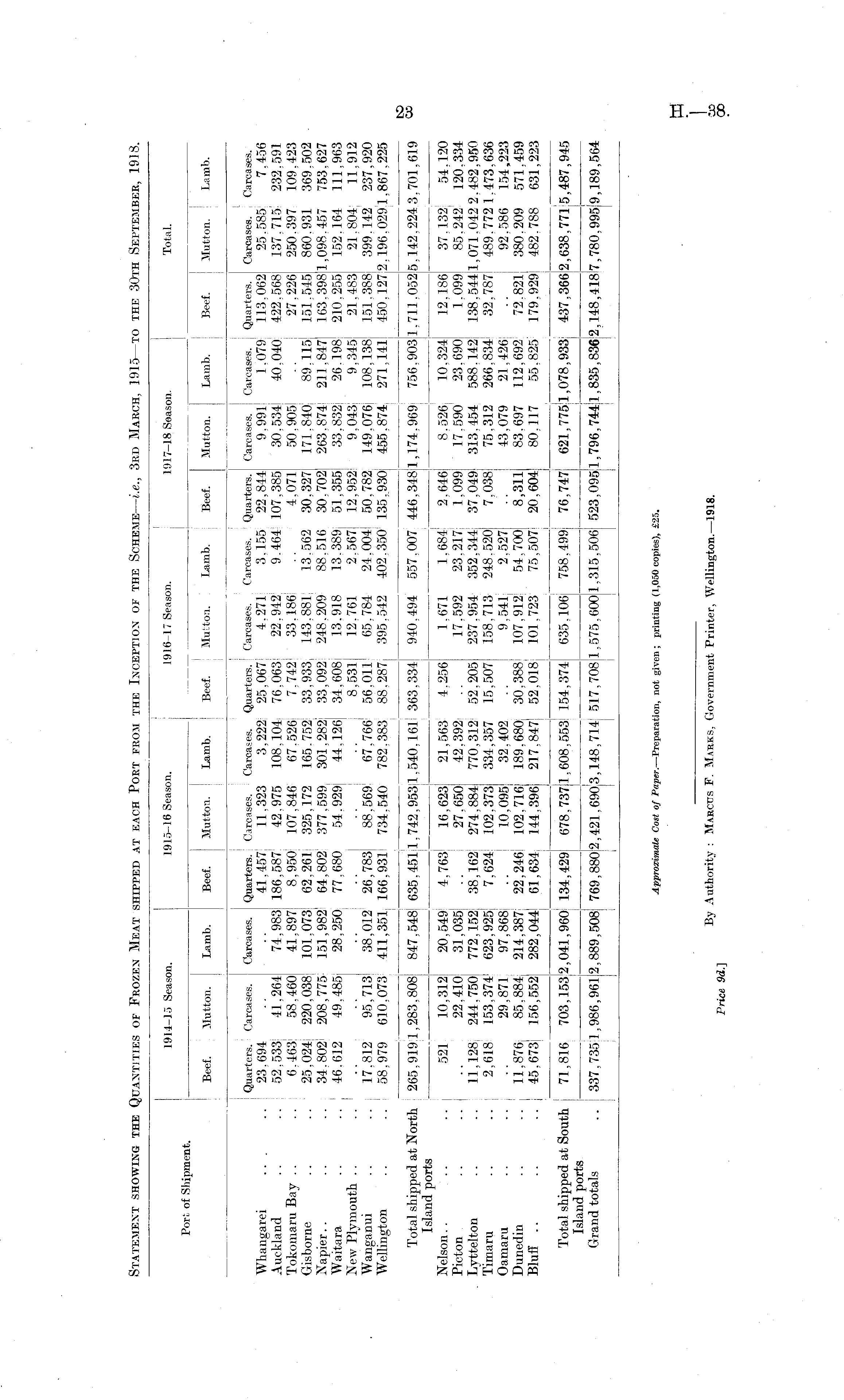 Port of Shipment. 1914-15 Season. 1915-16 Season. 1916-17 Season. 1917-18 Season. Total. Beef. Mutton. Lamb. Beef. Mutton. Lamb. Beef. | Mutton. Lamb. Beef. Mutton. Lamb. Beef. Mutton. Lamb. Quarters. Carcases. Whangarei 23.694 Auckland .. .. 52,533 41.264 Tokomaru Bay .. .. : 6.463! 58,460 Gisborne .. .. 25.024 220.038 Napier.. .. .. 34.802 208,775 Waitara .. . ' 46,612 49,485 New Plymouth .. .. ' Wanganui .. .. 17.812 95,713 Wellington .. .. I 58,979 610,073 Carcases. I Quarters. Carcases. Carcases. Quarters. 41,457 11.323 3,222 25.067 74,983 186,587 42.975 108.104 76.063 41.897 8,950 107.846 67.526 7.742 101,073 62,261 325.172 165.752 33,933 151,982 64.802 377.599 301.282 33.092 28.250 77.680 54.929! 44.126! 34.608 8,531 38,012 26,783J 88.569 67.766 56.011 411,351, 166.931 734.540 782.383 88.287, t arcases. 4.271 22.942 33.186 143.881 248.209 13.918 12.761 65.784 395.542 L Carcases. Quarters. 3.155 22,844 9.464 107.385 4,071 13.562 30.327 88.516 30.702 13.389 51.355 2.567 12.952 24.004 50.782 402.350 135.930 Carcases. Carcases. Quarters. 9.991 1,079 113.062 30.534 40.040 422.568 50,905 .. 27.226 171.840 89.115 151.545 263.874 211.847 163.398 33.832 26.198 210.255 9.043 9.345 21.483 149.076! 108.138 151.388 455,874, 271,141 450,127 : Carcases. Carcases. 25.585 7,456 137.715: 232.591 250.397 109.423 860.931 369.502 1.098.457 753.627 152.164 111,963 21.804 11,912 399.142 237.920 2.196.0291.867.225 ! ■ • Total shipped at North 265,919:1,283,808 Island ports : ! Nelson.. ... .. 521 10,312 Picton .. .. j .. 22,410 Lvttelton .. .. 11,128 244.750 Timaru .. .. 2,618 153,374 Oamaru .. .. .. 29,871! Dunedin .. .'. 11,876. 85,884 Bluff .. .. .'.- 45,673! 156,552 847,548 635,4511, 742,953|1, 540,1611 363,334 ! i 20,549 4.763 1 16.623 21,563 4.256 31.035 .. 27.650 42.392 772,152 38,162 274.884 770,312 52,205 623,925 7,624 102,373 334,357 15,507 97,868 .. 10.095 32.402 214.387 22,246 102.716 189.680 30.388 282.044 61.634 144.396 217,847! 52.018: 1,540,161 363,334 21,563 42.392 770,312 334.357 32.402 189.680 217.847 4,256 52.205 15,507 30.388 52,018, 940,494 1.671 17.592 237.954 158.713 9.541 107.912 101.723 557,007 446,3481,174,969| L 1.684 23,217J 352.344 248.520 2.527 54,700 75.507 2.646 8.526, 1,099 17.590' 37,049 313.454 7.038! 75.312 43,079 8,311 83.697 20,604| 80.117 756,9031,711,052 10,324 23.690 588.1421 266.834 21,426 112,692 55,825 12.186 1.099 138.544! 32,787i 72.821! 179,929! 5,142,224 3,701,61 37.132 54.12( 85.242 120.33' 1,071,042 2.482.951 489.772 1.473.631 92.586 154,22; 380.209 571.45! 482.788 631.22; Total shipped at South 71,816 703,1532 Island ports ! Grand totals .. 337, 735 1,986, 961 2 2,041,960 134,429! 2,041,960 134,429 678,7371,608,553 154,374 2.889.508 769.8802,421.6903,148,714! 517,708 678,737! 1,608,553 154,374 635,106 758.499 76,747. 621,775;l,078,933 437,366:2, 638,7715, 487, 94E ■ i 2,889,508 769, 880 2,421, 690,3, 148, 714 517,708 1,575,600! 1,315,506 523,095|1, 796,7441,835,83612,148,418 7,780, 995 9,189,56' i