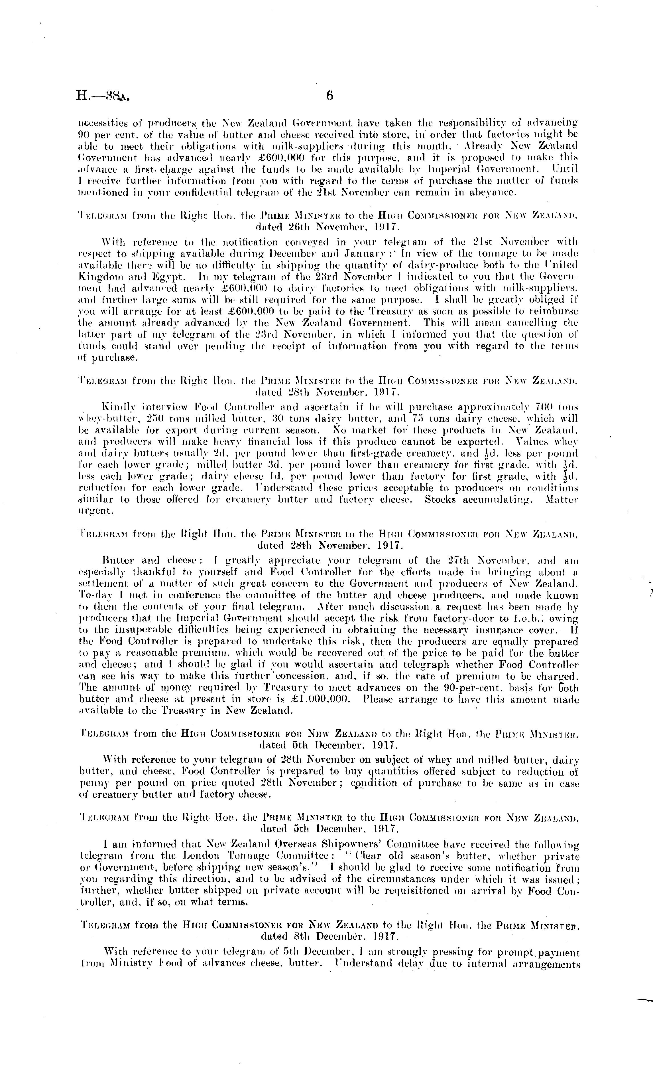 necessities of producers the New Zealand (iovernment have taken the responsibility of advancing 90 per cent, of the value of butter and cheese received into store, in order that factories might be able to meet their obligations with milk-suppliers during this month. Already New Zealand (iovernment has advanced nearly £600.000 for this purpose, and it is proposed to make this advance a first-charge against the funds to be made available by Imperial Government. Until 1 receive further information from you with regard to the terms of purchase the matter of funds mentioned in your confidential telegram of the 21st November can remain in abeyance. Telegram from the Right Hon. the Prime Minister to the High Commissioner for New Zealand. dated 26th November. 1917. With reference to tin.' notification conveyed in your telegram of the 21st November with respect to-shipping available during December and January: In view of the tonnage to lie made available thci".' will be no difficulty in shipping the quantity of dairy-produce both to the United Kingdom and Egypt. In my telegram of the 23rd November I indicated to you that the (iovernment had advamed nearly £600,000 to dairy factories to meet obligations with milk-suppliers, and further large sums will be still required for the same purpose. I shall be greatly obliged if you will arrange lor at least ,£600.000 to lie paid to the Treasury as soon as possible to reimburse the amount already advanced by the New Zealand Government. This will mean cancelling the latter part of my telegram of the 23rd November, in which I informed you that the question of funds could stand over pending the receipt of information from you with regard to the terms of purchase. Telegram from the Right Hon. the Prime Minister to the High Commissioner for New Zealand. dated 28th November. 1917. Kindly interview Food Controller and ascertain if be will purchase approximately 700 tons whey-butter. 250 tons milled butter, .30 tons dairy butter, and 75 lons dairy clieese. which will be available for export during current season. No market for these products in New Zealand, and producers will make heavy financial loss if this produce cannot be exported. Values whey and dairy butters usually 2d. per pound lower than first-grade creamery, and Ad. less per pound lor each lower grade; milled butter -"id. per pound lower than creamery for first grade, with id. less each lower grade; dairy cheese Id. per pound lower than factory for first grade, with id. reduction for each lower grade. Understand these prices acceptable to producers on conditions similar to those offered for creamery butter and factory cheese. Stocks accumulating. Matter urgent. Telegram from the Right Hon. the Prime Minister to the High Commissioner for New Zealand, dated 28th November. 1917. Butter and cheese : I greatly appreciate your telegram of the 27th November, and am especially thankful to yourself and Food Controller for the efforts made in bringing about a settlement of a matter of such great, concern to the Government and producers of New Zealand. To-day I met in conference the committee of the butter and cheese producers, and made known to them the contents of your final telegram. After much discussion a request has been made by producers that the Imperial Government should accept the risk from factory-door to f.0.b., owing to the insuperable difficulties being experienced iv obtaining the necessary insurance cover. \( the Food Controller is prepared to undertake this risk, then the producers are equally prepared to pay a reasonable premium, which would be recovered out of the price to be paid for the butter and cheese; and I should be glad if you would ascertain and telegraph whether Food Controller can see his way to make this further concession, and. if so, the rate of premium to be charged. The amount of money required by Treasury to meet advances on the 90-per-ceiit. basis for Goth butter and cheese at present in store is £1,000,000. Please arrange to have this amount made available to the Treasury in New Zealand. Telegram from the High Commissioner for New Zealand to the Right Hon. the Prime Minister. dated sth December, 1917. With reference to your telegram of 28th November on subject of whey and milled butter, dairy butter, and cheese, Food Controller is prepared to buy quantities offered subject to reduction of penny per pound on price quoted 28th November ; condition of purchase to be same as in case of creamery butter and factory cheese. Telegram, from the Right Hon. the Prime Minister to the High Commissioner for New Zealand, dated sth December. 1917. I am informed that New Zealand Overseas Shipowners' Committee have received the following telegram from the London Tonnage Committee: ''Clear old season's butter, whether private or (iovernment. before shipping new season's." I should be glad to receive some notification from you regarding this direction, and to be advised of the circumstances under which it was issued; further, whether butter shipped on private account will be requisitioned on arrival by Food Controller, and, if so, on what terms. Telegram from the High Commissioner for New Zealand to the Bight Hon. the Prime Minister. dated Bth December, 1917. With reference to your telegram of sth December, 1 am strongly pressing for prompt pavuient from Ministry lood of advances cheese, butter. Understand delay clue to internal arrangements