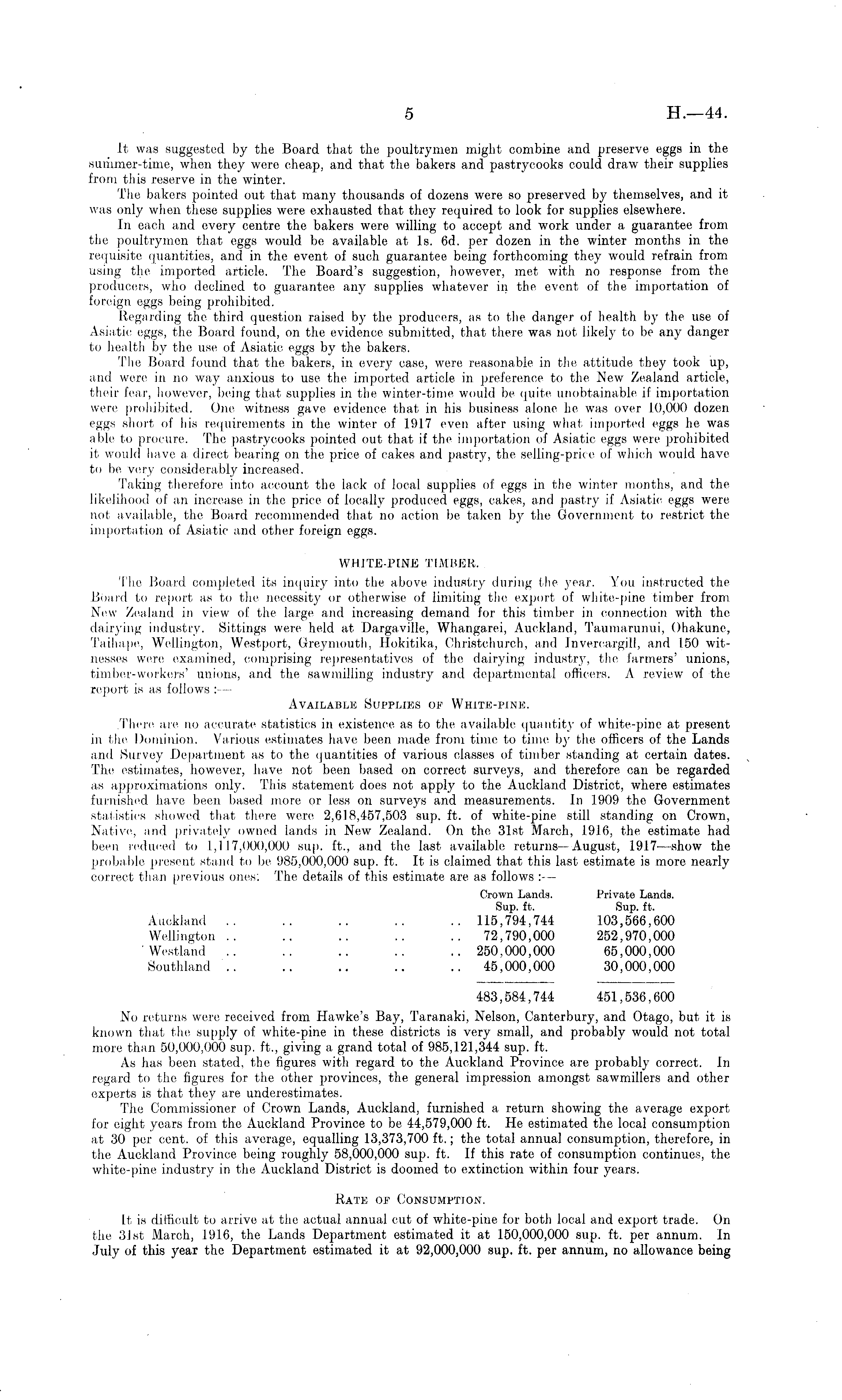 It was suggested by the Board that the poultrymen might combine and preserve eggs in the summer-time, when they were cheap, and that the bakers and pastrycooks could draw their supplies from this reserve in the winter. The bakers pointed out that many thousands of dozens were so preserved by themselves, and it was only when these supplies were exhausted that they required to look for supplies elsewhere. In each and every centre the bakers were willing to accept and work under a guarantee from the poultrymen that eggs would be available at Is. 6d. per dozen in the winter months in the requisite quantities, and in the event of such guarantee being forthcoming they would refrain from using the imported article. The Board's suggestion, however, met with no response from the producers, who declined to guarantee any supplies whatever in the event of the importation of foreign eggs being prohibited. Regarding the third question raised by the producers, as to the danger of health by the use of Asiatic eggs, the Board found, on the evidence submitted, that there was not likely to be any danger to health by the use of Asiatic eggs by the bakers. The Board found that the bakers, in every ease, were reasonable in the attitude they took up, and were in no way anxious to use the imported article in preference to the New Zealand article, their fear, however, being that supplies in the winter-time would be quite unobtainable if importation were prohibited. One witness gave evidence that in his business alone he was over 10,000 dozen eggs short of his requirements in the winter of 1917 even after using what imported eggs he was able to procure. The pastrycooks pointed out that if the importation of Asiatic eggs were prohibited it, would have a direct bearing on the price of cakes and pastry, the selling-price of which would have to be very considerably increased. Taking therefore into account the lack of local supplies of eggs in the winter months, and the likelihood of an increase in the price of locally produced eggs, cakes, and pastry if Asiatic eggs were not available, the Board recommended that no action be taken by the Government to restrict the importation of Asiatic and other foreign eggs. WHITE-PINE TIMBER, The Board completed its inquiry into the above industry during the year. You instructed the Board to report as to the necessity or otherwise of limiting the export of white-pine timber from New Zealand in view of the large and increasing demand for this timber in connection with the dairying industry. Sittings were held at Dargaville, Whangarei, Auckland, Taumarunui, Ohakunc, Taihape, Wellington, Westport, Greymouth, Hokitika, Christchurch, and Invercargill, and 150 witnesses were examined, comprising representatives of the dairying industry, the farmers' unions, timber-workers' unions, and the sawmilling industry and departmental officers. A review of the report is as follows : — Available Supplies of White-pine. .There are no accurate statistics in existence as to the available quantity of white-pine at present in the Dominion. Various estimates have been made from time to time by the officers of the Lands and Survey Department as to the quantities of various classes of timber standing at certain dates. The estimates, however, have not been based on correct surveys, and therefore can be regarded as approximations only. This statement does not apply to the Auckland District, where estimates furnished have been based more or less on surveys and measurements. In 1909 the Government statistics showed that there were. 2,618,457,503 sup. ft. of white-pine still standing on Crown, Native, and privately owned lands in New Zealand. On the 31st March, 1916, the estimate had been reduced to 1,117,000,000 sup, ft., and the last available returns- August, 1917 —show the probable present stand to be 985,000,000 sup. ft. It is claimed that this last estimate is more nearly correct than previous ones". The details of this estimate are as follows : — Grown Lands. Privato Lands. Sup. ft. Sup. ft. Auckland .. .. .. .. .. 115,794,744 103,566,600 Wellington .. .. .. .. .. 72,790,000 252,970,000 ' Westland .. .. .. .. ..250.000,000 65,000,000 Southland '.. .. .. .. .. 45,000,000 30,000,000 483,584,744 451,536,600 No returns were received from Hawke's Bay, Taranaki, Nelson, Canterbury, and Otago, but it is known that the supply of white-pine in these districts is very small, and probably would not total more than 50,000,000 sup. ft., giving a grand total of 985,121,344 sup. ft. As has been stated, the figures with regard to the Auckland Province are probably correct. In regard to the figures for the other provinces, the general impression amongst sawmillers and other experts is that they are underestimates. The Commissioner of Crown Lands, Auckland, furnished a return showing the average export for eight years from the Auckland Province to be 44,579,000 ft. He estimated the local consumption at 30 per cent, of this average, equalling 13,373,700 ft.; the total annual consumption, therefore, in the Auckland Province being roughly 58,000,000 sup. ft. If this rate of consumption continues, the white-pine industry in the Auckland District is doomed to extinction within four years. Rate op Consumption. It is difficult to arrive at the actual annual cut of white-pine for both local and export trade. On the 31st March, 1916, the Lands Department estimated it at 150,000,000 sup. ft. per annum. In July of this year the Department estimated it at 92,000,000 sup. ft. per annum, no allowance being