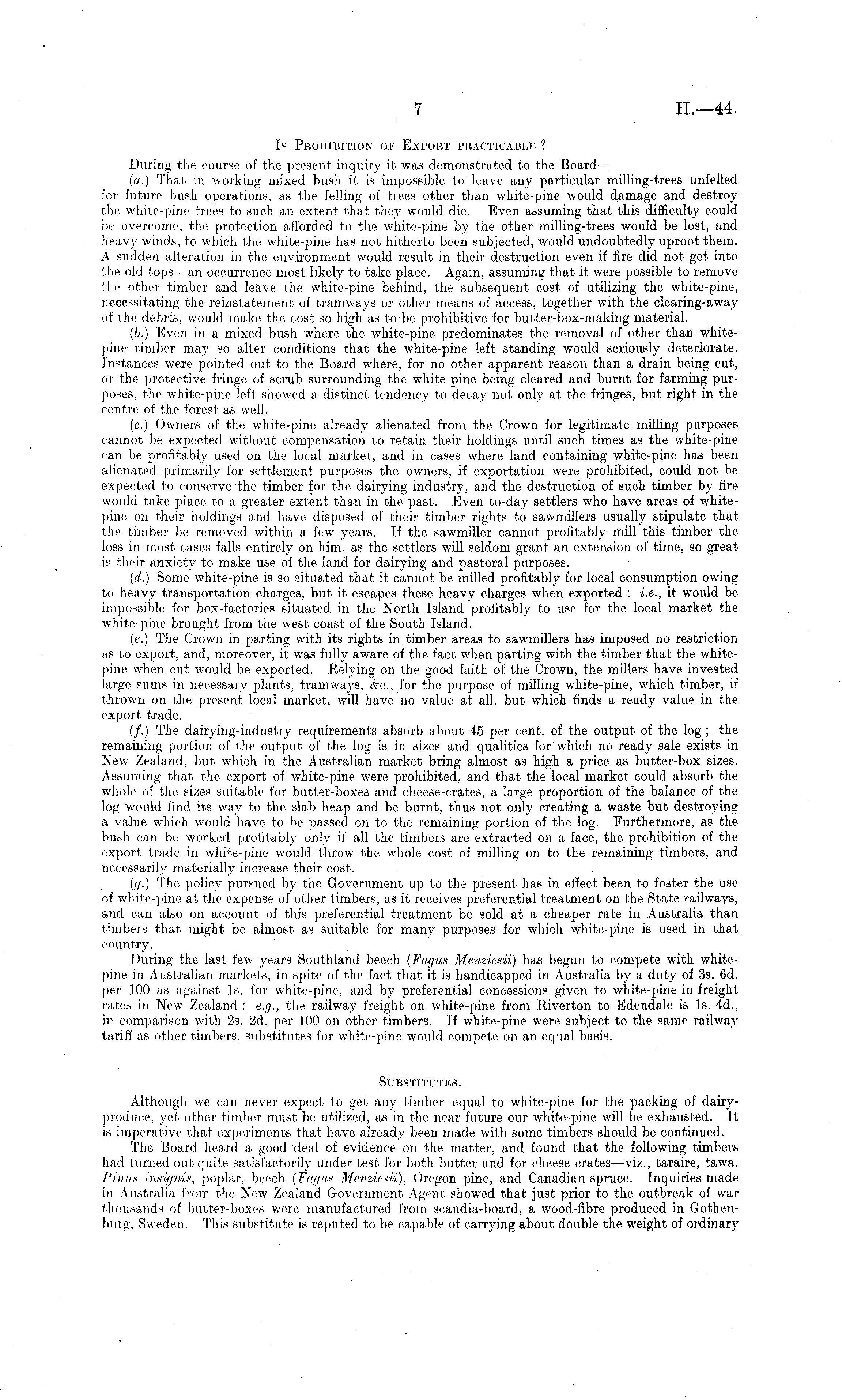 Is Prohibition of Export practicable ? During the course of the present inquiry it was demonstrated to the Board(a.) That in working mixed bush it is impossible to leave any particular milling-trees unfelled for future bush operations, as the, felling of trees other than white-pine would damage and destroy the white-pine trees to such an extent that they would die, Even assuming that this difficulty could be overcome, the protection afforded to the white-pine by the other milling-trees would be lost, and heavy winds, to which the white-pine has not hitherto been subjected, would undoubtedly uproot them. A sudden alteration in the, environment would result in their destruction even if fire did not get into the old tops —an occurrence most likely to take place, Again, assuming that it were possible to remove the other timber and leave the white-pine behind, the subsequent cost of utilizing the, white-pine, necessitating the reinstatement of tramways or other means of access, together with the clearing-away of the debris, would make the cost so high as to be prohibitive for butter-box-making material. (6.) Even in a mixed bush where the white-pine predominates the removal of other than whitepine timber may so alter conditions that the white-pine left standing would seriously deteriorate. Instances were pointed out to the Board where, for no other apparent reason than a drain being cut, or the protective fringe of scrub surrounding the white-pine being cleared and burnt for farming purposes, the white-pine left showed a distinct tendency to decay not only at the fringes, but right in the centre of the forest as well. (c.) Owners of the white-pine already alienated from the Crown for legitimate milling purposes cannot be expected without compensation to retain their holdings until such times as the white-pine can be profitably used on the local market, and in cases where land containing white-pine has been alienated primarily for settlement purposes the owners, if exportation were prohibited, could not be expected to conserve the timber for the dairying industry, and the destruction of such timber by fire would take place to a greater extent than in the past. Even to-day settlers who have areas of whitepine on their holdings and have disposed of their timber rights to sawmillers usually stipulate that the timber be removed within a few years. If the sawmiller cannot profitably mill this timber the loss in most cases falls entirely on him, as the settlers will seldom grant an extension of time, so greatis their anxiety to make use of the land for dairying and pastoral purposes. (d.) Some white-pine is so situated that it cannot be milled profitably for local consumption owing to heavy transportation charges, but it escapes these heavy charges when exported : i.e., it would be impossible for box-factories situated in the North Island profitably to use for the local market the white-pine brought from the west coast of the South Island. (e.) The Crown in parting with its rights in timber areas to sawmillers has imposed no restriction as to export, and, moreover, it was fully aware of the fact when parting with the timber that the whitepine when cut would be exported. Relying on the good faith of the Crown, the millers have invested large sums in necessary plants, tramways, &C, for the purpose of milling white-pine, which timber, if thrown on the present local market, will have no value at all, but which finds a ready value in the export trade. (/.) The dairying-industry requirements absorb about 15 per cent, of the output of the log; the remaining portion of the output of the log is in sizes and qualities for which no ready sale exists in New Zealand, but which in the Australian market bring almost as high a price as butter-box sizes. Assuming that the export of white-pine were prohibited, and that the local market could absorb the whole of the sizes suitable for butter-boxes and cheese-crates, a large proportion of the balance of the log would find its way to the slab heap and be burnt, thus not only creating a waste but destroying a value which would have to be passed on to the remaining portion of the log. Furthermore, as the bush can bo worked profitably only if all the timbers are extracted on a face, the prohibition of the export trade in white-pine would throw the whole cost of milling on to the remaining timbers, and necessarily materially increase their cost. (g.) The policy pursued by the, Government up to the present has in effect been to foster the use of white-pine at the expense of other timbers, as it receives preferential treatment on the State railways, and can also on account of this preferential treatment be sold at a cheaper rate in Australia than timbers that might be almost as suitable for many purposes for which white-pine is used in that country. During the last few years Southland beech (Fagus Menziesii) has begun to compete with whitepine in Australian markets, in spite of the fact that it is handicapped in Australia by a duty of 3s. 6d. per ]00 as against Is. for white-pine, and by preferential concessions given to white-pine in freight rates in New Zealand : e.g., the railway freight on white-pine from Riverton to Edendale is Is. 4d., in comparison with 2s. 2d. per 100 on other timbers. If white-pine were subject to the same railway tariff as other timbers, substitutes for white-pine would compete on an equal basis. Substitutes. Although we can never expect to get any timber equal to white-pine for the packing of dairyproduce, yet other timber must be utilized, as in the near future our white-pine will be exhausted. It is imperative that experiments that have already been made with some timbers should be continued. The Board heard a good deal of evidence on the matter, and found that the following timbers had turned out quite satisfactorily under test for both butter and for cheese crates —viz., taraire, tawa, Pinus insignis, poplar, beech (Fagus Menziesii), Oregon