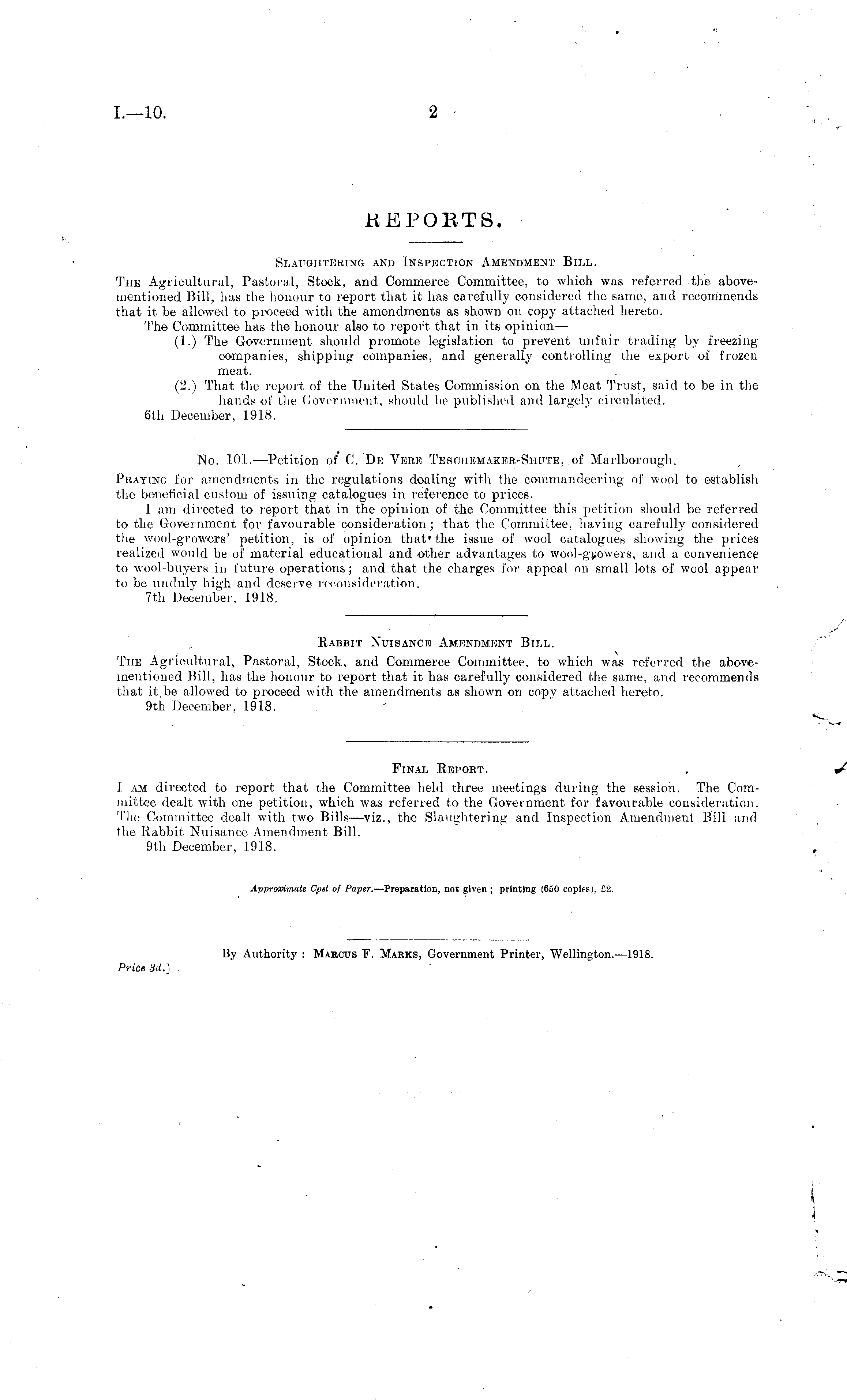 KEPOETS. SLAUGHTERING AND INSPECTION AMENDMENT BII.L. The Agricultural, Pastoral, Stock, and Commerce Committee, to which was referred the abovementioned Bill, has the honour to report that it has carefully considered the same, and recommends that it be allowed to proceed with the amendments as shown on copy attached hereto. The Committee has the honour also to report that in its opinion— (1.) The Government should promote legislation to prevent unfair trading by freezing companies, shipping companies, and generally controlling the export of frozen meat. (2.) That the report of the United States Commission on the Meat Trust, said to be in (he hands of the Government, should be published and largely circulated. 6th December, 1918.
