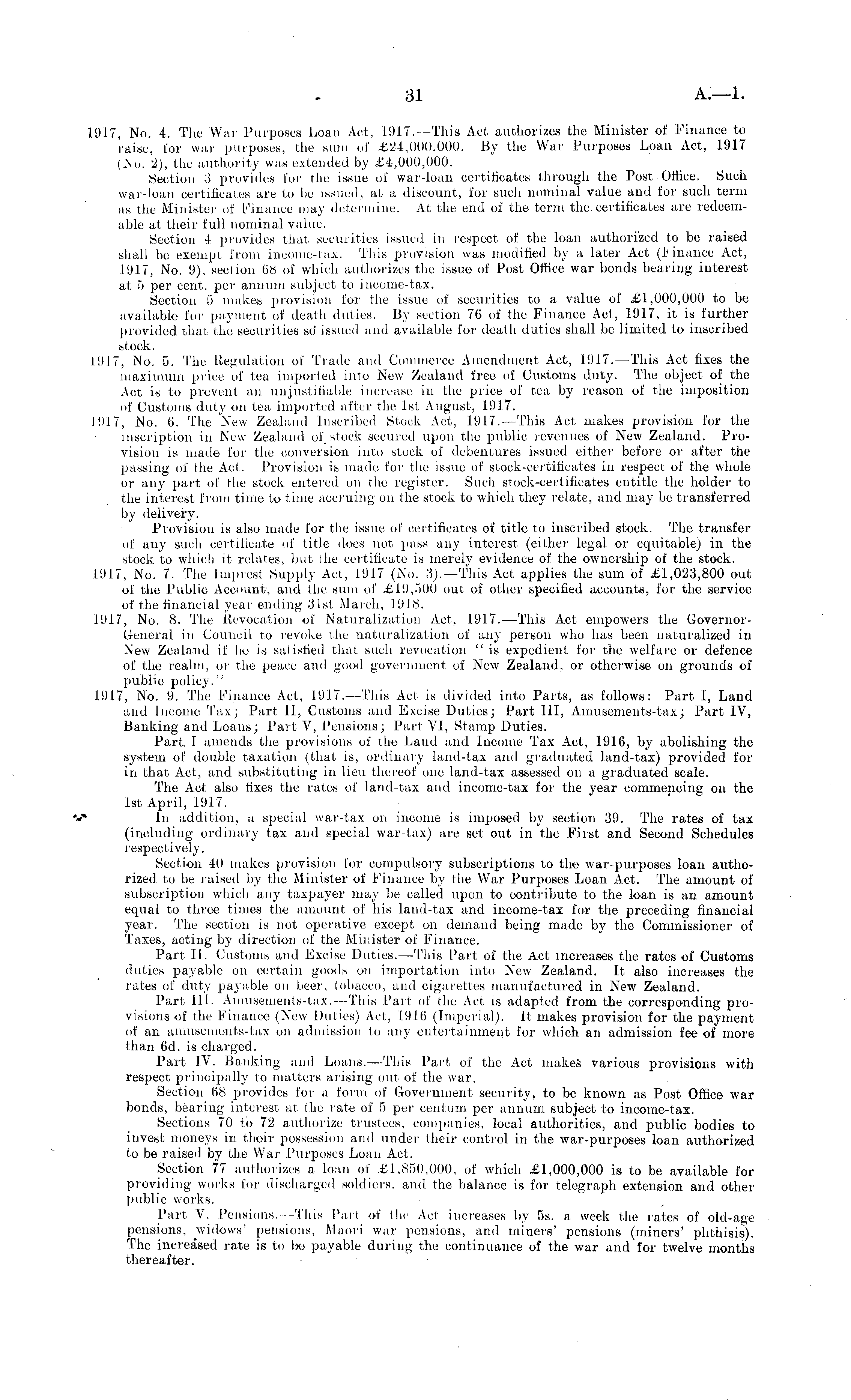 1917, No. 4. The War Purposes Loan Act, 1917. -This Act authorizes the Minister of Finance to raise, for war purposes, the sum of £24,000,000. By the War Purposes Loan Act, 1917 (No. 2), the authority was extended by £4,000,000. Section '■> provides lot the issue of war-loan certificates through the Post Office. Such war-loan certificates are lo lie issued, at a discount, for such nominal value and for such term as the Minister of Finance may determine. At the end of the term the certificates are redeemable at their full nominal value. Section 4 provides lh.it securities issued in respect of the loan authorized to be raised shall be exempt from income-tax. This provision was modified by a later Act (Finance Act, 1917, No. 9), section 68 of which authorizes the issue of Post Office war bonds bearing interest at 5 per cent, per annum subject to income-tax. Section 5 makes provision lor the issue of securities to a value of £1,000,000 to be available for payment of death duties. By section 7(i of the Finance Act, 1917, it is further provided that the securities so issued and available for death duties shall be limited to inscribed stock. 1917, No. 5. The Regulation of Trade and Commerce Amendment Act, 1917.—This Act fixes the maximum price of tea imported into New Zealand free of Customs duty. The object of the Act is to prevent an unjust i liable increase in the price of tea by reason of the imposition of Customs duty on tea imported after the Ist August, 1917. 1917, No. G. The New Zealand Inscribed Stock Act, 1917.—This Act makes provision for the inscription in New Zealand of, stock secured upon the public revenues of New Zealand. Provision is made for the (-(inversion into stuck of debentures issued either before or after the passing of Hie Act. Provision is made for the issue of stock-certificates in respect of the whole or any part of the stock entered on the register. Such stock-ccrtiticatcs entitle the holder to the interest from time to time accruing on the stock to which they relate, and may be transferred by delivery. Provision is also made for the issue of certificates of title to inscribed stock. The transfer of any such certificate of title does not pass any interest (either legal or equitable) in the stock to which it relates, but the certificate is merely evidence of the ownership of the stock. 1917, No. 7. The Imprest Supply Act, 1917 (No. 3).—This Act applies the sum of £1,023,800 out of the Public Account, and the sum of £19,500 out of other specified accounts, for the service of the financial year ending 3 Ist March, 1918. 1917, No. 8. The Revocation of Naturalization Act, 1917.—This Act empowers the GovernorGeneral in Council to revoke the naturalization of any person who has been naturalized in New Zealand if he is satisfied that such revocation " is expedient for the welfare or defence of the realm, or the peace and good government of New Zealand, or otherwise on grounds of public policy." 1.917, No. 9. The Finance Act, 1917.—This Act is divided into Parts, as follows: Part I, Land and Income Tax; Part 11, Customs and Excise Duties; Part 111, Amusements-tax; Part IV, Ranking and Loans; Part V, Pensions; Pari VI, Stamp Duties. Part. I amends the provisions of the Land and Income Tax Act, 1916, by abolishing the system of double taxation (that is, ordinary land-tax and graduated land-tax) provided for in that Act, and substituting in lieu thereof one land-tax assessed on a graduated scale. The Act, also fixes the rates of land-tax ami income-tax for the year commencing on the Ist April, 1917. *«" In addition, a special war-tax on income is imposed by section 39. The rates of tax (including ordinary tax and special war-tax) are set out in the First and Second Schedules respectively. Section 40 makes provision lor compulsory subscriptions to the war-purposes loan authorized to be raised by the Minister of Finance by the War Purposes Loan Act. The amount of subscription which any taxpayer may be called upon to contribute to the loan is an amount equal to three times the amount of his land-tax and income-tax for the preceding financial year. The section is not operative except on demand being made by the Commissioner of Taxes, acting by direction of the Minister of Finance. Part 11. Customs and Excise Duties.—This Part of the Act increases the rates of Customs duties payable on certain goods on importation into New Zealand. It also increases the rates of duty payable on beer, tobacco, and cigarettes manufactured in New Zealaud. Part 111. Amusements-tax. This Part of the Act is adapted from the corresponding provisions of the Finance (New Duties) Act, 19 I(i (Imperial). It makes provision for the payment of an amusements tax on admission to any entertainment for which an admission fee of more than 6d. is charged. Part IV. Banking and Loans.—This Part of the Act makes various provisions with respect principally to matters arising out of the war. Section 68 provides for a form of Government security, to be known as Post Office war bonds, bearing interest at the rate of 5 per centum per annum subject to income-tax. Sections 70 to 72 authorize trustees, companies, local authorities, and public bodies to invest moneys in their possession and under (heir control in the war-purposes loan authorized to be raised by the War Purposes Loan Act. Section 77 authorizes a loan of £1.850,000, of which £1,000,000 is to be available for providing works I'm- discharged soldiers, and the balance is for telegraph extension and other public works. Part V. Pensions.--This Part of the Act increases by ss. a week the rates of old-age (tensions, widows' pensions, Maori war pensions, and miners' pensions (miners' phthisis). The increased rate is to lie payable during the continuance of the war and for twelve months thereafter.
