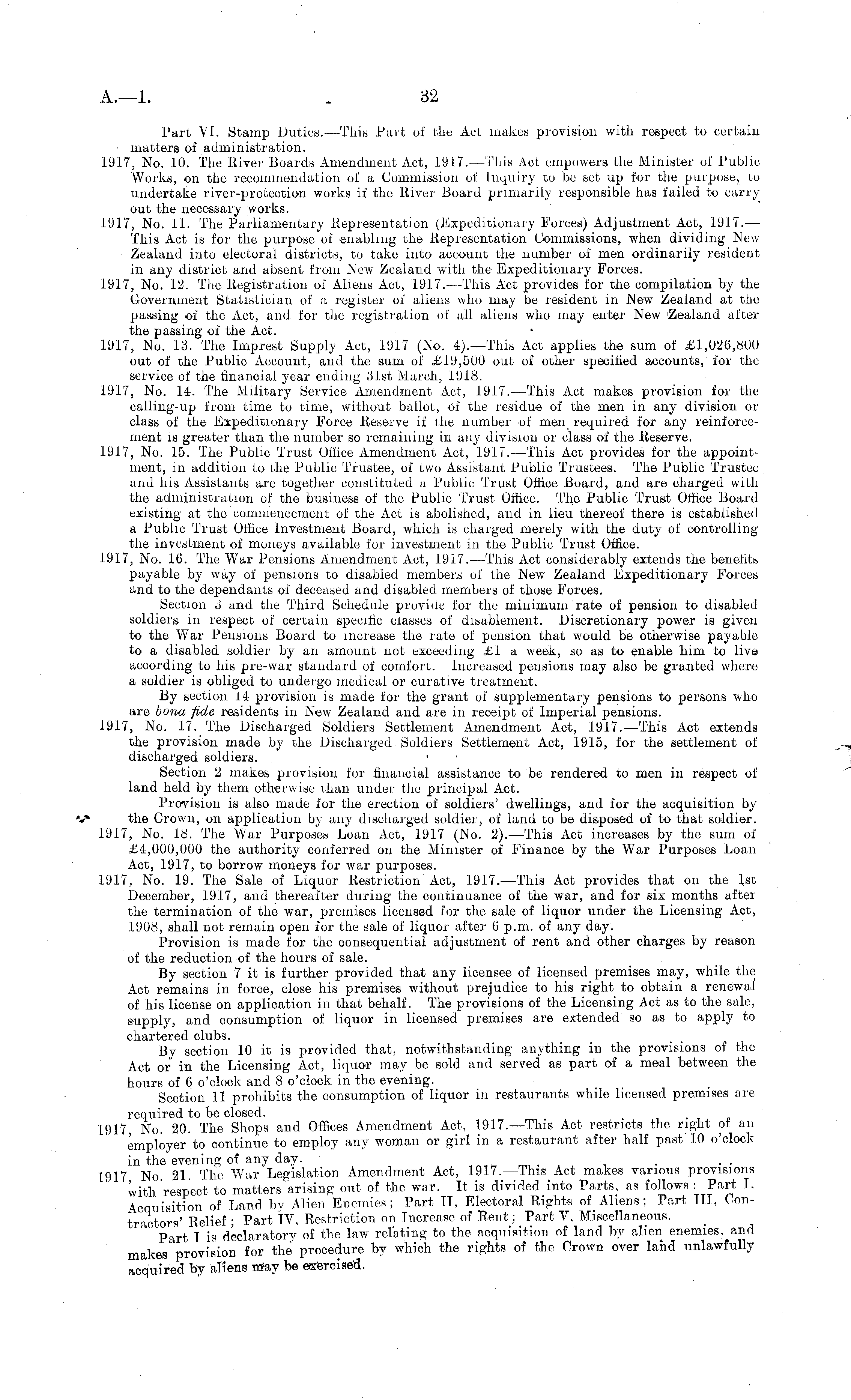 Part VI. Stamp Duties. —This Part of the Act makes provision with respect to certain - matters of administration. 1917, No. 10. The River Boards Amendment Act, 1917.—This Act empowers the Minister of Public Works, on the recommendation of a Commission of Inquiry to be set up for the purpose, to undertake river-protection works if the River Board primarily responsible has failed to carry out the necessary works. 1917, No. 11. The Parliamentary Representation (Expeditionary Forces) Adjustment Act, 1947. — This Act is for the purpose of enabling the Representation Commissions, when dividing New Zealand into electoral districts, to take into account the number of men ordinarily resident in any district and absent from New Zealand with the Expeditionary Forces. 4917, No. 12. The Registration of Aliens Act, 1917.—This Act provides for the compilation by the Government Statistician of a register of aliens who may be resident in New Zealand at the passing of the Act, and for the registration of all aliens who may enter New 'Zealand after the passing of the Act. 1917, No, 13. The Imprest Supply Act, 1917 (No. 4).—This Act applies the sum of £4,026,800 out of the Public Account, and the sum of £19,500 out of other specified accounts, for the service of the financial year ending 31st March, 1918. 1917, No. 14. The Military Service Amendment Act, I.9l7.—This Act makes provision for the calling-up from time to time, without ballot, of the residue of the men in any division or class of the Expeditionary Force Reserve if the number of men required for any reinforcement is greater than the number so remaining in any division or class of the Reserve. 4947, No. 45. The Public Trust Office Amendment Act, 1917. —This Act provides for the appointment, in addition to the Public Trustee, of two Assistant Public Trustees. The Public Trustee and his Assistants are together constituted a Public Trust Office Board, and are charged with the administration of the business of the Public Trust Office. The Public Trust Office Board existing at the commencement of the Act is abolished, and in lieu thereof there is established a Public Trust Office Investment Board, which is charged merely with the duty of controlling the investment of moneys available for investment in the Public Trust Office. 1947, No. 16. The War Pensions Amendment Act, 4917.—This Act considerably extends the benefits payable by way of pensions to disabled members of the New Zealand Expeditionary Forces and to the dependants of deceased and disabled members of those Forces. Section o and the Third Schedule provide for the minimum rate of pension to disabled soldiers in respect of certain specific classes of disablement. Discretionary power is given to the War Pensions Board to increase the rate of pension that would be otherwise payable to a disabled soldier by an amount not exceeding £i a week, so as to enable him to live according to his pre-war standard of comfort, increased pensions may also be granted where a soldier is obliged to undergo medical or curative treatment. By section 14 provision is made for the grant of supplementary pensions to persons who are bona fide residents in New Zealand and are in receipt of Imperial pensions. 1917, No. 17. The Discharged Soldiers Settlement Amendment Act, 1917.—This Act extends the provision made by the Discharged Soldiers Settlement Act, 1915, for the settlement of discharged soldiers. Section 2 makes provision for financial assistance to be rendered to men in respect of land held by them otherwise than under the principal Act. Provision is also made for the erection of soldiers' dwellings, and for the acquisition by *W» the Crown, on application by any discharged soldier, of land to be disposed of to that soldier. 1917, No. 18. The War Purposes Loan Act, 1917 (No. 2). —This Act increases by the sum of £4,000,000 the authority conferred on the Minister of Finance by the War Purposes Loan Act, 1917, to borrow moneys for war purposes. 1917, No. 19. The Sale of Liquor Restriction Act, 1917.—This Act provides that on the Ist December, 1917, and thereafter during the continuance of the war, and for six months after the termination of the war, premises licensed for the sale of liquor under the Licensing Act, 1908, shall not remain open for the sale of liquor after 6 p.m. of any day. Provision is made for the consequential adjustment of rent and other charges by reason of the reduction of the hours of sale. By section 7 it is further provided that any licensee of licensed premises may, while the Act remains in force, close his premises without prejudice to his right to obtain a renewal of his license on application in that behalf. The provisions of the Licensing Act as to the sale, supply, and consumption of liquor in licensed premises are extended so as to apply to chartered clubs. By section 10 it is provided that, notwithstanding anything in the provisions of the Act or in the Licensing Act, liquor may be sold and served as part of a meal between the hours of 6 o'clock and 8 o'clock in the evening. Section 11 prohibits the consumption of liquor in restaurants while licensed premises are required to be closed. 1917, No. 20. The Shops and Offices Amendment Act, 1917.—This Act restricts the right of an employer to continue to employ any woman or girl in a restaurant after half past 10 o'clock in the evening of any day. _ 1917 No 21 The War Legislation Amendment Act, 1917.—This Act makes various provisions with 'respect to matters arising out of the war. It is divided into Parts, as follows : Part I, Acquisition of Land by Alien Enemies; Part 11, Electoral Rights of Aliens; Part TTT, Contractors' Relief ; Part IV, Restriction on Increase of Rent; Part V, Miscellaneous. Part I is declaratory of the law relating to the acquisition of land by alien enemies, and makes'provision for the procedure by which the rights of the Crown over land unlawfully acquired by aliens rrtay be exercised.