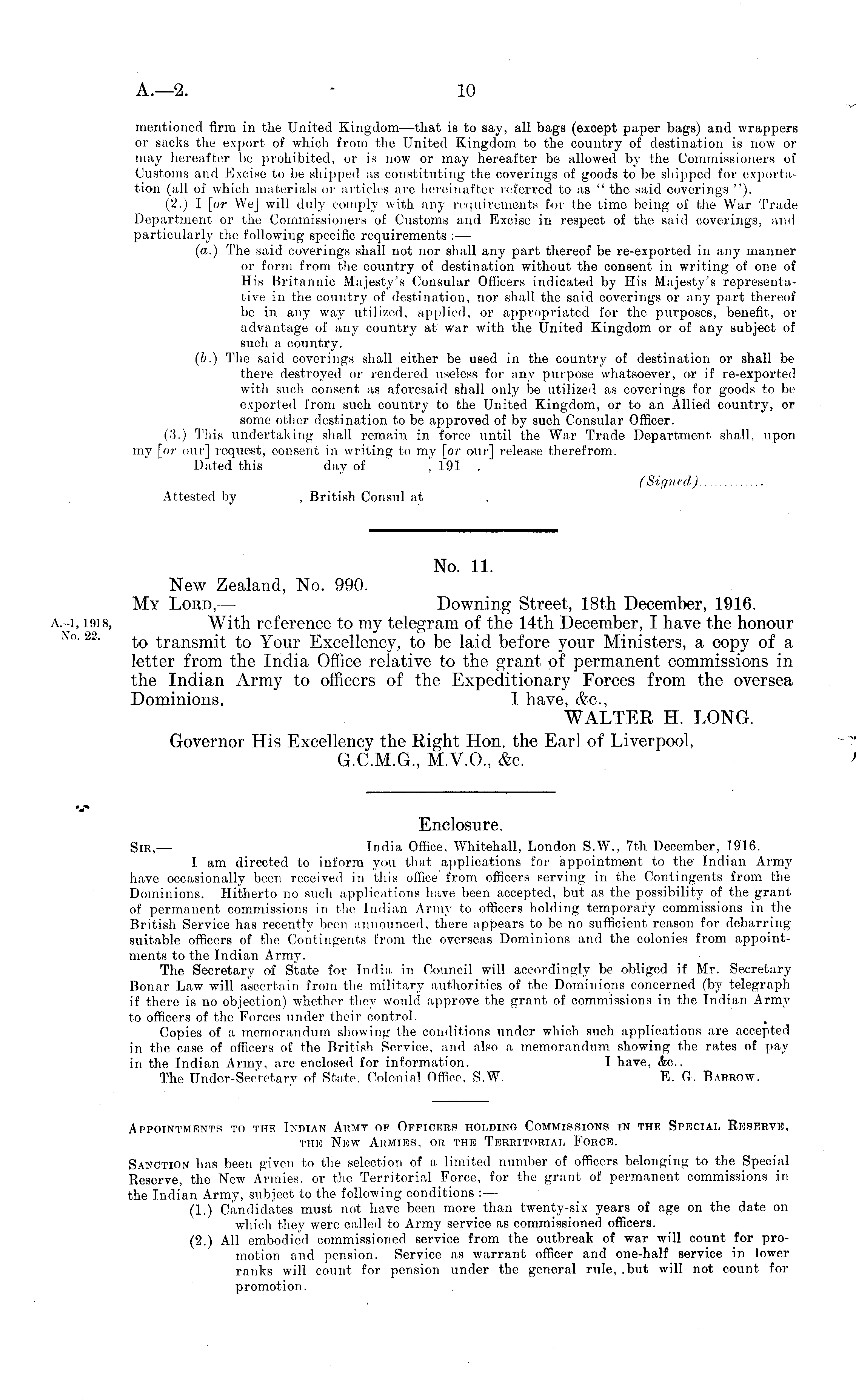 No. 11. New Zealand, No. 990. My Lord, — Downing Street, 18th December, 1916. With reference to my telegram of the 14th December, I have the honour to transmit to Your Excellency, to be laid before your Ministers, a copy of a letter from the India Office relative to the grant of permanent commissions in the Indian Army to officers of the Expeditionary Forces from the oversea Dominions. I have, &c, WALTER H. LONG. Governor His Excellency the Right Hon. the Earl of Liverpool, G.C.M.G., M.V.0., &c.