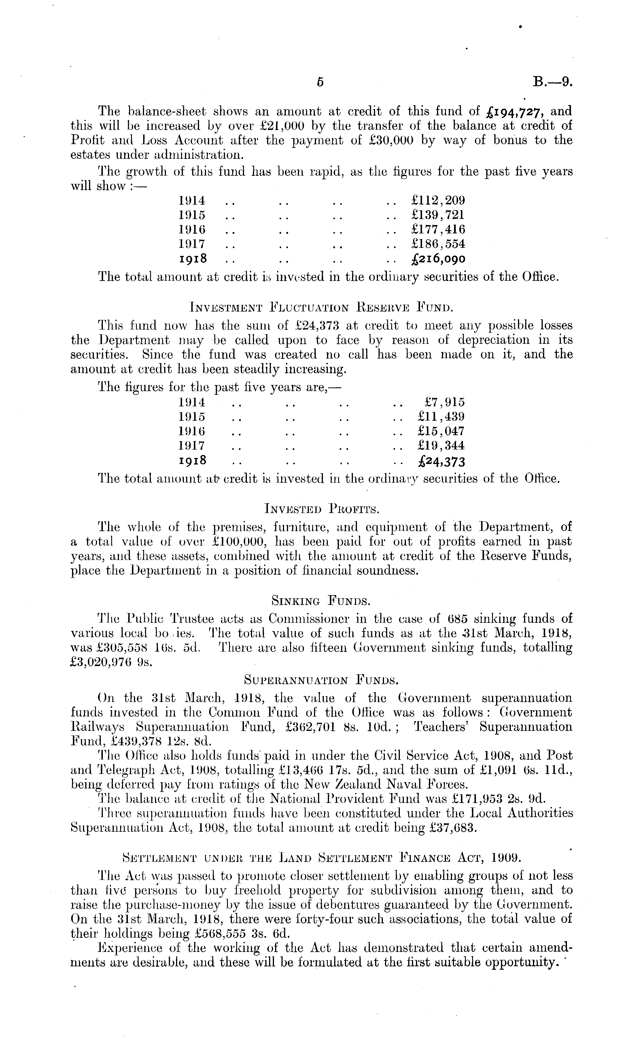 The balance-sheet shows an amount at credit of this fund of £194,727, and this will be increased by over £21,000 by the transfer of the balance at credit of Profit and Loss Account after the payment of £30,000 by way of bonus to the estates under administration. The growth of this fund has been rapid, as the figures for the past five years will show : — 1914 .. .. .. .. £112,209 1915 .. .. .. .. £139,721 1916 .. .. .. .. £177,416 1917 .. .. .. .. £186,554 1918 .. .. £216,090 The total amount at credit is invested in the ordinary securities of the Office. Investment Fluctuation Reserve Fund. This fund now has the sum of £24,373 at credit to meet any possible losses the Department may be called upon to face by reason of depreciation in its securities. Since the fund was created no call has been made on it, and the amount at credit has been steadily increasing. The figures for the past five years are, — 1914 .. .. .. .. £7,915 1915 .. .. .. .. £11,439 1916 .. .. .. .. £15,047 1917 .. .. .. .. £19,344 1918 .. .. .. .. £24,373 The total amount at? credit is invested in the ordinary securities of the Office. Invested Profits. The whole of the premises, furniture, and equipment of the Department, of a total value of over £100,000, has been paid for out of profits earned in past years, and these assets, combined with the amount at credit of the Reserve Funds, place the Department in a position of financial soundness. Sinking Funds. The Public Trustee acts as Commissioner in the case of 685 sinking funds of various local bo ,ies. The total value of such funds as at the .31st March, 1918, was £305,558 16s. sd. There are also fifteen Government sinking funds, totalling £3,020,976 9s. Superannuation Funds. On the 31st March, 1918, the value of the Government superannuation funds invested in the Common Fund of the Office was as follows : Government Railways Superannuation Fund, £362,701 Bs. lOd. ; Teachers' Superannuation Fund, £439,378 12s. Bd. The Office also holds funds paid in under the Civil Service Act, 1908, and Post and Telegraph Act, 1908, totalling £13,466 17s. 5d., and the sum of £1,091 6s. lid., being deferred pay from ratings of the New Zealand Naval Forces. The balance at credit of the National Provident Fund was £171,953 2s. 9d. Three superannuation funds have been constituted under the Local Authorities Superannuation Act, 1908, the total amount at credit being £37,683. Settlement under the Land Settlement Finance Act, 1909. The Act was passed to promote closer settlement by enabling groups of not less than live persons to buy freehold property for subdivision among them, and to raise the purchase-money by the issue of debentures guaranteed by the Government. On the 31st March, 1918, there were forty-four such associations, the total value of their holdings being £568,555 3s. 6d. Experience of the working of the Act has demonstrated that certain amendments are desirable, and these will be formulated at the first suitable opportunity.