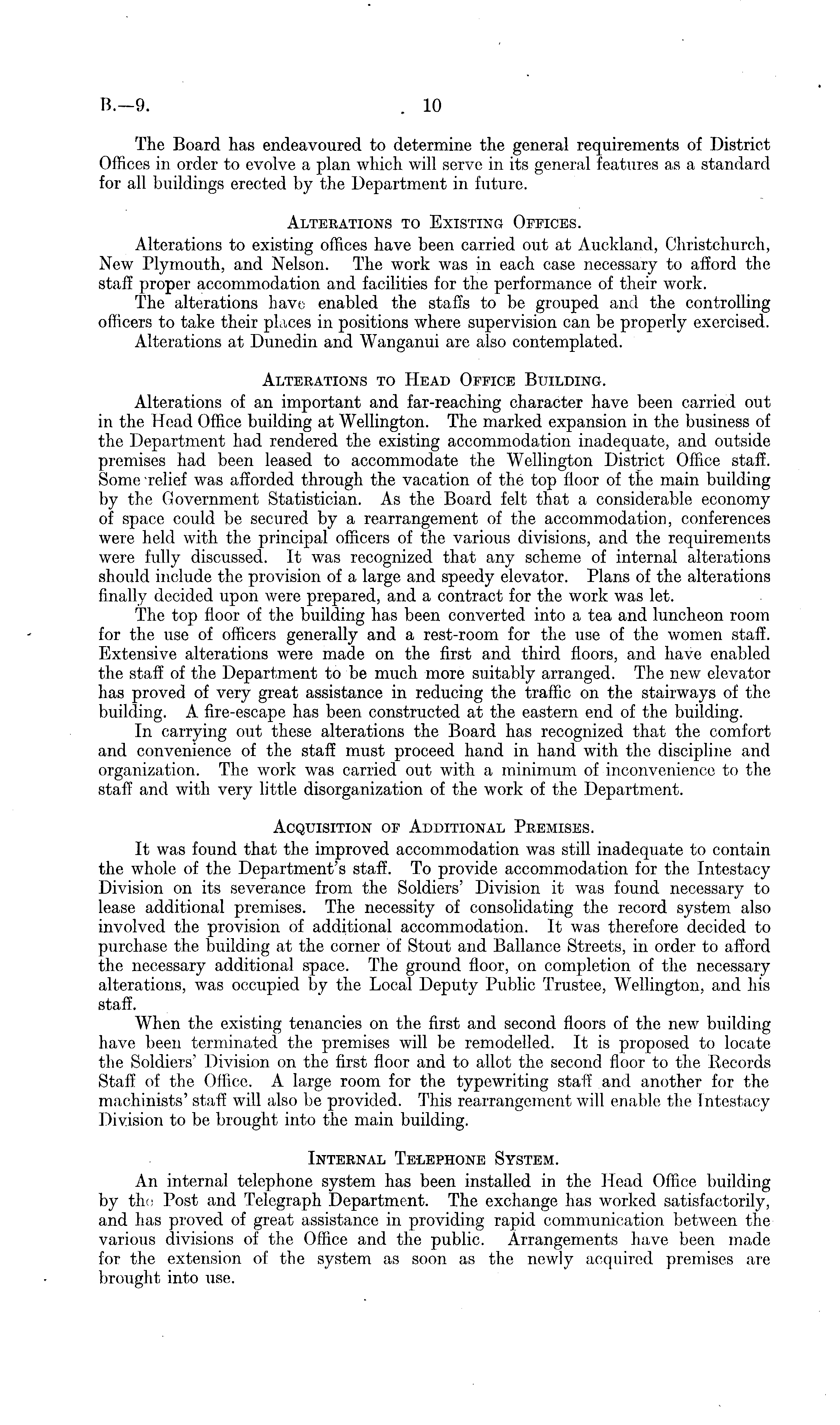 The Board has endeavoured to determine the general requirements of District Offices in order to evolve a plan which will serve in its general features as a standard for all buildings erected by the Department in future. Alterations to Existing Offices. Alterations to existing offices have been carried out at Auckland, Christchurch, New Plymouth, and Nelson. The work was in each case necessary to afford the staff proper accommodation and facilities for the performance of their work. The alterations have enabled the staffs to be grouped and the controlling officers to take their places in positions where supervision can be properly exercised. Alterations at Dunedin and Wanganui are also contemplated. Alterations to Head Office Building. Alterations of an important and far-reaching character have been carried out in the Head Office building at Wellington. The marked expansion in the business of the Department had rendered the existing accommodation inadequate, and outside premises had been leased to accommodate the Wellington District Office staff. Some relief was afforded through the vacation of the top floor of the main building by the Government Statistician. As the Board felt that a considerable economy of space could be secured by a rearrangement of the accommodation, conferences were held with the principal officers of the various divisions, and the requirements were fully discussed. It was recognized that any scheme of internal alterations should include the provision of a large and speedy elevator. Plans of the alterations finally decided upon were prepared, and a contract for the work was let. The top floor of the building has been converted into a tea and luncheon room for the use of officers generally and a rest-room for the use of the women staff. Extensive alterations were made on the first and third floors, and have enabled the staff of the Department to be much more suitably arranged. The new elevator has proved of very great assistance in reducing the traffic on the stairways of the building. A fire-escape has been constructed at the eastern end of the building. In carrying out these alterations the Board has recognized that the comfort and convenience of the staff must proceed hand in hand with the discipline and organization. The work was carried out with a minimum of inconvenience to the staff and with very little disorganization of the work of the Department. Acquisition of Additional Premises. It was found that the improved accommodation was still inadequate to contain the whole of the Department's staff. To provide accommodation for the Intestacy Division on its severance from the Soldiers' Division it was found necessary to lease additional premises. The necessity of consolidating the record system also involved the provision of additional accommodation. It w r as therefore decided to purchase the building at the corner of Stout and Ballance Streets, in order to afford the necessary additional space. The ground floor, on completion of the necessary alterations, was occupied by the Local Deputy Public Trustee, Wellington, and his staff. When the existing tenancies on the first and second floors of the new building have been terminated the premises will be remodelled. It is proposed to locate the Soldiers' Division on the first floor and to allot the second floor to the Records Staff of the Office. A large room for the typewriting staff and another for the machinists' staff will also be provided. This rearrangement will enable the Intestacy Division to be brought into the main building. Internal Telephone System. An internal telephone system has been installed in the Head Office building by the Post and Telegraph Department. The exchange has worked satisfactorily, and has proved of great assistance in providing rapid communication between the various divisions of the Office and the public. Arrangements have been made for the extension of the system as soon as the newly acquired premises are brought into use.