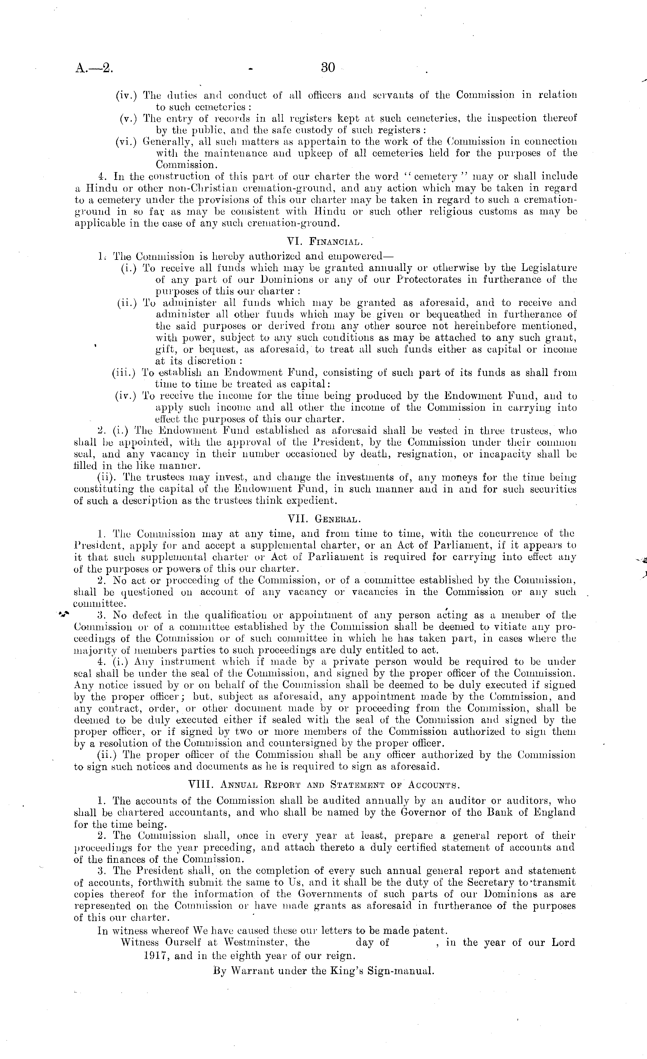 (iv.) The duties and conduct of all officers and servants of the Commission in relation to such cemeteries : (v.) The entry of records in all registers kept at such cemeteries, the inspection thereof by the public, and the safe custody of such registers : (vi.) Generally, all such matters as appertain to the work of the Commission in connection with the maintenance and upkeep of all cemeteries held for the purposes of the Commission. 4. In the construction of this part of our charter the word "cemetery" may or shall include a Hindu or other non-Christian cremation-ground, and any action which may be taken in regard to a cemetery under the provisions of this our charter may be taken in regard to such a cremationground in so far as may be consistent with Hindu or such other religious customs as may be applicable in the case of any such cremation-ground. VI. Financial. L The Commission is hereby authorized and empowered— (i.) To receive all funds which may be granted annually or otherwise by the Legislature of any part of our Dominions or any of our Protectorates in furtherance of the purposes of this our charter : (ii.) To administer all funds which may be granted as aforesaid, and to receive and administer all other funds which may be given or bequeathed in furtherance of the said purposes or derived from any other source not hereinbefore mentioned, with power, subject to any such conditions as may be attached to any such grant, gift, or bequest, as aforesaid, to treat all such funds either as capital or income at its discretion : (iii.) To establish an Endowment Fund, consisting of such part of its funds as shall from time to time be treated as capital: (iv.) To receive the income for the time being produced by the Endowment Fund, and to apply such income and all other the income of the Commission in carrying into effect the purposes of this our charter. 2. (i.) The Endowment Fund established as aforesaid shall be vested in three trustees, who shall be appointed, with the approval of the President, by the Commission under their common seal, and any vacancy in their number occasioned by death, resignation, or incapacity shall be filled in the like manner. (ii). The trustees may invest, and change the investments of, any moneys for the time being constituting the capital of the Endowment Fund, in such manner and in and for such securities of such a description as the trustees think expedient. VII. General. 1. The Commission may at any time, and from time to time, with, the concurrence of the President, apply for and accept a supplemental charter, or an Act of Parliament, if it appears to it that such supplemental charter or Act of Parliament is required for carrying into effect any of the purposes or power's of this our charier. 2. No act or proceeding of the Commission, or of a committee established by the Commission, shall bo questioned on account, of any vacancy or vacancies in the Commission or any such committee. 3. No defect in the qualification or appointment of any person acting as a member of the Commission or of a committee established by the Commission shall be deemed to vitiate any proceedings of the Commission or of such committee in which he has taken part, in cases where the majority of members parties to such proceedings are duly entitled to act. 4. (i.) Any instrument which if made by a private person would be required to be under seal shall be under the seal of the Commission, and signed by the proper officer of the Commission. Any notice issued by or on behalf of the Commission shall be deemed to be duly executed if signed by the proper officer; but, subject as aforesaid, any appointment made by the Commission, and any contract, order, or other document made by or proceeding from the Commission, shall be deemed to be duly executed either if sealed with the seal of the Commission and signed by the proper officer, or if signed by two or more members of the Commission authorized to sign them by a resolution of the Commission and countersigned by the proper officer. (ii.) The proper officer of the Commission shall be any officer authorized by the Commission to sign such notices and documents as he is required to sign as aforesaid. VIII. Annual Report and Statement ok Accounts. 1. The accounts of the Commission shall be audited annually by an auditor or auditors, who shall be chartered accountants, and who shall be named by the Governor of the Bank of England for the time being. 2. The Commission shall, once in every year at least, prepare, a general report of their proceedings for the year preceding, and attach thereto a duly certified statement of accounts and of the finances of the Commission. 3. The President shall, on the completion of every such annual general report and statement of accounts, forthwith submit the same to Us, and it shall be the duty of the Secretary to "transmit copies thereof for the information of the Governments of such parts of our Dominions as are represented on the Commission or have made grants as aforesaid in furtherance of the purposes of this our charter. In witness whereof We have caused these our letters to be made patent. Witness Ourself at Westminster, the day of , in the year of our Lord 1917, and in the eighth year of our reign. By Warrant under the King's Sign-manual.