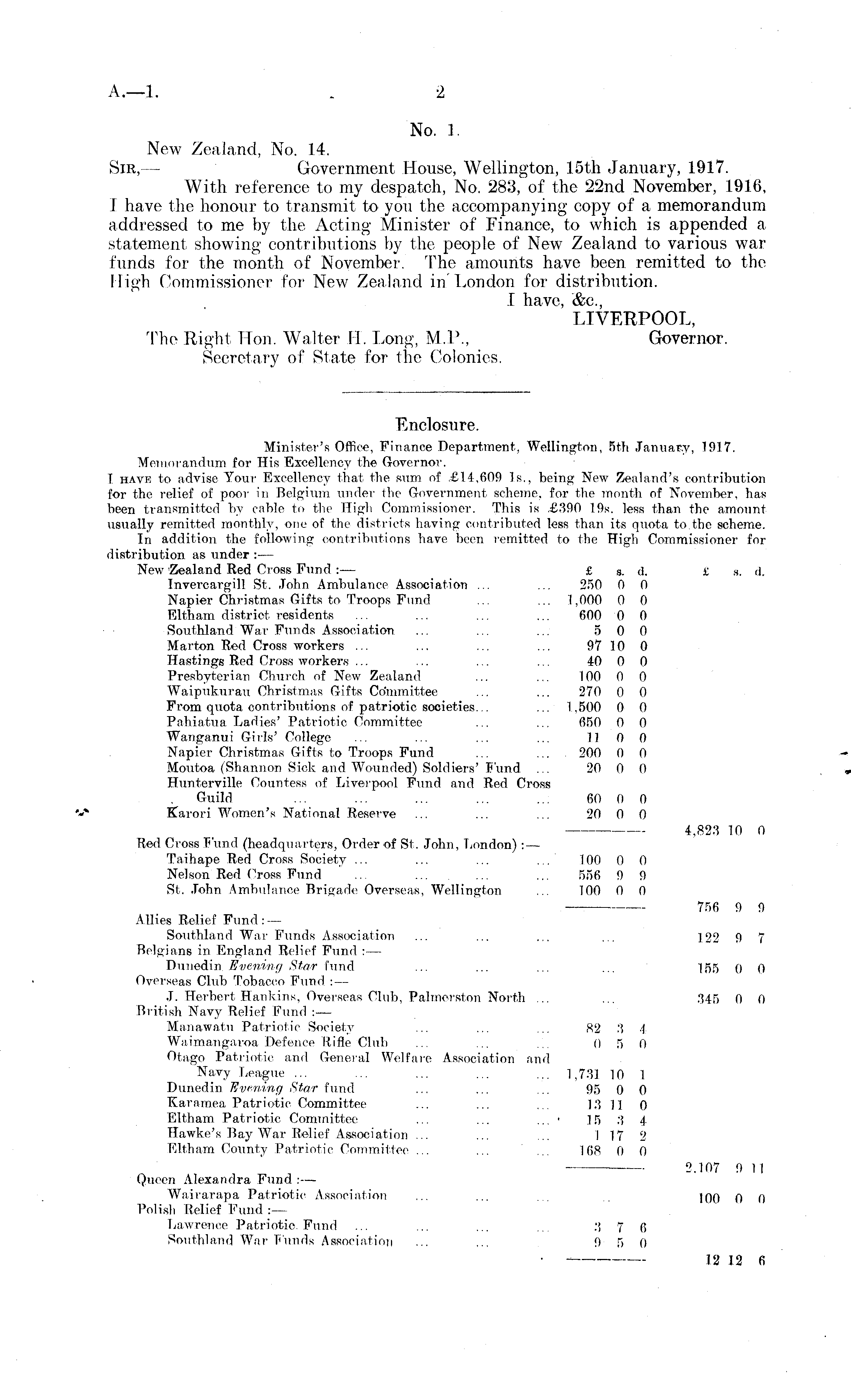 No. 1. New Zealand, No. 14. Sir, — Government House, Wellington, 15th January, 1917. With reference to my despatch, No. 283, of the 22nd November, 1910, I have the honour to transmit to you the accompanying copy of a memorandum addressed to me by the Acting Minister of Finance, to which is appended a statement showing contributions by the people of New Zealand to various war funds for the month of November. The amounts have been remitted to the High Commissioner for New Zealand in' London for distribution. I have, &c, LIVERPOOL, The Right Hon. Walter H. Long, M.P., Governor. Secretary of State for the Colonies.