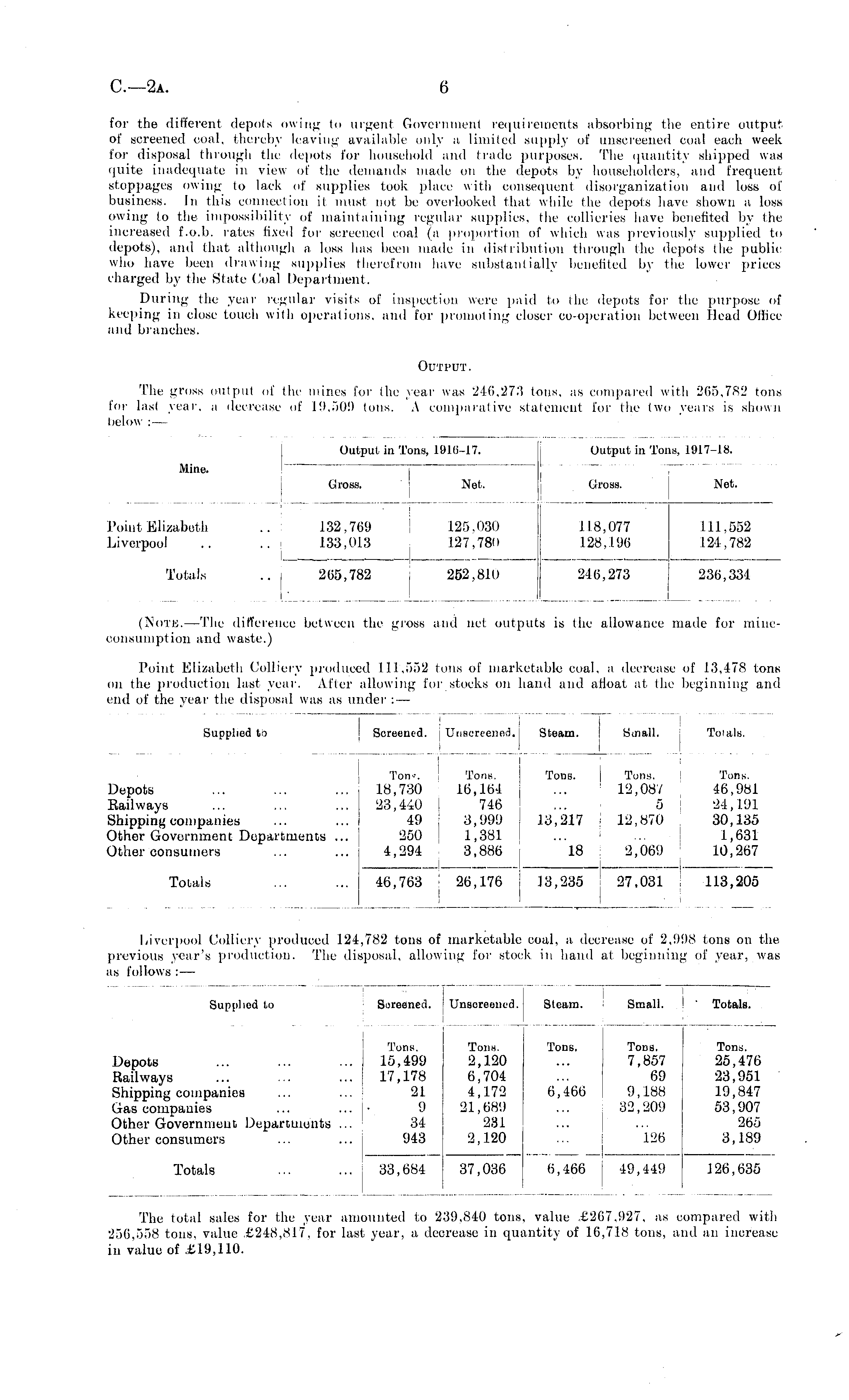 Mine. Output in Tons, 1916-17. Grose. Net. Output in Ton Gross. is, 1917-18. Net. Point Elizabeth Liverpool '.. 132.769 125.030 133,013 127,780 118.077 128,196 111.552 121,782 Totals 265,782 252,810 246,273 236,334