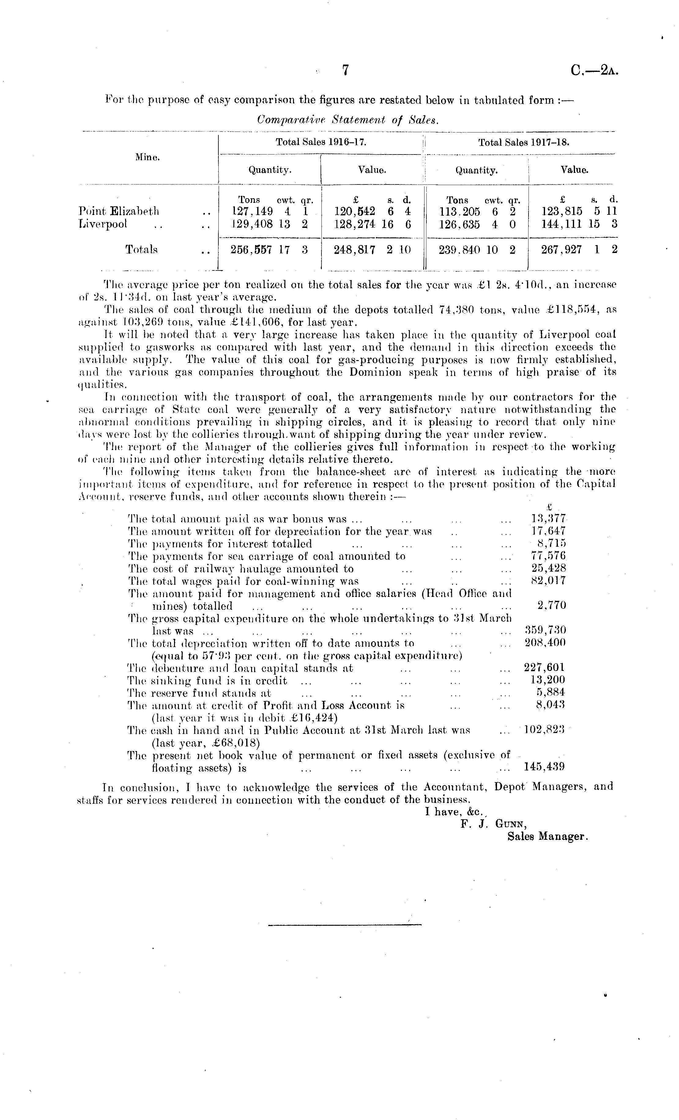 The average price per ton realized on the total sales for the year was £1 2s. 4'10d., an increase of 2s. 1 I'34d. on last year's average. The 1 sales of coal through the medium of the depots totalled 74,380 tons, value £118,554, as against 103,269 tons, value £141,606, for last year. It will be noted that a. very large increase has taken place in the quantity of Liverpool coal supplied to gasworks as compared with last year, and the demand in this direction exceeds the available supply. The value of this coal for gas-producing purposes is now firmly established, and the various gas companies throughout the Dominion speak in terms of high praise of its qualities. In connection with the transport of coal, the arrangements made by our contractors for the sea carriage of State coal were generally of a very satisfactory nature notwithstanding the abnormal conditions prevailing in shipping circles, and it is pleasing to record that only nine days were lost by the collieries through.want of shipping during the year under review. The report of the Manager of the collieries gives full information in respect to the working of each mine and other interesting details relative thereto. The following items taken from the balance-sheet are of interest as indicating the more important items of expenditure, and for reference in respect to the present position of the Capital Account, reserve funds, and other accounts shown therein : — £ The total amount paid as war bonus was ... ... ... ... 13,377 The amount written off for depreciation for the year was .-. ... 17,647 The payments for interest totalled ... ... ... ... 8,715 The payments for sea carriage of coal amounted to ... ... 77,576 The cost of railway haulage amounted to ... ... ... 25,428 The total wages paid for coal-winning was ... ... 82,017 The amount paid for management and office salaries (Head Office and mines) totalled ... ... ... ... ... ... 2,770 The gross capital expenditure on the whole undertakings to 31st March last was ... ... ... ... ... ... ... 359,730 The total depreciation written off to date amounts to ... ... 208,400 (equal to 57'93 per cent, on the gross capital expenditure) The debenture and loan capital stands at ... ... ... 227,601 The sinking fund is in credit ... ... ... ... ... 13,200 The reserve fund stands at ... ... ... ... ... 5,884 The amount at credit of Profit and Loss Account is ... ... 8,043 (last year it was in debit .£16,424) The cash in hand and in Public Account at 31st March last was ... 102,823 (last year, ..£68,018) The present net book value of permanent or fixed assets (exclusive of floating assets) is ... ... ... ... ... 145,439 In conclusion, I have to acknowledge the services of the Accountant, Depot Managers, and staffs for services rendered in connection with the conduct of the business. I have, &c. F. J. Gunn, Sales Manager.