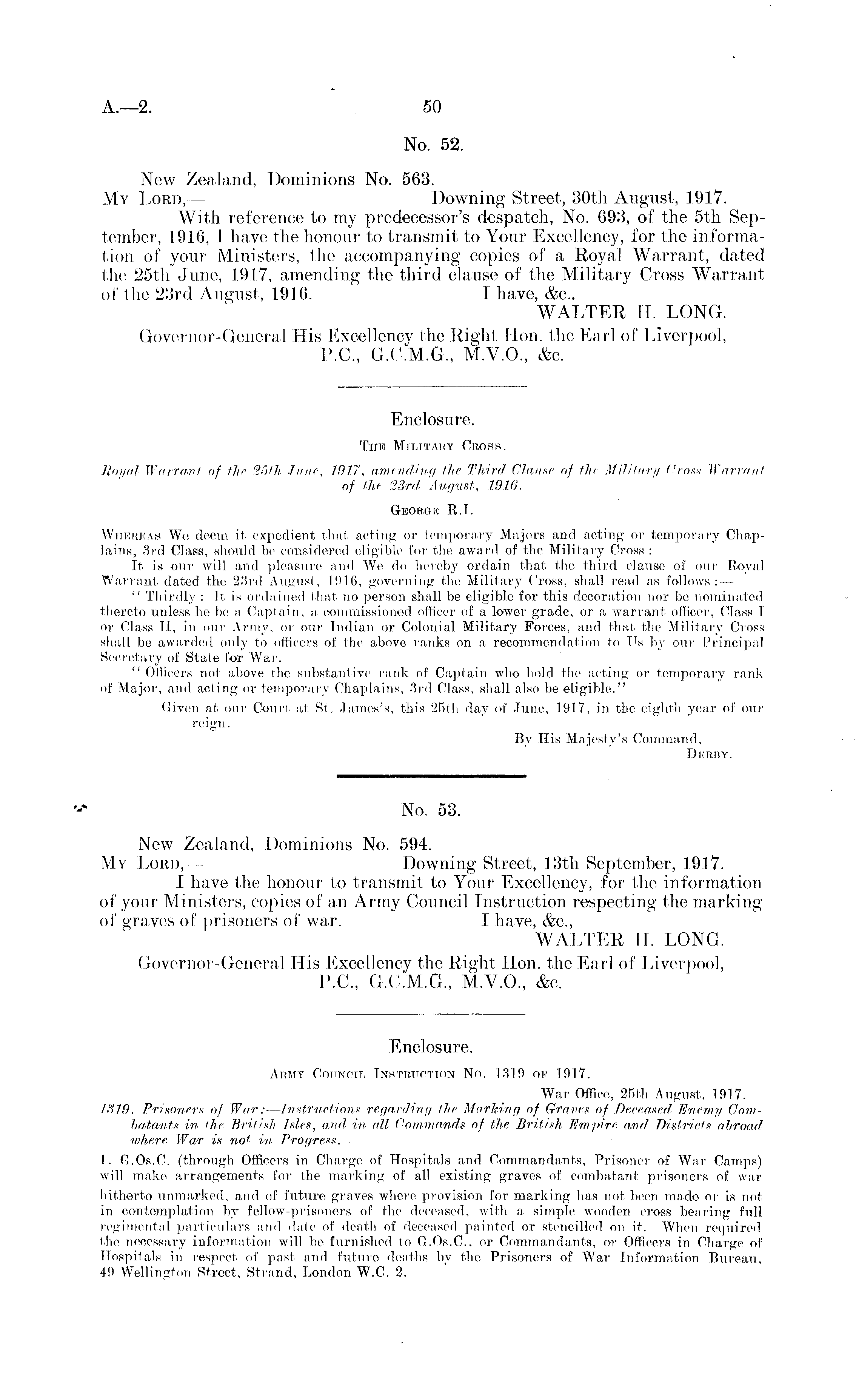 No. 53. New Zealand, Dominions No. 594. My Lord, — Downing Street, 13th September, 1917. I have the honour to transmit to Your Excellency, for the information of your Ministers, copies of an Army Council Instruction respecting the marking of graves of prisoners of war. I have, &c, WALTER H. LONG. Governor-Gen oral His Excellency the Right Hon. the Earl of Liverpool, P. 0., G.C.M.G., M.V.0., &c. Enclosure. Army Council Instruction No. 1319 of 1917. War Office, 25th August, 1917. 1319. Prisoners of War: — Instructions regarding the Marking of Graves of Deceased. Enemy Combatants in the British Isles, and in all Commands of the British Empdre and. Districts abroad where War is not in Progress. 1. G.Os.C. (through Officers in Charge of Hospitals and Commandants, Prisoner of War Camps) will make arrangements for the marking of all existing graves of combatant, prisoners of war hitherto unmarked, and of future graves where provision for marking has not been made or is not in contemplation by fellow-prisoners of the deceased, with a simple wooden cross bearing full regimental particulars and date of death of deceased painted or stencilled on it. When required the necessary information will be furnished to G.Os.C, or Commandants, or Officers in Charge of Hospitals in respect of past and future deaths by the Prisoners of War Information Bureau, 49 Wellington Street, Strand, London W.C. 2.