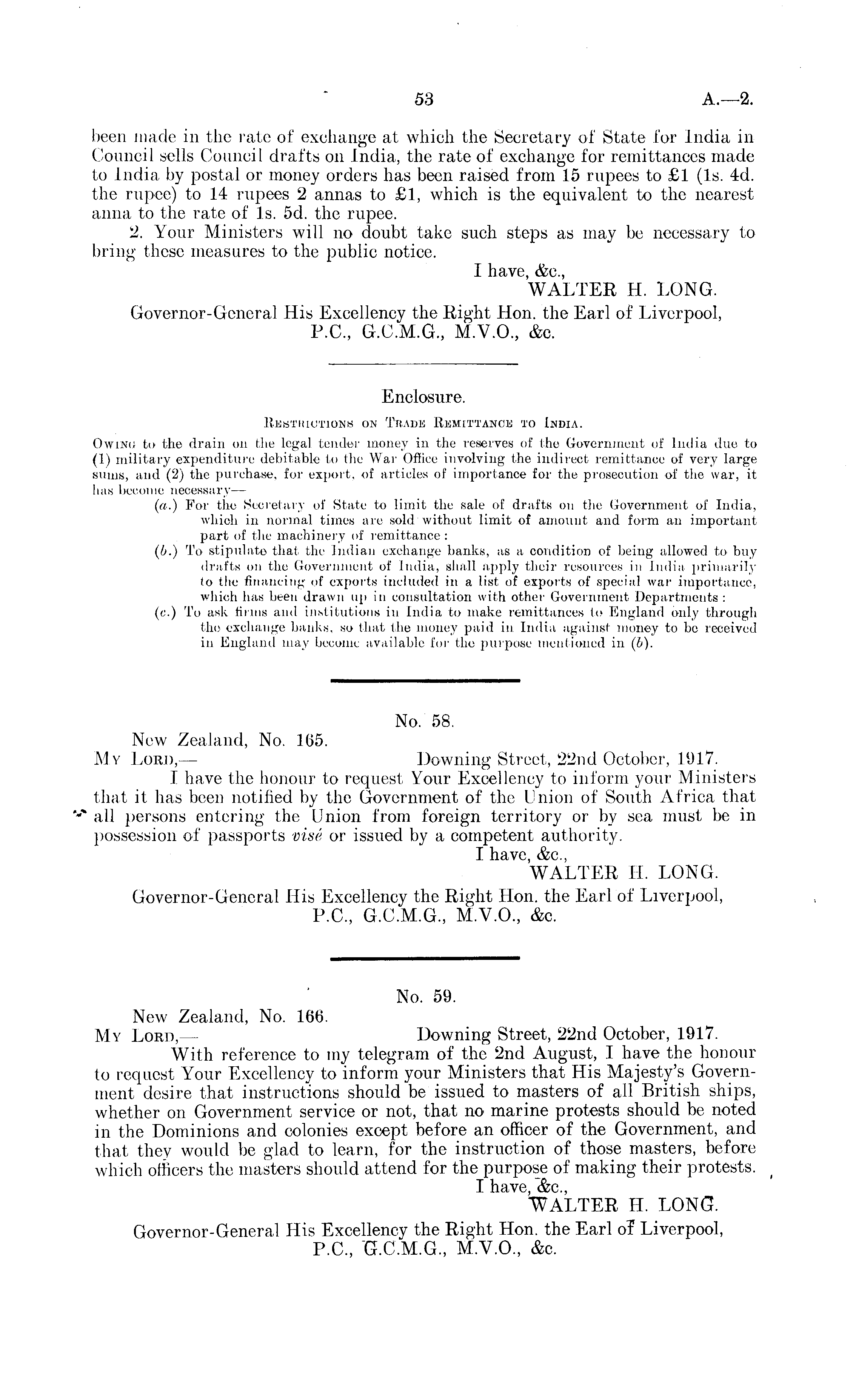 No. 58. New Zealand, No. 165. My Lord,— Downing Street, 22nd October, 1917. I have the honour to request Your Excellency to inform your Ministers that it has been notified by the Government of the Union of South Africa that '* all persons entering the Union from foreign territory or by sea must be in possession of passports vise or issued by a competent authority. I have, &c, WALTER LL LONG. Governor-General His Excellency the Right Hon. the Earl of Liverpool, P.C., G.C.M.G., M.V.0., &c.