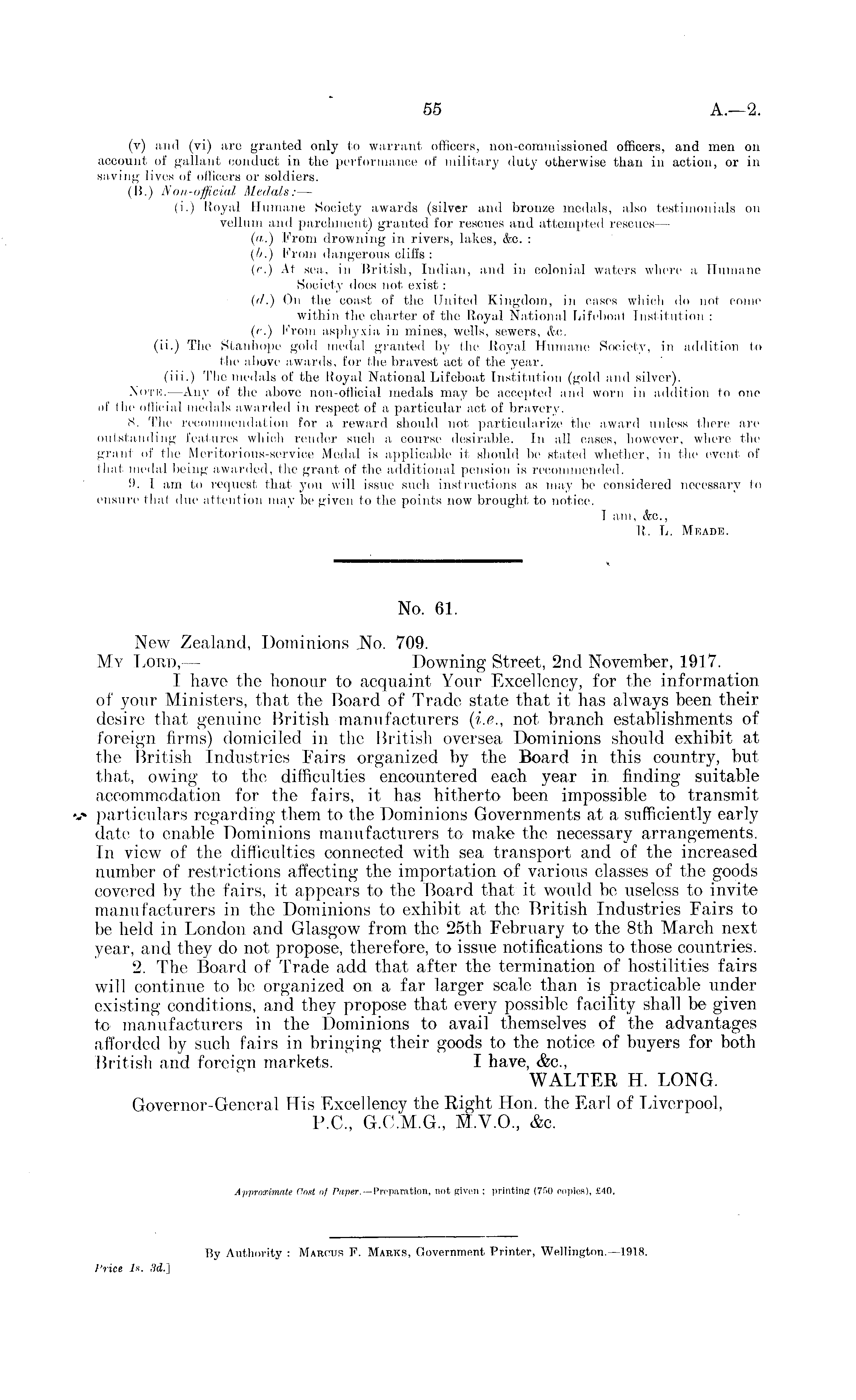 No. 61. New Zealand, Dominions .No. 709. My Lord, — Downing Street, 2nd November, 1917. I have the honour to acquaint Your Excellency, for the information of your Ministers, that the Board of Trade state that it has always been their desire that genuine British manufacturers (i.e., not branch establishments of foreign firms) domiciled in the British oversea Dominions should exhibit at the British Industries Fairs organized by the Board in this country, but that, owing to the difficulties encountered each year in finding suitable accommodation for the fairs, it has hitherto been impossible to transmit v particulars regarding them to the Dominions Governments at a sufficiently early date to enable Dominions manufacturers to make the necessary arrangements. In view of the difficulties connected with sea transport and of the increased number of restrictions affecting the importation of various classes of the goods covered by the fairs, it appears to the Board that it would be useless to invite manufacturers in the Dominions to exhibit at the British Industries Fairs to be held in London and Glasgow from the 25th February to the Bth March next year, and they do not propose, therefore, to issue notifications to those countries. 2. The Board of Trade add that after the termination of hostilities fairs will continue to be organized on a far larger scale than is practicable under existing conditions, and they propose that every possible facility shall be given to manufacturers in the Dominions to avail themselves of the advantages afforded by such fairs in bringing their goods to the notice of buyers for both British and foreign markets. I have, &c, WALTER H. LONG. Governor-General His Excellency the Right Hon. the Earl of Liverpool, P.C., G.C.M.G., M.V.0., &c.