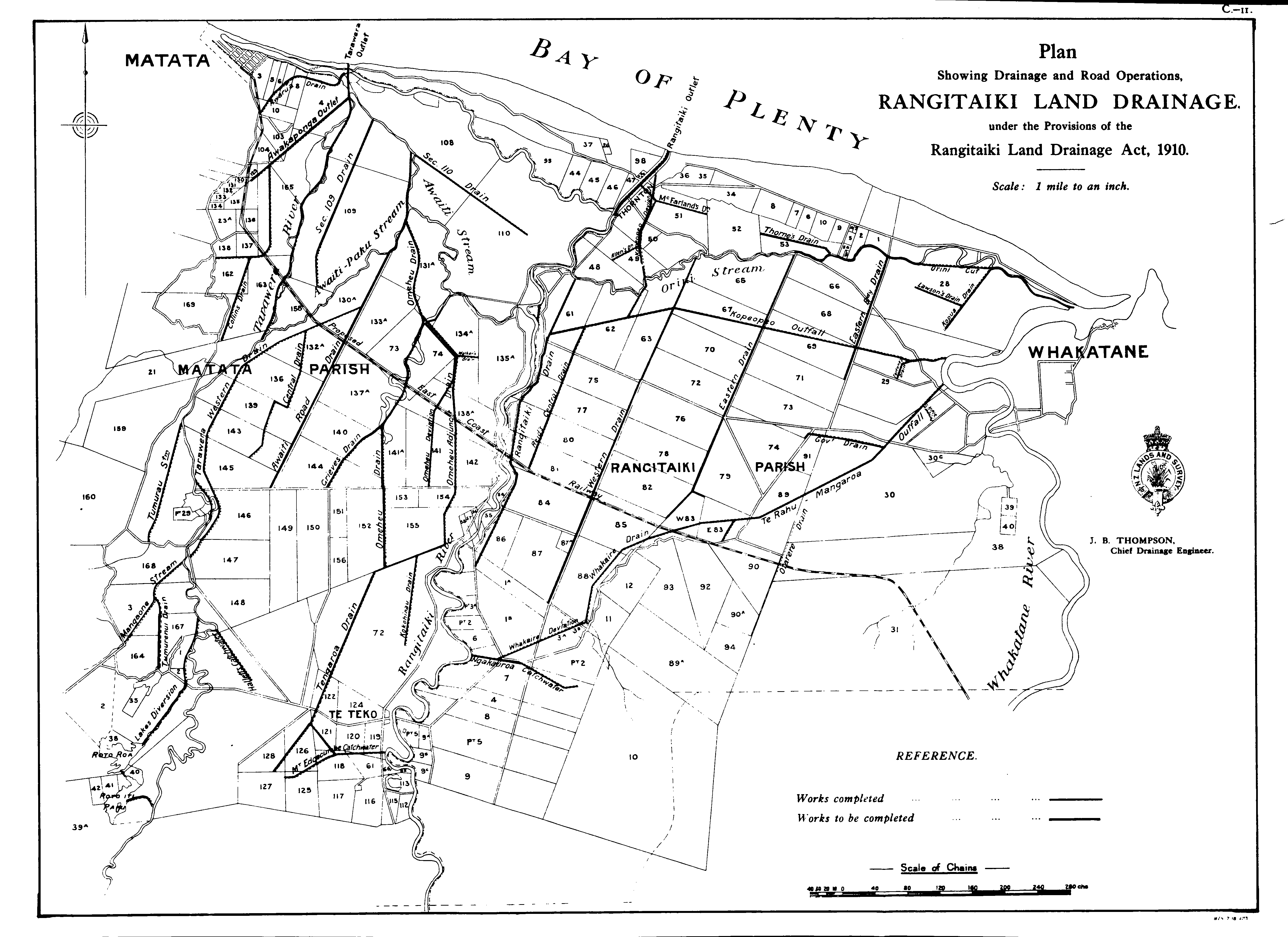 Plan Showing Drainage and Road Operations, RANGITAIKI LAND DRAINAGE, under the Provisions of the Rangitaiki Land Drainage Act, 1910.