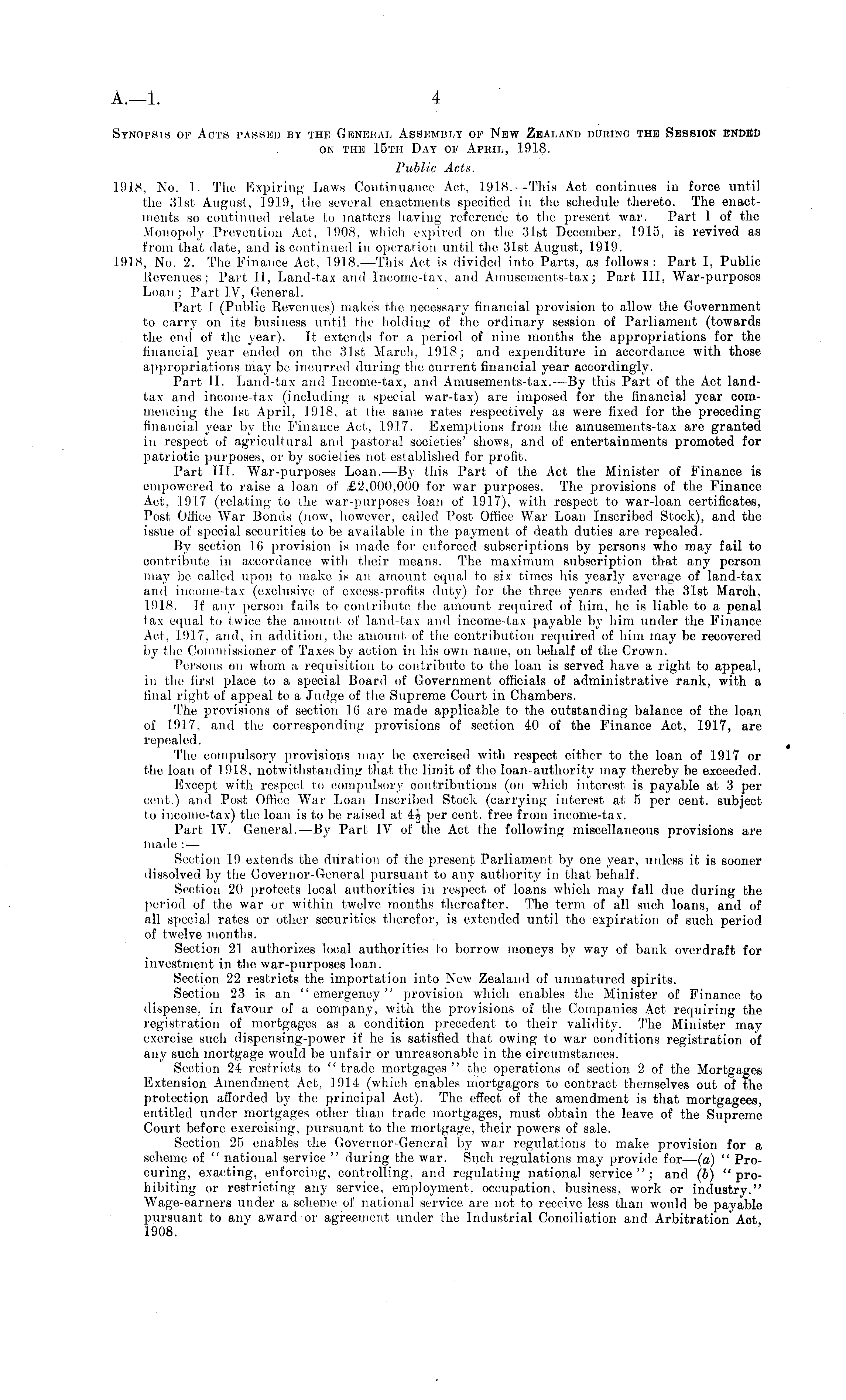Synopsis of Acts passed by the General Assembly of New Zealand during the Session ended on the 15th Day of April, 1918. Public Acts. 1918, No. 1. The Expiring Laws Continuance Act, 1918. —This Act continues in force until the 31st August, 1919, the several enactments specified in the schedule thereto. The enactments so continued relate to matters having reference to the present war. Part lof the Monopoly Prevention Act, 1908. which expired on the 31st December, 1915, is revived as from that date, and is continued in operation until the 31st August, 1919. 1918, No. 2. The Einance Act, 1918.—This Act is divided into Parts, as follows: Part I, Public Revenues ; Part 11, Land-tax and Income-tax, and Amusements-tax; Part 111, War-purposes Loan; Part IV, General. Part 1 (Public Revenues) makes the necessary financial provision to allow the Government to carry on its business until the holding of the ordinary session of Parliament (towards the end of the year). It extends for a period of nine months the appropriations for the financial year ended on the 31st March, 1918; and expenditure in accordance with those appropriations may be incurred during the current financial year accordingly. Part 11. Land-tax and Income-tax, and Amusements-tax.—By this Part of the Act landtax and income-tax (including a special war-tax) are imposed for the financial year commencing the Ist April, 1918, at the same rates respectively as were fixed for the preceding financial year by the Finance Act, 191.7. Exemptions from the amusements-tax are granted in respect of agricultural and pastoral societies' shows, and of entertainments promoted for patriotic purposes, or by societies not established for profit. Part HI. War-purposes Loan. —By this Part of the Act the Minister of Finance is empowered to raise a loan of £2,000,000 for war purposes. The provisions of the Finance Act, 1917 (relating to the war-purposes loan of 1917), with respect to war-loan certificates, Post Office War Bonds (now, however, called Post Office War Loan Inscribed Stock), and the issue of special securities to be available in the payment of death duties are repealed. By section 1C provision is made for enforced subscriptions by persons who may fail to contribute in accordance with their means. The maximum subscription that any person majr be called upon to make is an amount equal to six times his yearly average of land-tax and income-tax (exclusive of excess-profits duty) for the three years ended the 31st March, 1918. If any person fails to contribute the amount required of him, he is liable to a penal tax equal to twice the amount of land-tax and income-tax payable by him under the Einance Act, 1917, and, in addition, the amount of the contribution required of him may be recovered by. the Commissioner of Taxes by action in Ins own name, on behalf of the Crown. Persons on whom a requisition to contribute to the loan is served have a right to appeal, in the first place to a special Board of Government officials of administrative rank, with a final right of appeal to a Judge of the Supreme Court in Chambers. The provisions of section 16 are made applicable to the outstanding balance of the loan of 1917, and the corresponding provisions of section 40 of the Finance Act, 1917, are repealed. The compulsory provisions may be exercised with respect cither to the loan of 1917 or the loan of 1918, notwithstanding that the limit of the loan-authority may thereby be exceeded. Except with respect to compulsory contributions (on which interest is payable at 3 per cent.) and Post Office War Loan Inscribed Stock (carrying interest at 5 per cent, subject to income-tax) the loan is to be raised at per cent, free from income-tax. Part IV. General. —By Part IV of the Act the following miscellaneous provisions are made : — Section 19 extends the duration of the present Parliament by one year, unless it is sooner dissolved by the Governor-General pursuant to any authority in that behalf. Section 20 protects local authorities in respect of loans which may fall due during the period of the war or within twelve months thereafter. The term of all such loans, and of all special rates or other securities therefor, is extended until the expiration of such period of twelve months. Section 21 authorizes local authorities to borrow moneys by way of bank overdraft for investment in the war-purposes loan. Section 22 restricts the importation into New Zealand of unmatured, spirits. Section 23 is an "emergency" provision which enables the Minister of Finance to dispense, in favour of a company, with the provisions of the Companies Act requiring the registration of mortgages as a condition precedent to their validity. The Minister may exercise such dispensing-power if he is satisfied that owing to war conditions registration of any such mortgage would be unfair or unreasonable in the circumstances. Section 24 restricts to "trade mortgages" the operations of section 2 of the Mortgages Extension Amendment Act, 1914 (which enables mortgagors to contract themselves out of the protection afforded by the principal Act). The effect of the amendment is that mortgagees, entitled under mortgages other than trade mortgages, must obtain the leave of the Supreme Court before exercising, pursuant to the mortgage, their powers of sale. Section 25 enables the Governor-General by war regulations to make provision for a scheme of " national service " during the war. Such regulations may provide for— (a) " Procuring, exacting, enforcing, controlling, and regulating national service"; and (b) "prohibiting or restricting any service, employment, occupation, business, work or industry." Wage-earners under a scheme of national service are not to receive less than would be payable pursuant to any award or agreement under the Industrial Conciliation and Arbitration Act 1908.