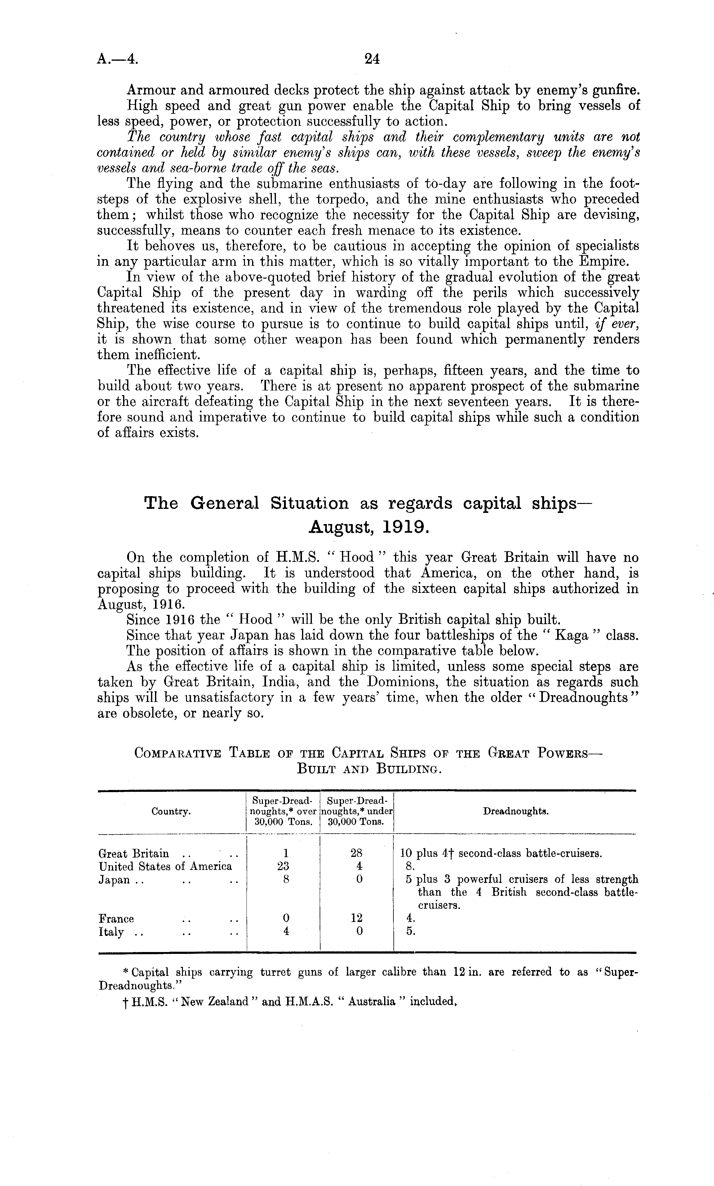Armour and armoured decks protect the ship against attack by enemy's gunfire. High speed and great gun power enable the Capital Ship to bring vessels of less speed, power, or protection successfully to action. The country whose fast capital ships and their complementary units are not contained or held by similar enemy s ships can, with these vessels, sweep the enemy's vessels and sea-borne trade off the seas. The flying and the submarine enthusiasts of to-day are following in the footsteps of the explosive shell, the torpedo, and the mine enthusiasts who preceded them; whilst those who recognize the necessity for the Capital Ship are devising, successfully, means to counter each fresh menace to its existence. It behoves us, therefore, to be cautious in accepting the opinion of specialists in any particular arm in this matter, which is so vitally important to the Empire. In view of the above-quoted brief history of the gradual evolution of the great Capital Ship of the present day in warding off the perils which successively threatened its existence, and in view of the tremendous role played by the Capital Ship, the wise course to pursue is to continue to build capital ships until, if ever, it is shown that some other weapon has been found which permanently renders them inefficient. The effective life of a capital ship is, perhaps, fifteen years, and the time to build about two years. There is at present no apparent prospect of the submarine or the aircraft defeating the Capital Ship in the next seventeen years. It is therefore sound and imperative to continue to build capital ships while such a condition of affairs exists. The General Situation as regards capital shipsAugust, 1919. On the completion of H.M.S. " Hood " this year Great Britain will have no capital ships building. It is understood that America, on the other hand, is proposing to proceed with the building of the sixteen capital ships authorized in August, 1916. Since 1916 the " Hood " will be the only British capital ship built. Since that year Japan has laid down the four battleships of the " Kaga " class. The position of affairs is shown in the comparative table below. As the effective life of a capital ship is limited, unless some special steps are taken by Great Britain, India, and the Dominions, the situation as regards such ships will be unsatisfactory in a few years' time, when the older "Dreadnoughts" are obsolete, or nearly so.
