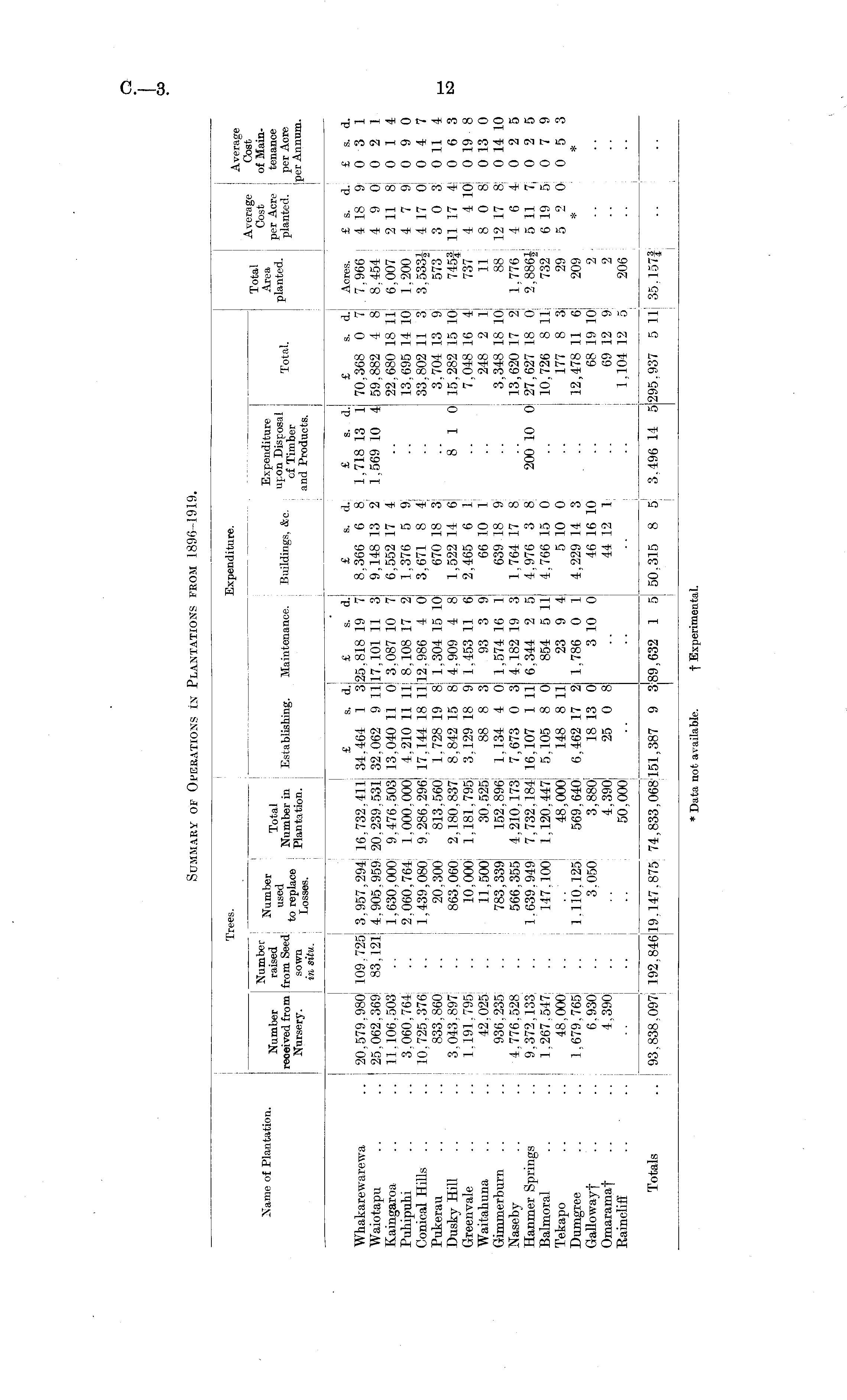 Name of Plantation. - Number Number Number raised j , Total received from from Seed , , Number in Establishing. Nursery. sown j " ! Plantation. in situ. Trees. Maintenance. ! Expenditure. Expenditure Buildings, & c. j U *£ST ; and Products. Total. : Average T . , Average ! Cost a Cost i ofMaini i j per Acre \ tenanee planted. lanted , per Acre 'per Annum. Whakarewarewa Waiotapu Kaingaroa Puhipuhi Conical Hills Pukerau Dusky Hill Greenvale Waitahuna Gimmerburn Naseby Hanmer Springs Balmoral Tekapo Dumgree Gallowayl Omaramaf Raincliff £ s. d.i £ s. d. .. 20,579.980 109,725 3.957,294 16.732.411 34.464 1 3|25.818 19 7 .. 25,062.369 83,121 4.905.959 20.239.531 32.062 9 11|17,101 11 3 .. 11.106.503 .. 1.630.000 9.476.503 13,040 11 0 1 3.087 10 7 3.060.764 .. 2.060,764. 1.000.000 4.210 1111 8.108 17 2 .. 10,725,376 .. 1.439,080 9.286.296 17.144 18 1112.986 4 0 833,860 .. 20.300' 813.560 1.728 19 8 1.304 15 10 3,043.897 .. 863.060 2,180.837 8.842 15 8:4.909 4 8 1.191.795 .. 10.000 1,181,795: 3.129 18 9 1.453 11 6 42.025! .. 11,500 30.525: 88 8 3 93 3 9 936.235 .. 783,339 152. 1.134 4 0 1.574 16 1 .. 4,776,528 .. 566.355 4,210.173 7,673 0 3 4,182 19 3 9.372,133 .. 1.639.949 7,732.184116,107 111 6.344 2 5 1.267.547: .. 147.100 1.120.447 5.105 8 0 854 5 11 48,0(W .. .. 48.000 148 8 11 23 9 4 1,679.7651 .. 1.110.125 569,640 6.462 17 2 1.786 0 1 6.930 .. 3.050 3.880] 18 13 0 3 10 0 4.390 .. .. 4.390] 25 0 8 50.000 1 £ s. d. 8.366 6 8 9.148 13 2 6,552 17 4 1.376 5 9i 3.671 8 4-i 670 18 3 1,522 14 6 2,465 6 1 66 10 1 639 18 9 1,764 17 8 4,976 3 8 4,766 15 0 5 10 0 4.229 14 3 46 16 10 44 12 1 £ s. d. 1,718 13 1 1,569 10 4 8 1 0 200 10 0 i I £ s. d. 70,368 0 7 59.882 4 8j 22.680 18 ll! 13.695 14 io! 33.802 11 3 3,704 13 9 15.282 15 10 7.048 16 4 248 2 1 3,348 18 10 13,620 17 2 27.627 18 0 10.726 8 11 177 8 3 12,478 11 6] 68 19 10 69 12 9 1.104 12 5 Acres. £ s. d. , 7.966 4 18 9 8.454 4 9 01 6,007 i 2 11 8 1.200 4 7 9j 4 17 Oi 573 3 0 3 745| ! 11 17 4 ; 737 4 4 10 11 8 0 8! 88 12 17 8: 1.776 4 6 4 2,8861' 5 11 7 732 6 19 5 29 5 2 0 209 * 2 2 206 £ s. d. 0 3 1 0 2 1 0 14 0 9 0 0 4 7 0 11 4 0 6 3 0 19 8 0 13 0 0 14 10 0 2 5 0 2 5 0 7 9 0 5 3 ._ Totals .. 93,838,097' 192,84619.147,875 74,833,068151,387 9 3:89,632 1 5 !89,632 1 5 50,315 8 5 3,496 14 5295,937 5 ll| 35.157| i * Data not available. Exi lerimental.
