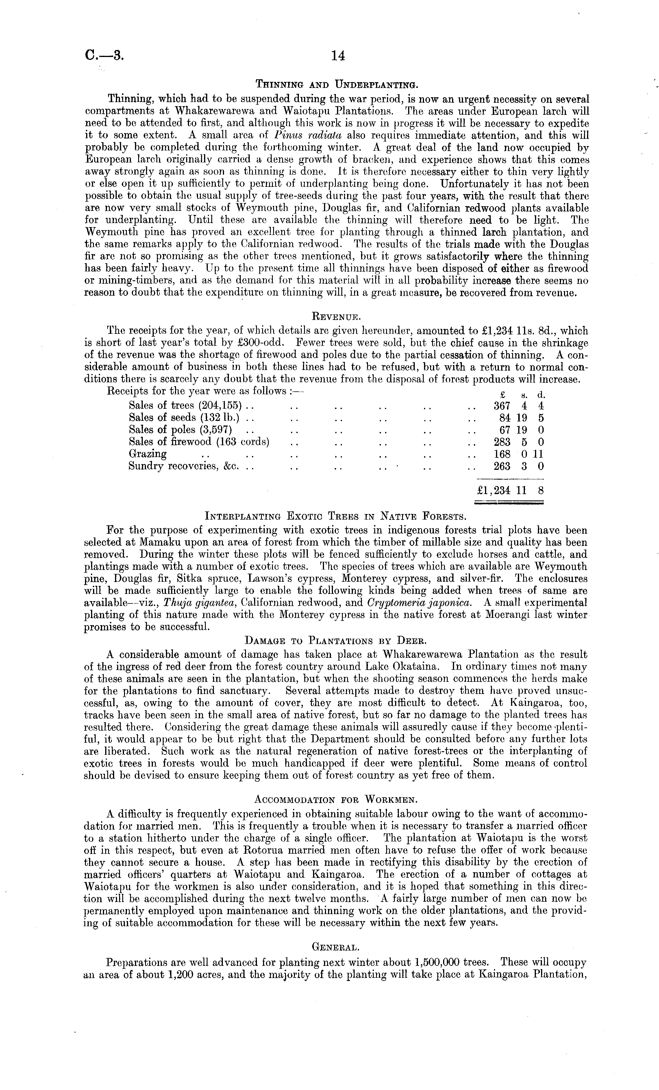 Thinning and Underplanting. Thinning, which had to be suspended during the war period, is now an urgent necessity on several compartments at Whakarewarewa and Waiotapu Plantations. The areas under European larch will need to be attended to first, and although this work is now in progress it will be necessary to expedite it to some extent. A small area of Pinus radiata also requires immediate attention, and this will probably bo completed during the forthcoming winter. A great deal of the land now occupied by European larch originally carried a dense growth of bracken, and experience shows that this comes away strongly again as soon as thinning is done. It is therefore necessary either to thin very lightly or else open it up sufficiently to permit of underplanting being done. Unfortunately it has not been possible to obtain the usual supply of tree-seeds during the past four years, with the result that there are now very small stocks of Weymouth pine, Douglas fir, and Californian redwood plants available for underplanting. Until these are available the thinning will therefore need to be light. The Weymouth pine has proved an excellent tree for planting through a thinned larch plantation, and the same remarks apply to the. Californian redwood. The results of the trials made with the Douglas fir are not so promising as the other trees mentioned, but it grows satisfactorily where the thinning has been fairly heavy. Up to the present time all thinnings have been disposed of either as firewood or mining-timbers, and as the. demand for this material will in all probability increase there seems no reason to doubt that the expenditure on thinning will, in a great measure, be recovered from revenue. Revenue. The receipts for the year, of which details are given hereunder, amounted to £1,234 lis. Bd., which is short of last year's total by £300-odd. Fewer trees were sold, but the chief cause in the shrinkage of the revenue was the shortage of firewood and poles due to the. partial cessation of thinning. A considerable amount of business in both these lines had to be refused, but with a return to normal conditions there is scarcely any doubt that the revenue from the disposal of forest products will increase. Receipts for the year were as follows :— t s (1 Sales of trees (204,155) .. .. .. .. .. .. 367 4 4 Sales of seeds (132 lb.) .. .. .. .. .. .. 84 19 5 Sales of poles (3,597) .. .. .. .. .. .. 67 19 0 Sales of firewood (163 cords) .. - .. .. .. 283 5 0 Grazing .. .. .. .. .. .. .. 168 011 Sundry recoveries, &c. .. .. .. .. ■ .. .. 263 3 0 £1,234 11 8 Interplanting Exotic Trees in Native Forests. For the purpose of experimenting with exotic trees in indigenous forests trial plots have been selected at Mamaku upon an area of forest from which the timber of millable size and quality has been removed. During the winter these plots will be fenced sufficiently to exclude horses and cattle, and plantings made with a number of exotic trees. The species of trees which are available arc Weymouth pine, Douglas fir, Sitka spruce, Lawson's cypress, Monterey cypress, and silver-fir. The enclosures will be made sufficiently large to enable the following kinds being added when trees of same are available—viz., Thuja gigantea, Californian redwood, and Cryptomeria japonica. A small experimental planting of this nature made with the Monterey cypress in the native forest at Mioerangi last winter promises to be successful. Damage to Plantations by Deer. A considerable amount of damage has taken place at Whakarewarewa Plantation as the result of the ingress of red deer from the forest country around Lake Okataina. In ordinary times not many of these animals are seen in the plantation, but when the shooting season commences the herds make for the plantations to find sanctuary. Several attempts made to destroy them have proved unsuccessful, as, owing to the amount of cover, they are most difficult to detect. At Kaingaroa, too, tracks have been seen in the small area of native forest, but so far no damage to the planted trees has resulted there. Considering the great damage these animals will assuredly cause if they become -plentiful, it would appear to be but right that the Department should be consulted before any further lots are liberated. Such work as the natural regeneration of native forest-trees or the interplanting of exotic trees in forests would be much handicapped if deer were plentiful. Some means of control should be devised to ensure keeping them out of forest country as yet free of them. Accommodation for Workmen. A difficulty is frequently experienced in obtaining suitable labour owing to the want of accommodation for married men. This is frequently a trouble when it is necessary to transfer a married officer to a station hitherto under the charge of a single officer. The plantation at Waiotapu is the worst off in this respect, but even at Rotorua married men often have to refuse the offer of work because they cannot secure a house. A step has been made in rectifying this disability by the erection of married officers' quarters at Waiotapu and Kaingaroa. The erection of a number of cottages at Waiotapu for the workmen is also under consideration, and it is hoped that something in this direction will be accomplished during the next twelve months. A fairly large number of men can now be permanently employed upon maintenance and thinning work on the older plantations, and the providing of suitable accommodation for these will be necessary within the next few years. General. Preparations are well advanced for planting next winter about 1,500,000 trees. These will occupy an area of about 1,200 acres, and the majority of the planting will take place at Kaingaroa Plantation,