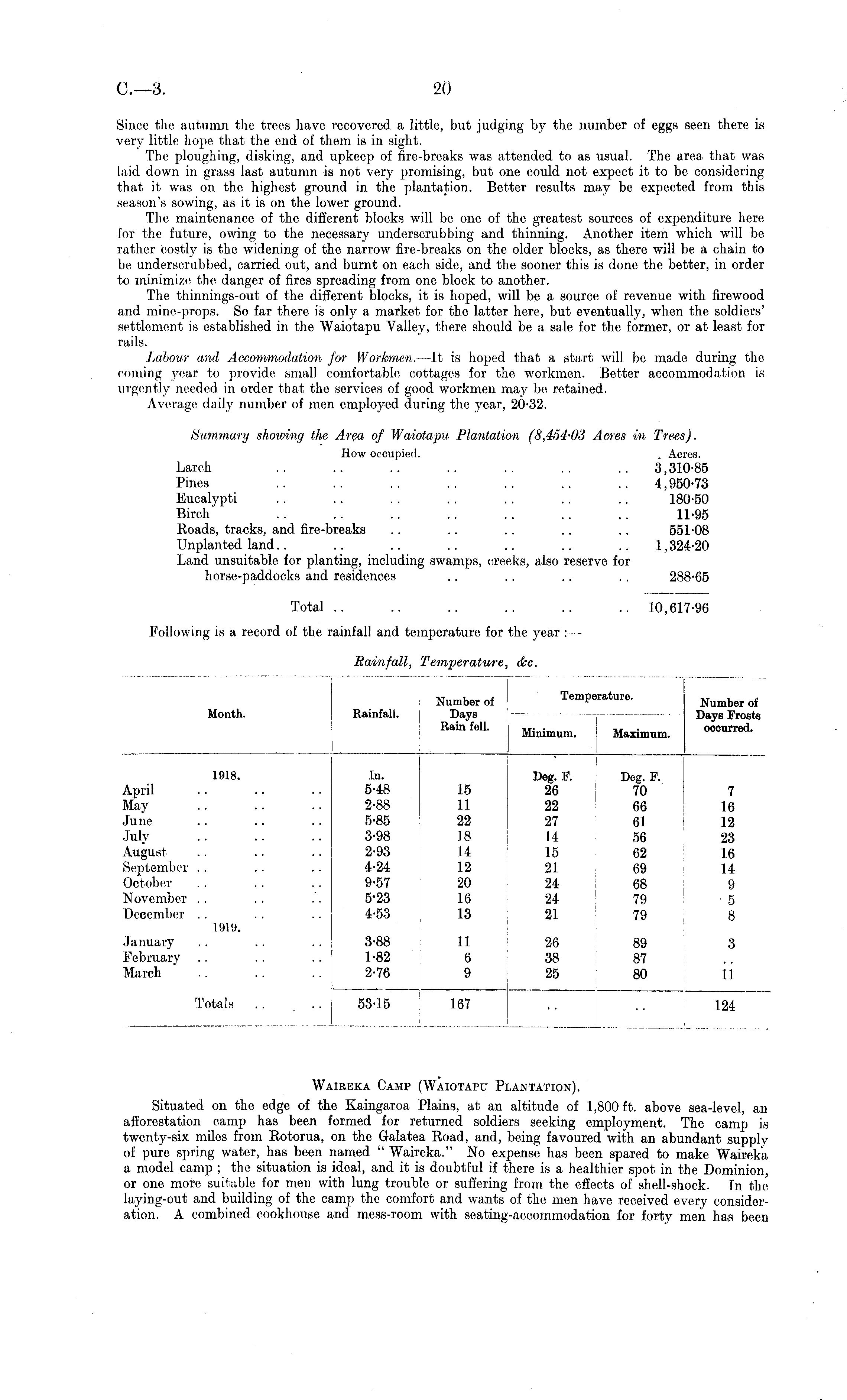 Since the autumn the trees have recovered, a little, but judging by the number of eggs seen there is very little hope that the end of them is in sight. The ploughing, disking, and upkeep of fire-breaks was attended to as usual. The area that was laid down in grass last autumn is not very promising, but one could not expect it to be considering that it was on the highest ground in the plantation. Better results may be expected from this season's sowing, as it is on the lower ground. The maintenance of the different blocks will be one of the greatest sources of expenditure here for the future, owing to the necessary undcrscrubbing and thinning. Another item which will be rather costly is the widening of the narrow fire-breaks on the older blocks, as there will be a chain to be underscrubbed, carried out, and burnt on each side, and the sooner this is done the better, in order to minimize the danger of fires spreading from one block to another. The thinnings-out of the different blocks, it is hoped, will be a source of revenue with firewood and mine-props. So far there is only a market for the latter here, but eventually, when the soldiers' settlement is established in the Waiotapu Valley, there should be a sale for the, former, or at least for rails. Labour and Accommodation for Workmen. —It is hoped that a start will be made during the (•(iming year to provide small comfortable cottages for the workmen. Better accommodation is urgently needed in order that the services of good workmen may be retained. Average daily number of men employed during the year, 20-32. Summary showing the Area of Waiotapu Plantation (8,454-03 Acres in Trees). How occupied. Acres. Larch .. .. .. .. .. .. .. 3,310-85 Pines .. .. .. .. .. .. .. 4,950-73 Eucalypti .. .. .. .. .. .. .. 180-50 Birch .. .. .. .. .. .. .. 11-95 Roads, tracks, and fire-breaks .. .. .. .. .. 551-08 Unplanted land.. .. .. .. .. .. .. 1,324-20 Land unsuitable for planting, including swamps, creeks, also reserve for horse-paddocks and residences .. .. .. .. 288-65 Total .. .. .. .. .. .. 10,617-96 Following is a record of the rainfall and temperature for the year : —