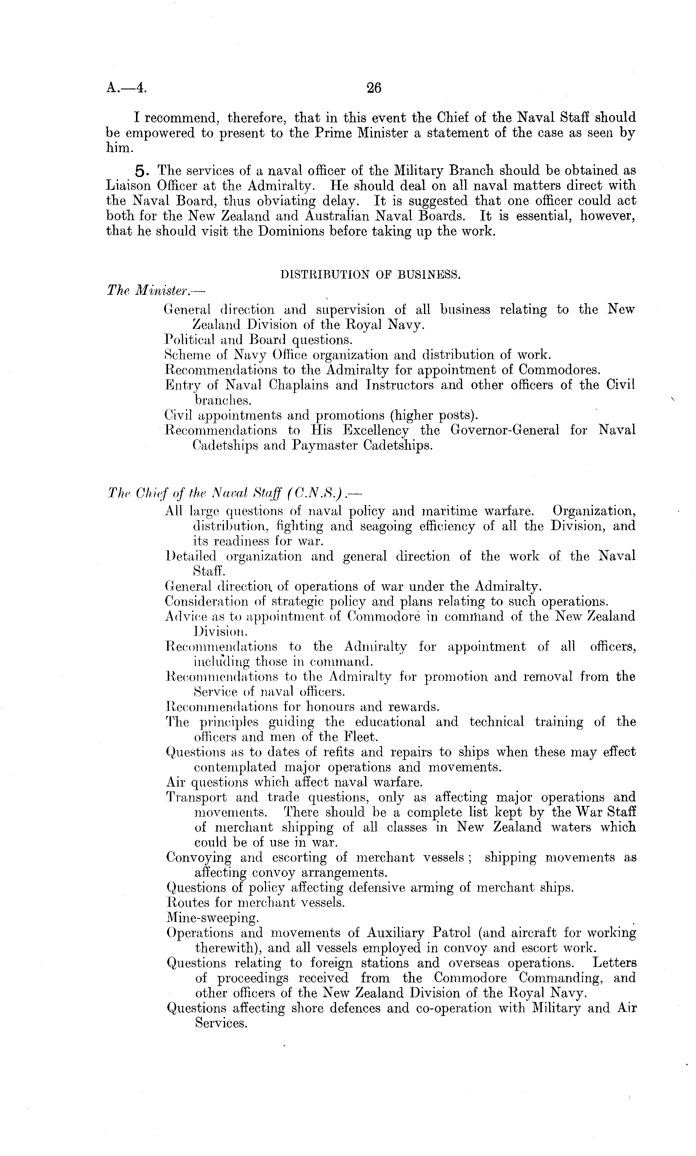 I recommend, therefore, that in this event the Chief of the Naval Staff should be empowered to present to the Prime Minister a statement of the case as seen by him. 5- The services of a naval officer of the Military Branch should be obtained as Liaison Officer at the Admiralty. He should deal on all naval matters direct with the Naval Board, thus obviating delay. It is suggested that one officer could act both for the New Zealand and Australian Naval Boards. It is essential, however, that he should visit the Dominions before taking up the work. DISTRIBUTION OF BUSINESS. The Minister. — General direction and supervision of all business relating to the New Zealand Division of the Royal Navy. Political and Board questions. Scheme of Navy Office organization and distribution of work. Recommendations to the Admiralty for appointment of Commodores. Entry of Naval Chaplains and Instructors and other officers of the Civil branches. Civil appointments and promotions (higher posts). Recommendations to His Excellency the Governor-General for Naval Cadetships and Paymaster Cadetships. The Chief of the Naval Staff (C.N.S.) .— All large questions of naval policy and maritime warfare. Organization, distribution, fighting and seagoing efficiency of all the Division, and its readiness for war. Detailed organization and general direction of the work of the Naval Staff. General direction, of operations of war under the Admiralty. Consideration of strategic policy and plans relating to such operations. Advice as to appointment of Commodore in command of the New Zealand Division. Recommendations to the Admiralty for appointment of all officers, including those in command. Recommendations to the Admiralty for promotion and removal from the Service of naval officers. Recommendations for honours and rewards. The principles guiding the educational and technical training of the officers and men of the Eleet. Qtiestions as to dates of refits and repairs to ships when these may effect contemplated major operations and movements. Air questions which affect naval warfare. Transport and trade questions, only as affecting major operations and movements. There should be a complete list kept by the War Staff of merchant shipping of all classes in New Zealand waters which could be of use in war. Convoying and escorting of merchant vessels ; shipping movements as affecting convoy arrangements. Questions of policy affecting defensive arming of merchant ships. Routes for merchant vessels. Mine-sweeping. Operations and movements of Auxiliary Patrol (and aircraft for working therewith), and all vessels employed in convoy and escort work. Questions relating to foreign stations and overseas operations. Letters of proceedings received from the Commodore Commanding, and other officers of the New Zealand Division of the Royal Navy. Questions affecting shore defences and co-operation with Military and Air Services.