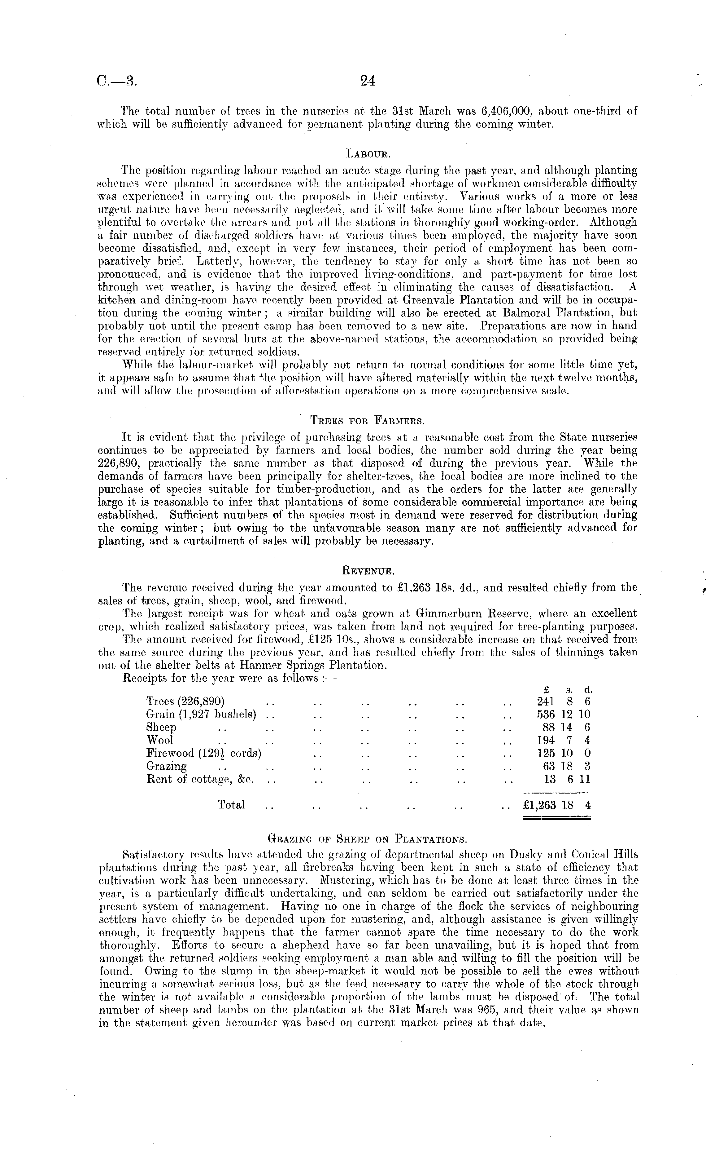 The total number of trees in the nurseries at the 31st March was 6,406,000, about one-third of which will be sufficiently advanced for permanent planting during the coming winter. Labour. The position regarding labour reached an. acute stage during the past year, and although planting schemes were planned in accordance with the anticipated shortage of workmen considerable difficulty was experienced in carrying out the proposals in their entirety. Various works of a, more or less urgent nature have been necessarily neglected, and. it will take some time after labour becomes more plentiful to overtake the arrears and put all the stations in thoroughly good working-order. Although a fair number of discharged soldiers have at various times been employed, the majority have soon become dissatisfied, and, except in very few instances, their period of employment has been comparatively brief. Latterly, however, the tendency to stay for only a short time has not been so pronounced, and is evidence that the improved iiving-conditions, and part-payment for time lost through wet weather, is having the desired effect in eliminating the causes of dissatisfaction. A kitchen and dining-room have, recently been provided at Greenvale Plantation and will be in occupation during the coming winter ; a similar building will also be erected at Balmoral Plantation, but probably not until the present camp has been removed to a new site. Preparations are now in hand for the erection of several, huts at the above-named stations, the accommodation so provided being reserved entirely for returned soldiers. While the labour-market will probably not return to normal conditions for some little time yet, it appears safe to assume that the position will have altered materially within the next twelve months, and will allow the prosecution of afforestation operations on a. more comprehensive scale. Trees for Farmers. It is evident that the privilege of purchasing trees at a reasonable cost from the State nurseries continues to be appreciated by farmers and local bodies, the number sold during the year being 226,890, practically the same number as that disposed of during the previous year. While the demands of farmers have been principally for shelter-trees, the local bodies are more inclined to the purchase of species suitable for timber-production, and as the orders for the latter are generally largo it is reasonable to infer that plantations of some considerable cominercial importance are being established. Sufficient numbers of the species most in demand were reserved for distribution during the coming winter; but owing to the unfavourable, season many are not sufficiently advanced for planting, and a curtailment of sales will probably be necessary. Revenue. The revenue received during the yoar amounted to £1,263 18s. 4d., and resulted chiefly from the sales of trees, grain, sheep, wool, and firewood. The largest receipt was for wheat and oats grown at Gimmerburn Reserve, where an excellent crop, which realized satisfactory prices, was taken from land not required for tree-planting purposes. The amount received for firewood, £1.25 10s., shows a considerable increase on that received from the same source during the previous year, and has resulted chiefly from the, sales of thinnings taken out of the shelter belts at Hanmer Springs Plantation. Receipts for the year were as follows : — £ s. d. Trees (226,890) .. .. .. .. .. .. 241 8 6 Grain (1,927 bushels) .. .. .. .. .. .. 536 12 10 Sheep .. .. .. .. .. .. .. 88 14 6 Wool .. .. .. .. .. .. .. 194 7 4 Firewood (129-| cords) .. .. . . .. .. 125 10 0 Grazing .". .. .. .. .. .. .. 63 1.8 3 Rent of cottage, &c. .. .. .. .. .. .. 13 611 Total .. .. .. ... .. .. £1,263 18 4 Grazing op Sheep on Plantations. Satisfactory results have attended the grazing of departmental sheep on Dusky and Conical Hills plantations during the past year, all firebreaks having been kept in such a state of efficiency that cultivation work has been unnecessary. Mustering, which has to be done at least three times in the year, is a particularly difficult undertaking, and can seldom be carried out satisfactorily under the present system of management. Having no one in charge of the flock the services of neighbouring settlers have chiefly to be depended upon for mustering, and, although assistance is given willingly enough, it frequently happens that the farmer cannot spare the time necessary to do the work thoroughly. Efforts to secure a shepherd have so far been unavailing, but it is hoped that from amongst the returned soldiers seeking employment a man able and willing to 611 the position will be found. Owing to the slump in the sheep-market it would not be possible to sell the ewes without incurring a, somewhat serious loss, but as the feed necessary to carry the whole of the stock through the, winter is not available a, considerable proportion of the lambs must be disposed of. The total number of sheep and lambs on the plantation at the 31st March was 965, and their value as shown in the statement given hereunder was based on current market prices at that date,