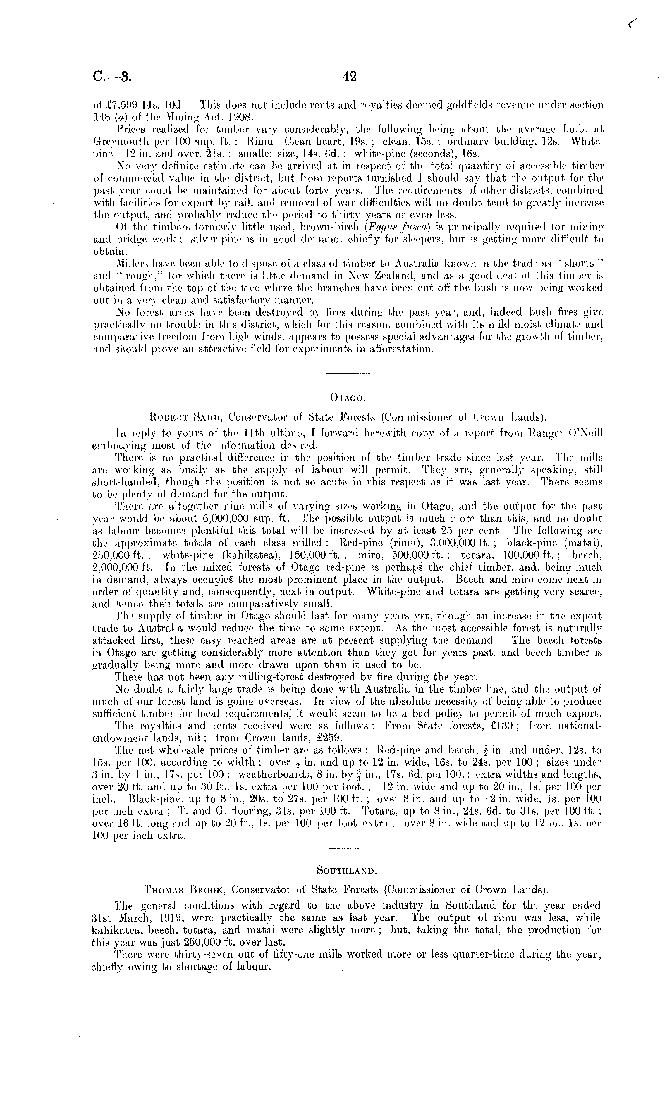 of £7,599 14s. Kid. This does not include rents and royalties deemed goldfields revenue under section 148 (a) of the Mining Act, 1908. Prices realized for timber vary considerably, the following being about the average f.o.b. at. Greymouth per 100 sup. ft. : Rimu Clean heart, 19s. ; clean, 15s. ; ordinary building, 12s. Whitepine 1.2 in. and over, 21s. ; smaller size, 14s. 6d. ; white-pine (seconds), 16s. No very definite estimate can be arrived at in respect of the total quantity of accessible timber of commercial value in the district, but from reports furnished 1 should say that the output for the past year could bo maintained for about forty years. The requirements of other districts, combined with facilities for export by rail, and removal of war difficulties will no doubt tend to greatly increase the output, and probably reduce the period to thirty years or even less. Of the timbers formerly little used, brown-birch (Fagus fusoa) is principally required for mining and bridge work ; silver-pine is in good demand, chiefly for sleepers, but is getting more difficult to obtain. Millers have been able to dispose of a class of timber to Australia known in the trade as " shorts " and " rough," for which there is little demand in New Zealand, and as a good, deal of this timber is obtained from the top of the tree where the branches have been cut off the bush is now being worked out in a very clean and satisfactory manner. No forest areas have been destroyed by fires during the past year, and, indeed bush fires give practically no trouble in this district,, which for this reason, combined with its mild moist climate and comparative freedom from high winds, appears to possess special advantages for the growth of timber, and should prove an attractive field for experiments in afforestation. O'l'AGO. Robert Saijjj, Conservator of State Forests (Commissioner of Crown Lauds). In reply to yours of the I lth ultimo, 1 forward herewith copy of a report from Hanger O'Neill embodying most of the information desired. There is no practical difference in tlie position of the timber trade since last year. The mills are working as busily as the supply of labour will permit. They are, generally speaking, still short-handed, though the position is not so acute in this respect as it was last year. There seems to be plenty of demand for the output. There are altogether nine mills of varying sizes working in Otago, and the output, for the past year would be about 6,000,000 sup. ft. The possible output is much more than this, and no doubt as labour becomes plentiful this total will be increased by at least 25 per cent. The following arc the approximate totals of each class milled: Red-pine (rimu), 3,000,000ft.; black-pine (matai), 250,000 ft.; white-pine (kahikatea), 150,000 ft.; miro, 500,000 ft.; totara, 100,000 ft.; beech, 2,000,000 ft. In the mixed forests of Otago red-pine is perhaps the chief timber, and, being much in demand, always occupies the most prominent place in the output. Beech and miro come next in order of quantity and, consequently, next in output. White-pine and totara are getting very scarce, and hence their totals are comparatively small. The supply of timber in Otago should last for many years yet, though an increase in the export trade to Australia would reduce the time to some extent. As the most accessible forest is naturally attacked first, these easy reached areas are at present supplying the demand. The beech forests in Otago are getting considerably more attention than they got for years past, and beech timber is gradually being more and more drawn upon than it used to be. There has not been any milling-forest destroyed by fire during the year. No doubt a fairly large trade is being done with Australia in the timber line, and the output of much of our forest land is going overseas. In view of the absolute necessity of being able to produce sufficient timber for local it would seem to be a bad policy to permit of much export. The royalties and rents received were as follows : From State forests, £130 ; from nationalendowment lands, nil ; from Crown lands, £259. The. net wholesale prices of timber are as follows : Red-pine and beech, k in. and under, 12s. to 15s. per 100, according to width ; over .1 in. and up to 12 in. wide, 16s. to 245. per 100 ; sizes under 3 in. by I in., 17s. per 100 ; weatherboards, 8 in. by § in., 17s. 6d. per 100.; extra widths and lengths, over 20 ft. and up to 30 ft., Is. extra per 100 per foot. ; 12 in. wide and up to 20 in., Is. per 100 per inch. Black-pine, up to 8 in., 20s. to 275. per 100 ft. ; over 8 in. and up to 12 in. wide, Is. per iOO per inch extra ;T. and G. flooring, 31s. per 100 ft. Totara, up to 8 in., 245. 6d. to 31s. per 100 ft. ; over 16 ft. long and up to 20 ft., Is. per 100 per foot extra,; over 8 in. wide and up to 12 in., Is. per 100 per inch extra. Southland. Thomas Brook, Conservator of State. Forests (Commissioner of Crown Lands). The general conditions with regard to the above industry in Southland for the year ended 31st March, 1919, were practically the same as last year. The output of rimu was less, while kahikatea, beech, totara, and matai were slightly more ; but, taking the total, the production for this year was just 250,000 ft. over last. There were thirty-seven out of fifty-one mills worked more or less quarter-time during the year, chiefly owing to shortage of labour.