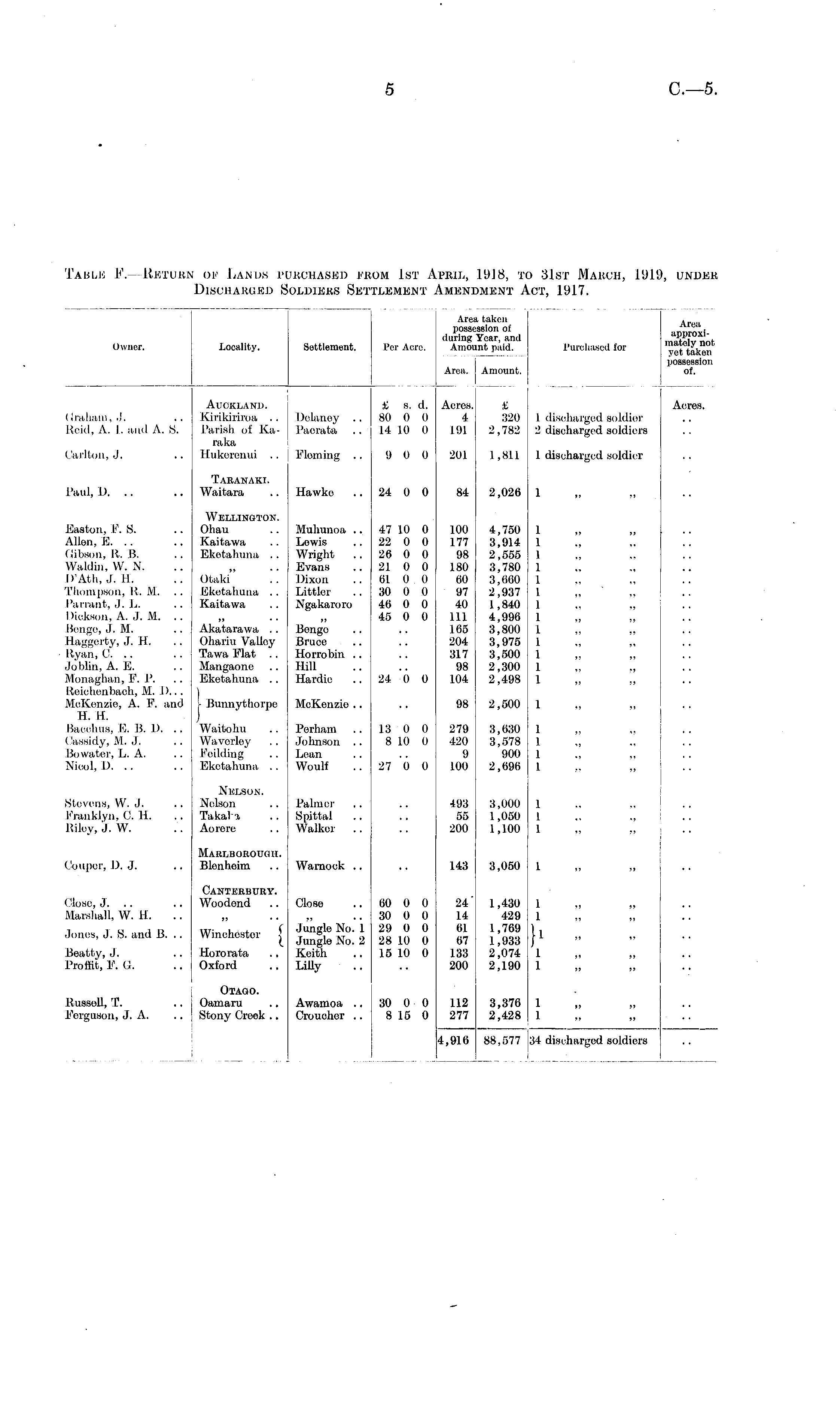 Table F. —Return of Lands purchased from 1st April, 1918, to 31st March, 1919, under Discharged Soldiers Settlement Amendment Act, 1917.