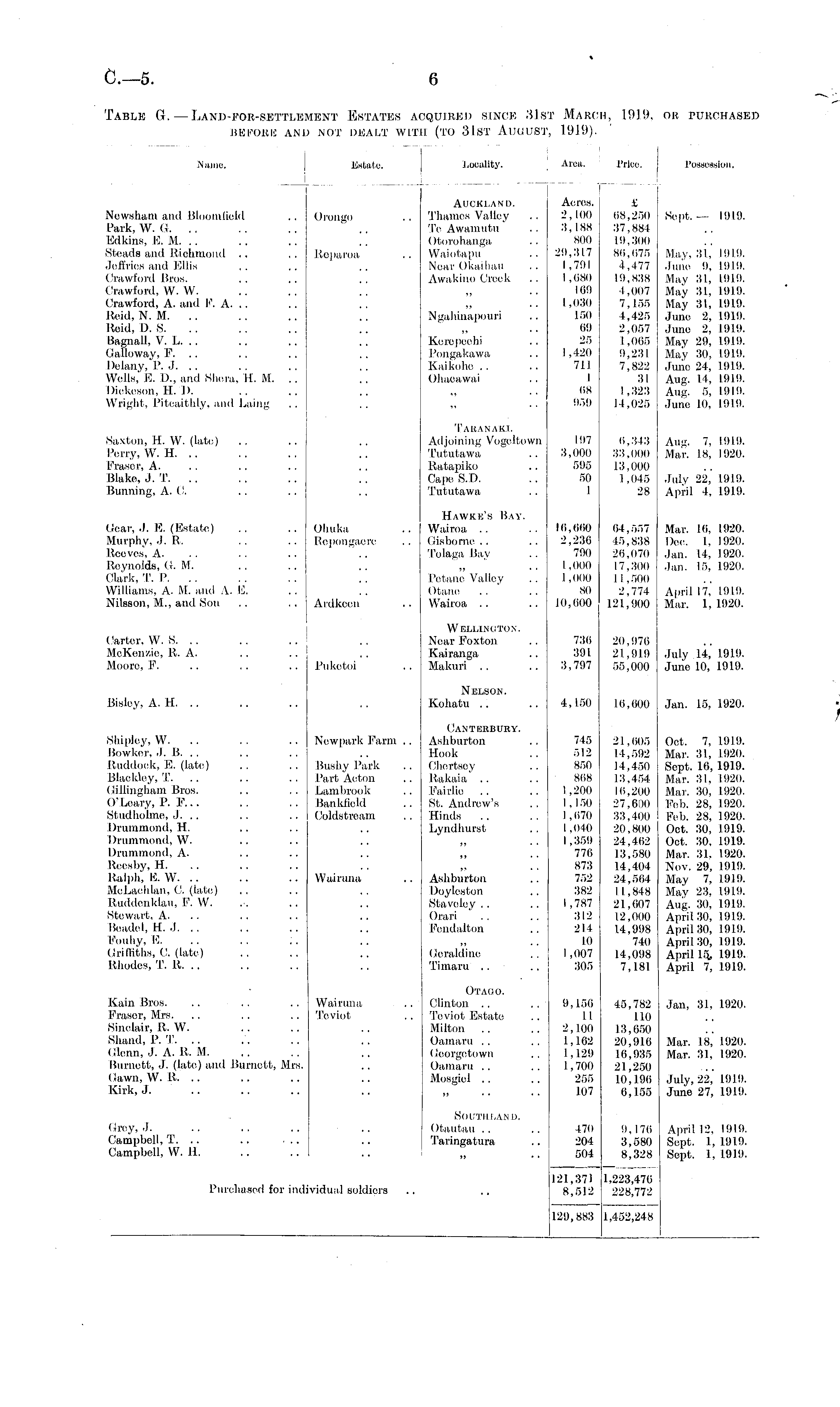 Name. Estate. Locality. Area. Price. Possession. Newsham and Bloomlielil Park, W. G. .. Edkins, E. M. .. Steads and Richmond .. Jeffries and Ellis Crawford Bros. Crawford, W. W. ('rawford, A. and F. A. .. Reid, N. M. Reid, D. S. Bagnall, V. L. . . Galloway, F. .. Dolany,"P. J. .. Wells, E. 1)., and Shera, H. M. .. Diokeson, H. J). Wright, Piteaitlily, and Laiug Orongo Reparoa Auckland. Thames Valley Te Awaniutu Otorohanga Waiotap. Near Okailuiu Awakino (Iroek Ngahinapouri Acres. 2,100 3. 188 800 29,317 I , 791 I ,680 169 I ,030 150 69 23 1,120 711 I 68 959 £ 68,250 37,884 19,300 86,675 4,477 19,838 4,007 7,155 4,425 2,057 1,065 9,231 7,822 31 1,323 14,025 Sc pi. 1919. May, 31, 1919. June 9, 1919. May 31, 1919. May 31, 1919. May 31, 1919. June 2, 1919. June 2, 1919. May 29, 1919. May 30, 1919. June 24, 1919. Aug. 14, 1919. Aug. 5, 1919. June io. 1919. Korcpcehi Pongakawa Kaikohe Ohacawai Saxton, li. W. (late) Perry, W. H. .. Eraser, A. Blake, J. T. Bunning, A. C. Taranaki. Adjoining Vogeltown Tututawa Ratapiko CapeS.D. Tututawa 197 3,000 595 50 1 6,343 33,000 13,000 1,045 28 Aug. 7, 1919. Mar. 18, 1920. July 22,' 1919. April 4, 1919. Gear, J. E. (Estate) Murphy, J. R. Reeves, A. Reynolds, (i. M. Clark, T. P. .. Williams, A. M. and A. E, Nilsson, M., and Son Ohuka Ropongaere Hawke's Bay. Wairoa Gisborne Tolaga Bay 16,660 2.236 790 I ,000 1,000 so 10,600 64.557 46,838 26,070 17,300 I 1,500 2,774 121,900 Mar. 16. 1920. Dec. 1, 1920. Jan. 14, 1920. Jan. 15, 1920. Ardkeen Petane Valley Otane Wairoa. April 17. 1919. Mar. 1, 1920. Carter, W. S. .. McKenzie, R. A. Moore, F. Wellington. Near Foxton Kairanga Makuri . . 736 391 3,797 20,976 21,919 55,000 July II, 1919. June 10, 1919. Puketoi Bisley, A. H. .. Nelsom. Kohatu . . 4,150 16,600 Jan. 15. 1920. Shipley, W. .. Bowker, J. B. Ruddock, E. (late) Blaciaey. T. Gillingham Bros. O'Leary, P. F... Studholme, J. .. Drummond, H. Drummond, W. Drummond, A. Rcesby, H. Ralph', ... W. .. Me Each Ian, C. (late) Ruddenklau, F. W. Stewart, A. Beadcl, E. J. .. Fiiuhy, E_. Griffiths, ('. (late) Rhodes, T. R. .. Newpark Farm .. Bushy Park Part Acton Lambrook Bankfield Coldstream ( 'anterbury. Ashburton Hook Chertsey Rakaia Fair-lie St. Andrew's Hinds Eyndhurst 745 512 850 SOS I ,200 1,150 1,670 1.010 I , 359 776 873 752 3S2 1,787 312 214 10 1,007 305 21,605 I 1,592 14,450 13,454 16,200 27,690 33,400 20.800 24,462 13.580 I I. 101 24,564 I I,848 21,607 12,000 14,998 740 14,098 7,181 Oct. 7. 1919. Mar. 31, 1920. Sept. 16, 1919. Mar. 31, 1920. Mar. 30, 1920. Feb. 28, 1920. Fell. 28, 1920. Oct. 30, 1919. Oct. 30, 1919. Mar. 31. 1920. Nov. 29, 1919. May 7, 1919. May 23, 1919. Aug. 30. 1919. April 30, 1919. April 30, 1919. April 30, 1919. April 15. 1919. April 7, 1919. Wairuna Ashburton Doyleston Stavcley Orari Fendalton Geraldine Timaru Kain Bros. .. . . Eraser, Mrs. Sinclair, R. W. Shaud, P. T. .. Glenn, J. A. R. M. Burnett, J. (late) and Burnett, Mrs. (lawn, W. R. .. Kirk, J. Wairuna Toviot Otago. Clinton Teviot Estate Milton Oamarn Georgetown Oamarn Mosgiel . . 9,156 I I 2,100 1,162 1,129 1,700 255 107 45,782 110 13,650 20,916 16,935 21,250 10,196 6,155 Jan, 31, 1920. Mar. 18, 1920. Mar. 31, 1920. July, 22, 1.919. June 27, 1919. Grey, J. Campbell, T. .. .. , .. Campbell, W. H. SoUTHLAN I). Otautau Taringatura 170 204 504 9, 176 3,580 8,328 April 12. 1919. Sept. I, 1919. Sept. 1, 1919. Purchased for iru.li vidua! soldiers 121.371 8,512 1,223,476 228,772 129,883 1,452,248