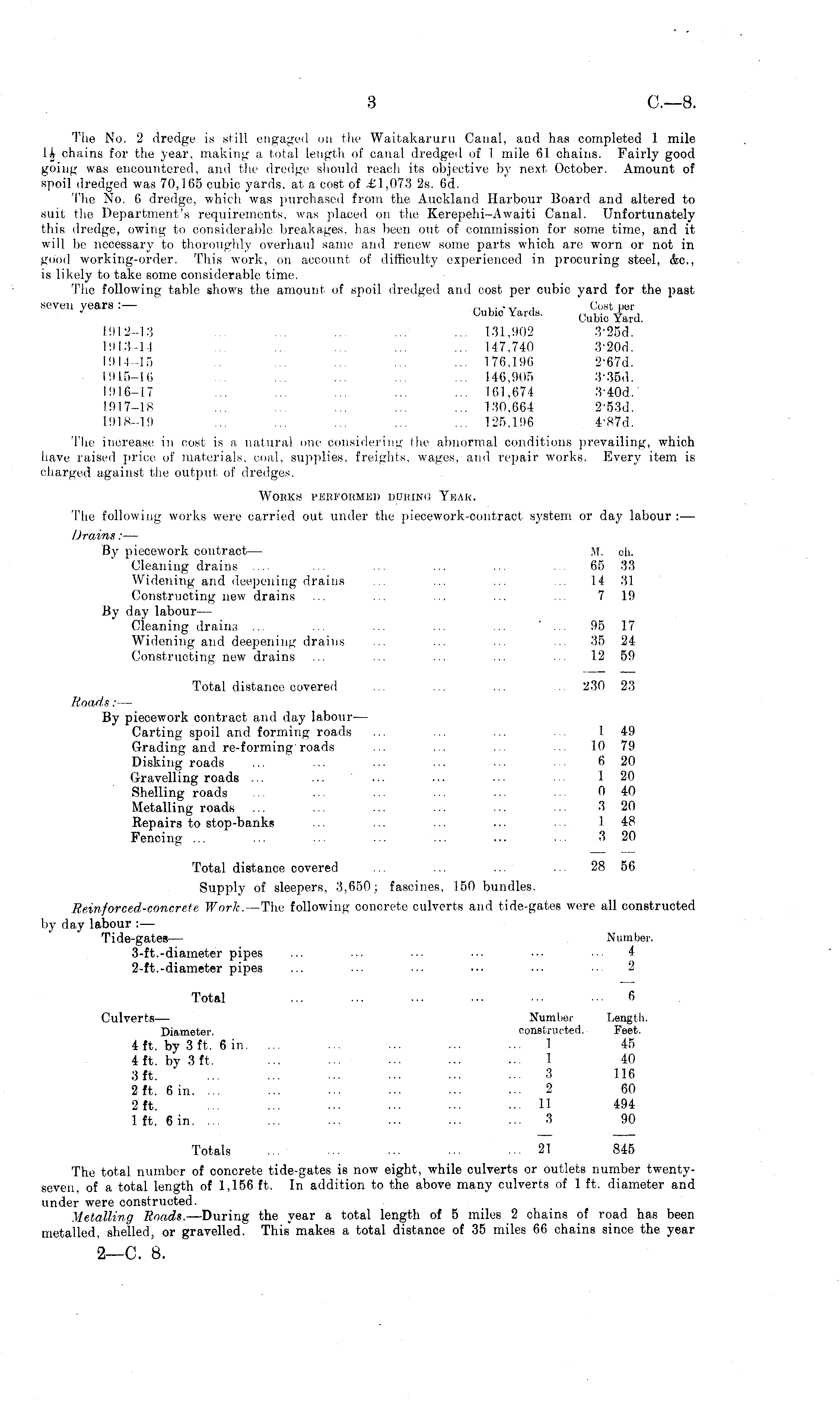 The No. 2 dredge is still engaged on tin- Waitakaruru Canal, and has completed 1 mile 1A chains for the year, making a total length of canal dredged of I mile 61 chains. Fairly good going was encountered, and the dredge should reach its objective by next October. Amount of spoil dredged was 70,165 cubic yards, at a cost of £1,073 2s. 6d. The No. 6 dredge, which was purchased from the Auckland Harbour Board and altered to suit the Department's requirements, was placed on the Kerepehi—Awaiti Canal. Unfortunately this dredge, owing to considerable breakages, has been out of commission for some time, and it will be necessary to thoroughly overhaul same and renew some parts which are worn or not in good working-order. This work, on account of difficulty experienced in procuring steel, &c, is likely to take some considerable time. The following table shows the amount of spoil dredged and cost per cubic yard for the past seven years : — ~ , . ... , Cost per Cubic Yards. Cubio ard 1912-13 ... 131,902 3'25d. 1913-14 ... ... 147,740 3-20,1. 1914-15 ... 176,196 2'67d. 1915-16 ... ... ... 146,905 3-35 d. 1916-17 ... ... ... ... ... 161.671 3'4od.' 1917-18 ... ... ... ... ... 130,664 2'53d. 191,8.-H) ... ... ... ... ... 125,196 4'B7d. The increase in cost is a natural one considering the abnormal conditions prevailing, which have raised price, of materials, coal, supplies, freights, wages, and repair works. Every item is charged against the output of dredges. Works performed during Year. The following works were carried out under the piecework-contract system or day labour : — Drains: — By piecework contract — M. eh. Cleaning drains ... ... ... ... ... 65 33 Widening and deepening drains ... ... ... ... 14 31 Constructing new drains ... ... ... ... ... 7 19 By day labour— Cleaning drains ... ... ... ... ... ... 95 17 Widening and deepening drains ... ... ... ... 35 24 Constructing new drains ... ... ... ... ... 12 59 Total distance covered ... ... ... ... 230 23 Roads: — By piecework contract and day labour — Carting spoil and forming roads ... ... ... I 49 Grading and re-forming" roads ... ... ... 10 79 Disking roads ... ... ... ... ... ... 6 20 Gravelling roads ... ... ... ... ••■ ... 1 20 Shelling roads ... ... ... ... ... ... 0 40 Metalling roads ... ... ... ... ... ■. 3 20 Repairs to stop-banks ... ... ... ... ... 1 48 Fencing ... ... ... ... ... ... ... 3 20 Total distance covered ... ... ... ... 28 56 Supply of sleepers, 3,650; fascines, 150 bundles. Reinforced-concrete Work. —The following concrete culverts and tide-gates were all constructed by day labour: — Tide-gates— Number. 3-ft.-diameter pipes ... ... ... ... •■• ... 4 2-ft.-diameter pipes ... ... ... ... ... • •■ 2 Total ... ... ... ... ... .. 6 Culverts— Number Length. Diameter. constructed. Feet4ft. by 3ft. 6 in. ... ... ... ... ... 1 45 4ft. by 3ft. ... ... ... ... ... 1 40 3ft ?> H6 2ft. 6in. ... ... ... ... ... ... 2 60 2ft ... ... ... ... •■■ •■■ 11 494 lft. 6in. ... ... ... ... ... ... 3 90 Totals 21 845 The total number of concrete tide-gates is now eight, while culverts or outlets number twentyseven, of a total length of 1,156 ft. In addition to the above many culverts of 1 ft. diameter and under were constructed. Metalling Roads. —During the year a total length of 5 miles 2 chains of road has been metalled, shelled, or gravelled. This makes a total distance of 35 miles 66 chains since the year