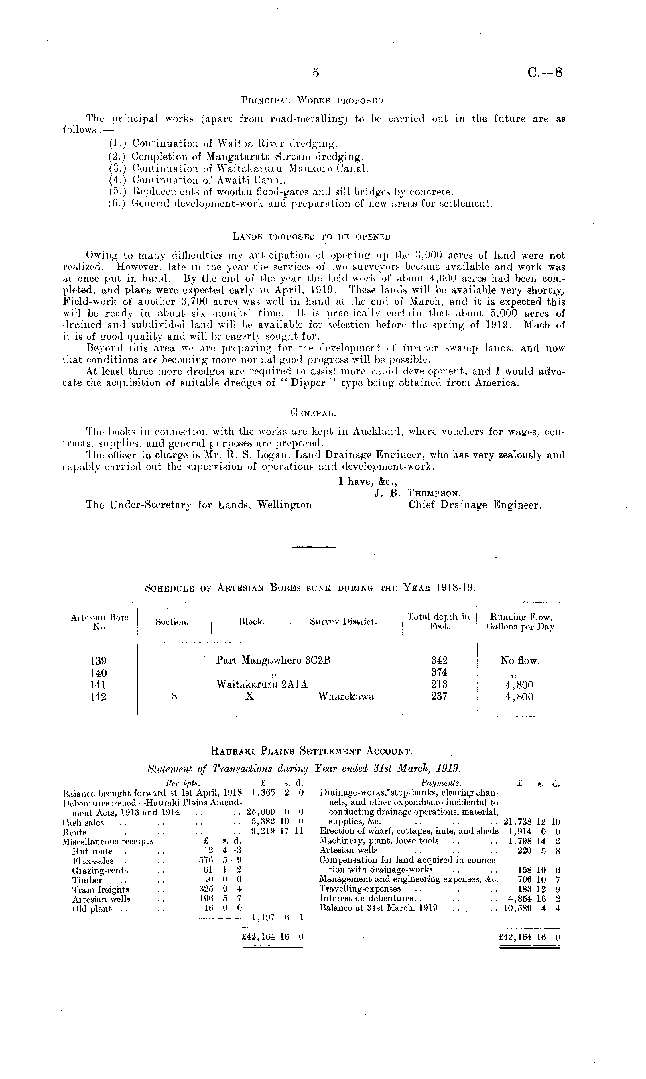 Principal Works proposed, The prinoipal works (apart from road-metalling) to be carried out in the future are as follows :— (1.) Continuation of Waitoa River dredging. (2.) Completion of Mangatarata Stream dredging. (3.) Continuation of Waitakaruru-Mnukoro Canal. (4.) Continuation of Awaiti ('anal. (5.) Replacements of wooden flood-gates and sill bridges by concrete, (6.) General development-work and preparation of new areas for settlement. Lands proposed to be opened. Owing to inanj' difficulties my anticipation of opening up the 3,000 aores of laud were not realized. However, late in the year the services of two surveyors became available and work was at once put in hand. By the end of the year the field-work of about 4,000 acres had been completed, and plans were expected early in April. 1919. These lands will be available very shortly,. Field-work of another 3,700 acres was well in hand at the end of March, and it is expected this will be ready in about six months' time. It is practically certain that about 5,000 acres of drained and subdivided land will be available for selection before the spring of 1919. Much of it, is of good quality and will be eagerly sought for. Beyond this area we are preparing for the development of further swamp lands, and now that conditions are becoming more normal good progress will be possible. At least three more dredges are required to assist, more rapid development, and I would advocate the acquisition of suitable dredges of " Dipper " type being obtained from America. General. The books in connection with the works are kept in Auckland, where vouchers for wages, contracts, supplies, and general purposes are prepared. The officer in charge is Mr. R. S. Logan, Land Drainage Engineer, who has very zealously and capably carried out the supervision of operations and development-work. I have, &c, J. B. Thompson, The Under-Secretary for Lands. Wellington. Chief Drainage Engineer.